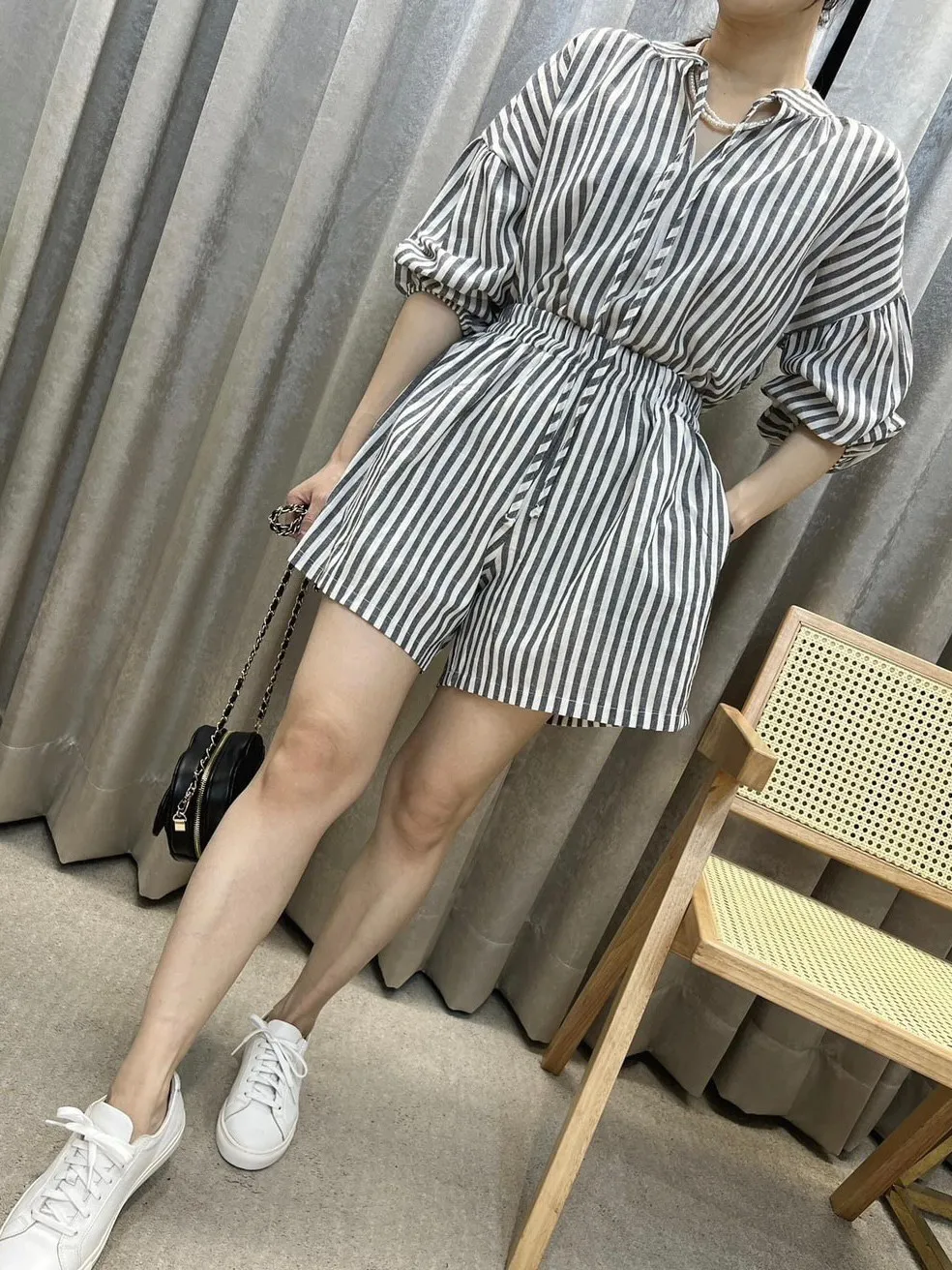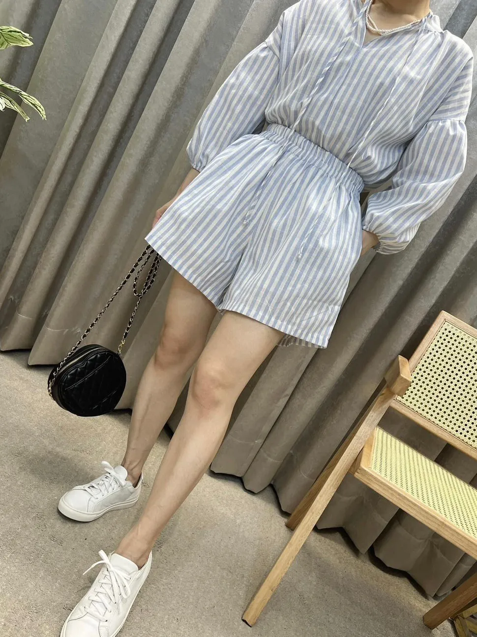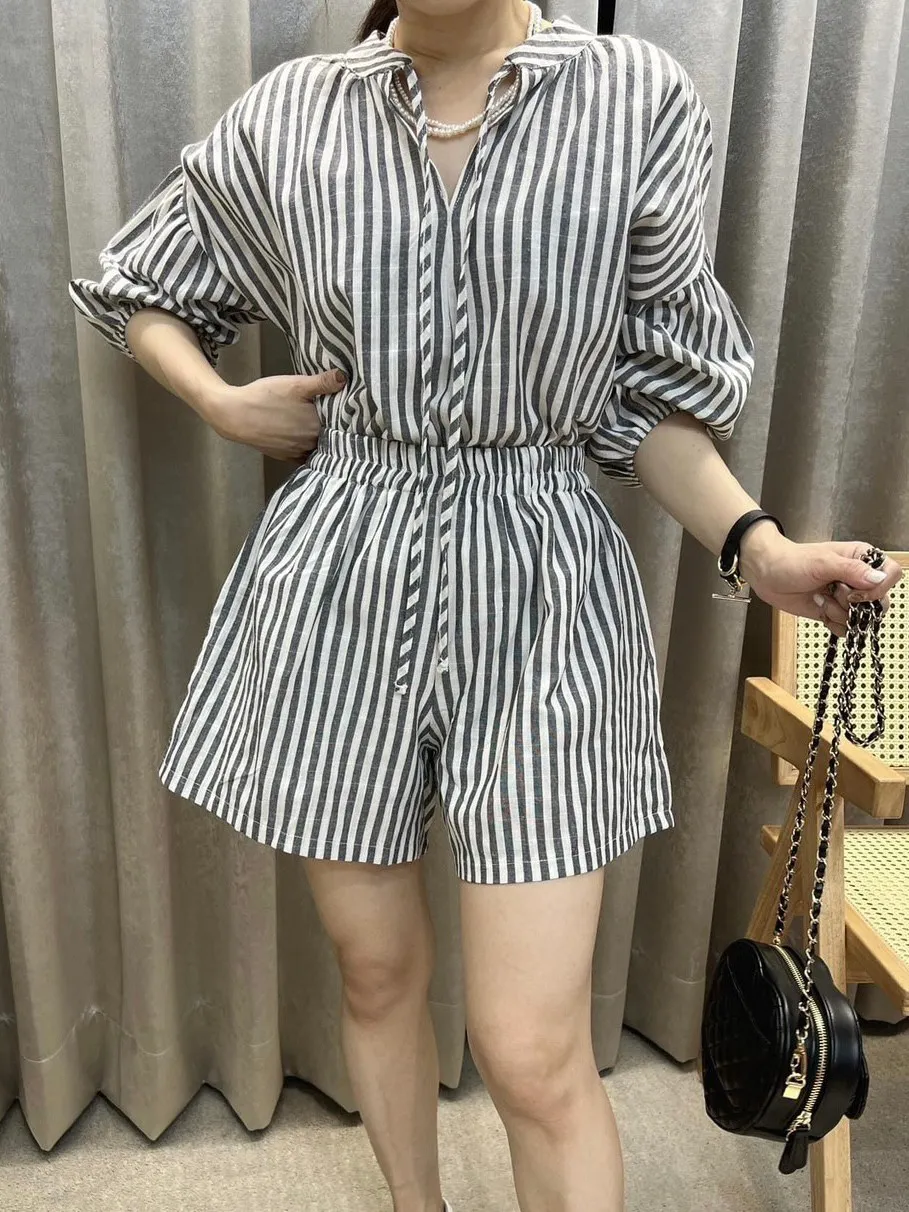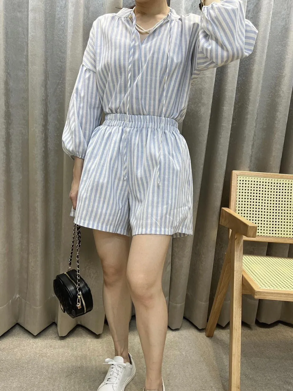 現貨最後一件售完不補★ 條紋棉麻短褲兩件式套裝 (完售不補)
