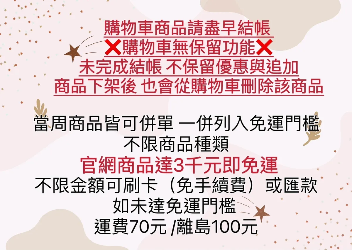 滿3000元免運 不限金額門檻皆可刷卡付款請以[指定期限內]完成結帳填單購物車未成立訂單=不保留優惠價&限量名額資格商品加入購物車後 請盡速完成填單&付款逾時填單則會恢復原價 或提前完售請盡早填單付款 😊