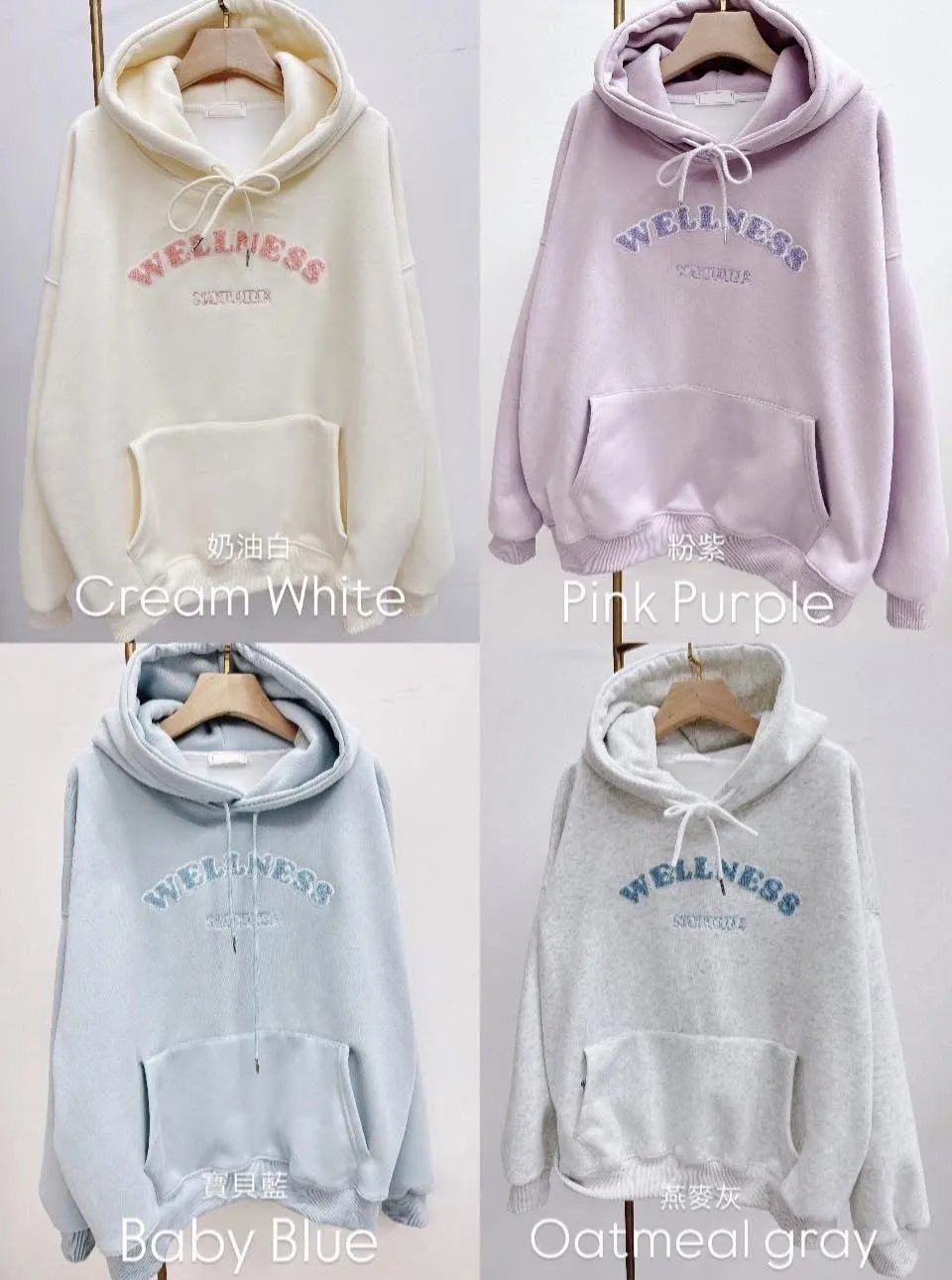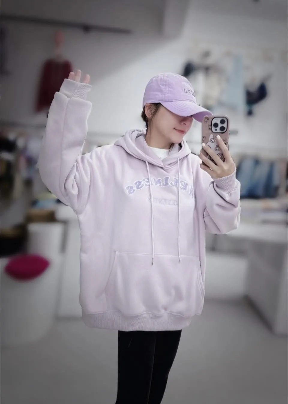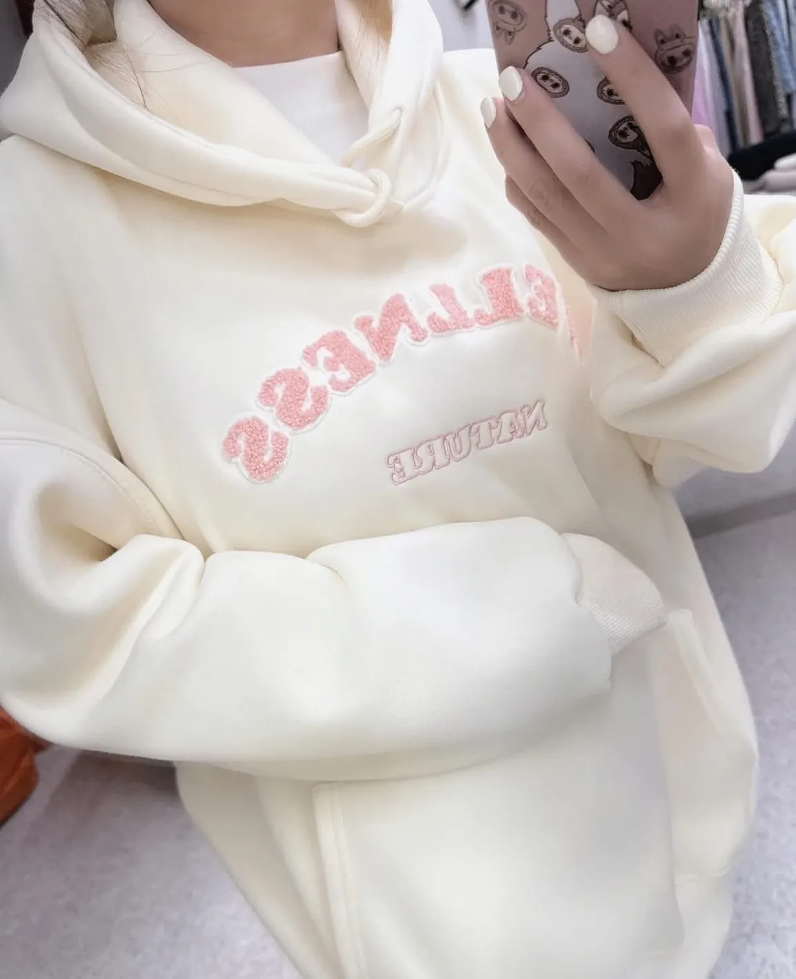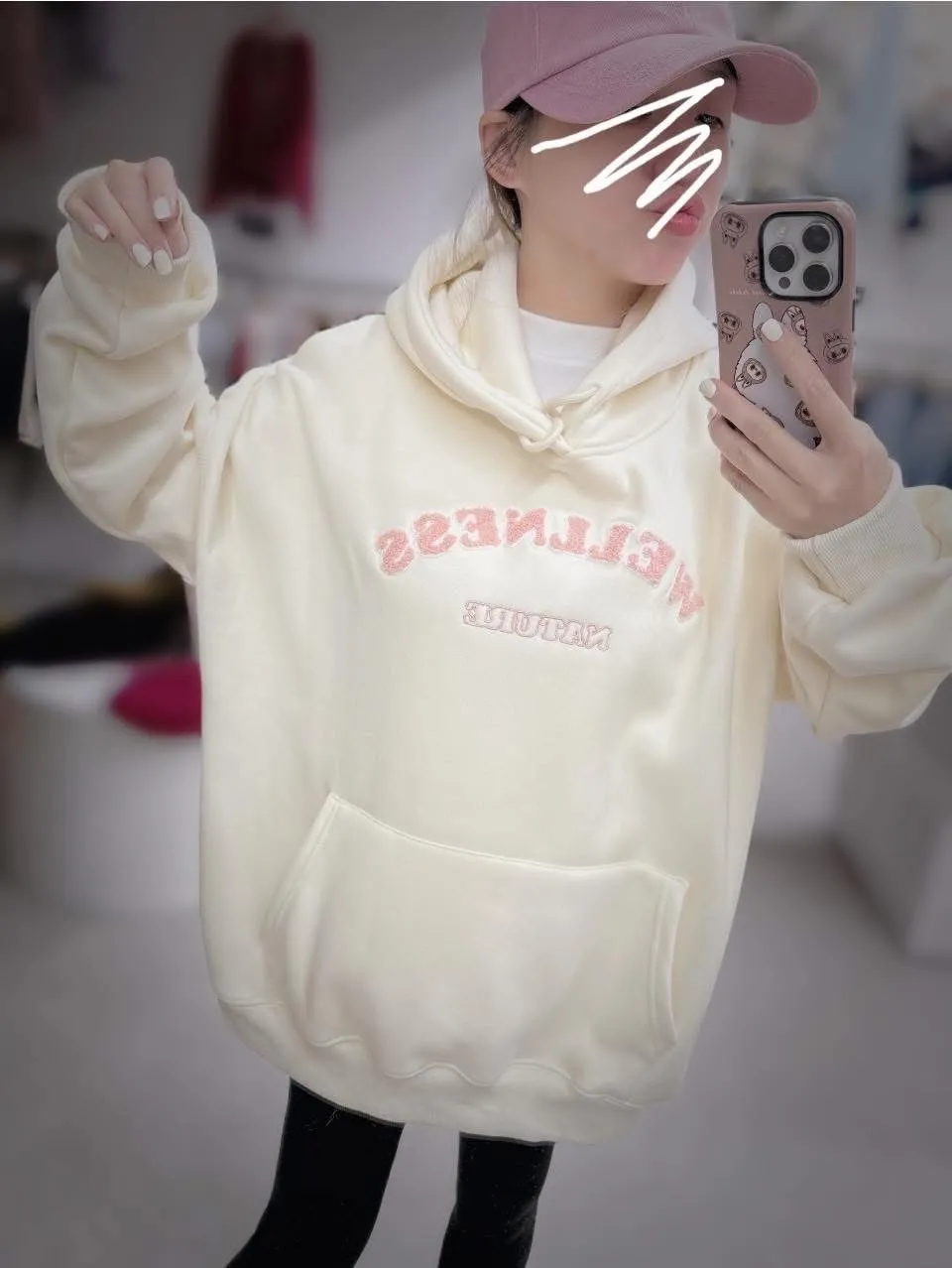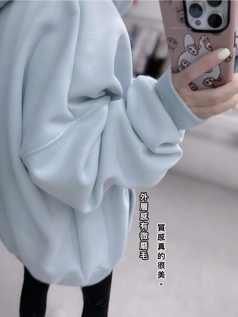 #先自己包色!這件質感超美 好甜! 立體Q毛英字母設計 #超級質感 刺繡框感英字母設計 #超加分 外層磨毛感的精緻質感超美的 還有 還有 ~ 親膚羊絨刷毛感 超讚 是一件 #高矮胖瘦 CP超高的帽Tee 落肩寬73 ‘ 胸圍72 ’ 全長67公分