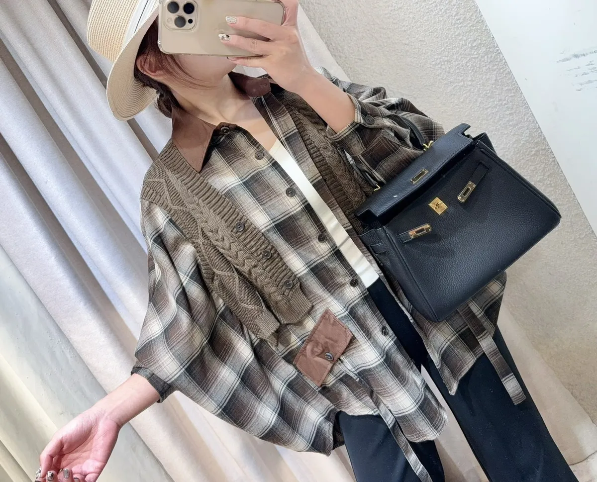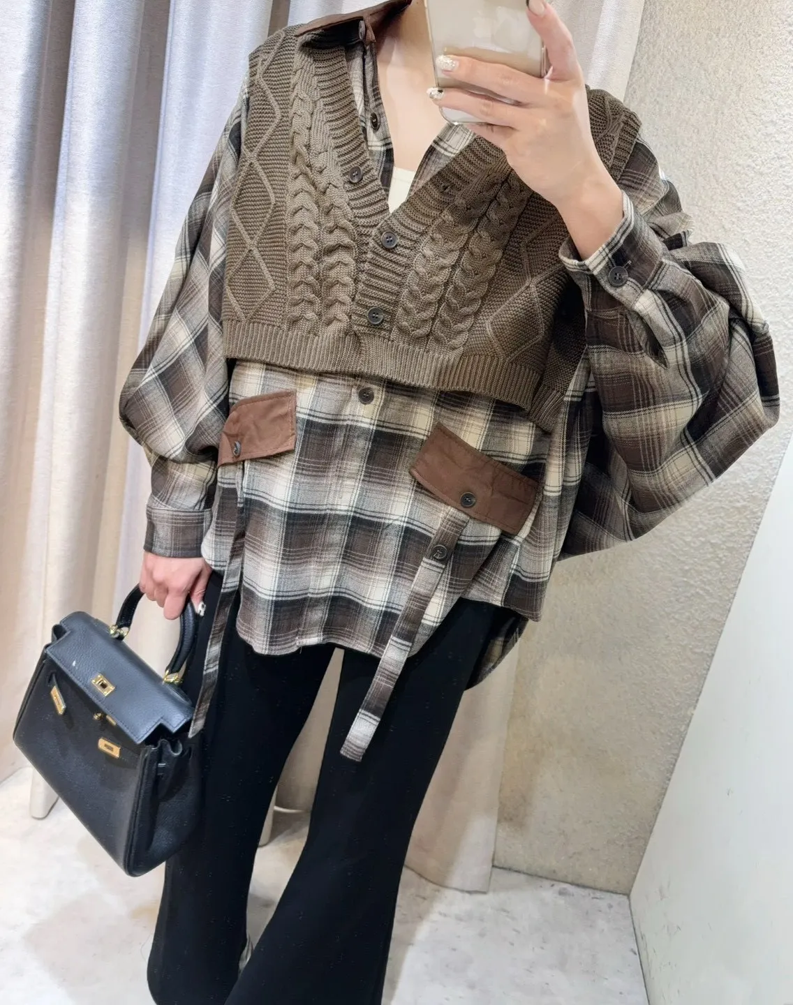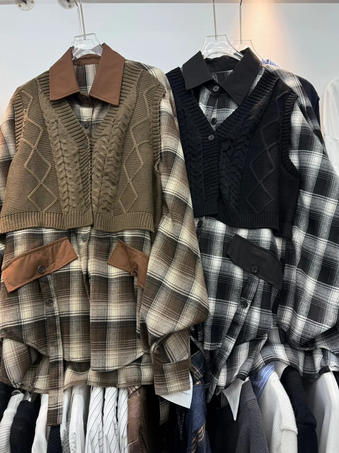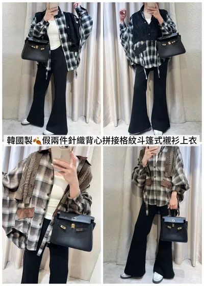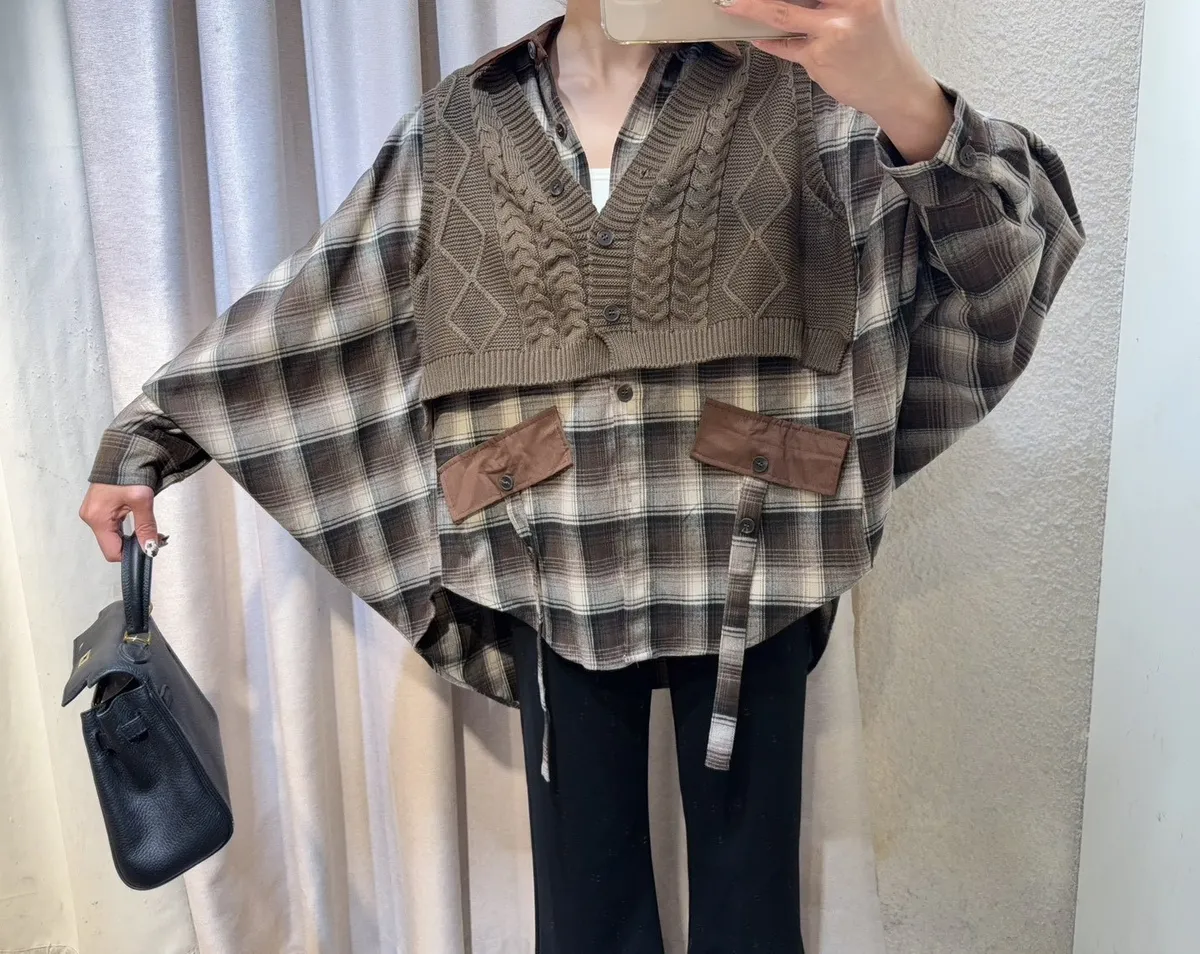 韓國製🍂假兩件針織背心拼接格紋斗篷式襯衫上衣