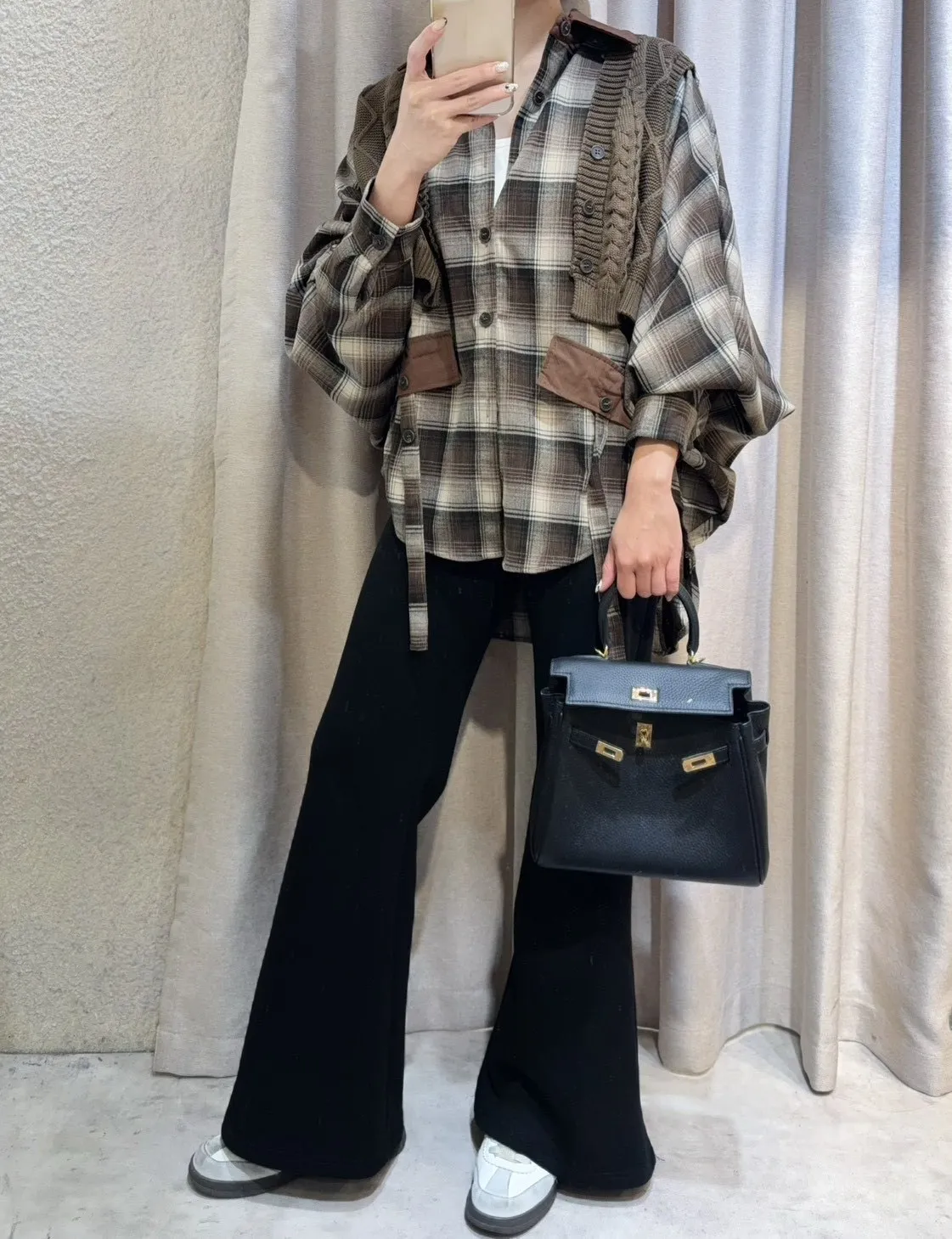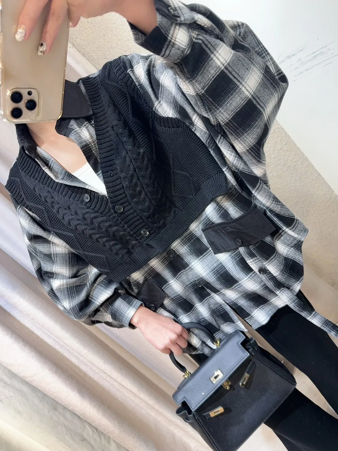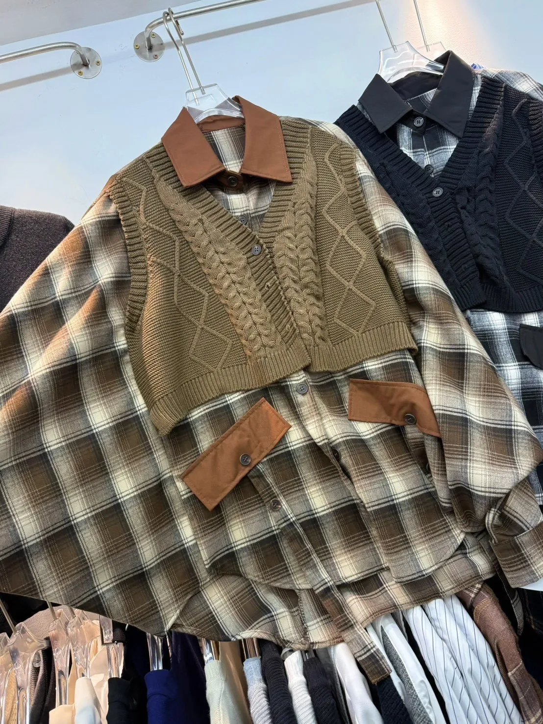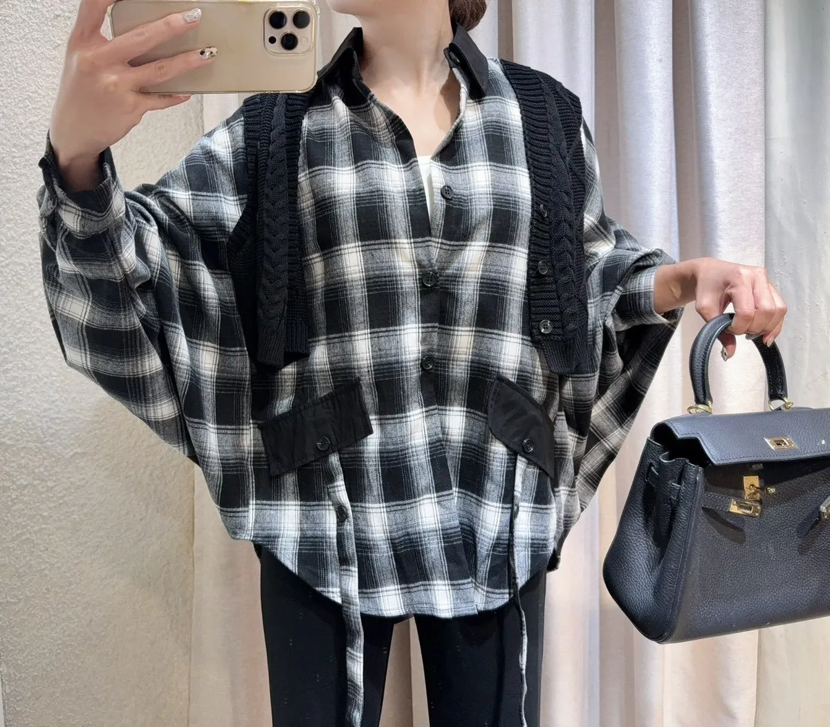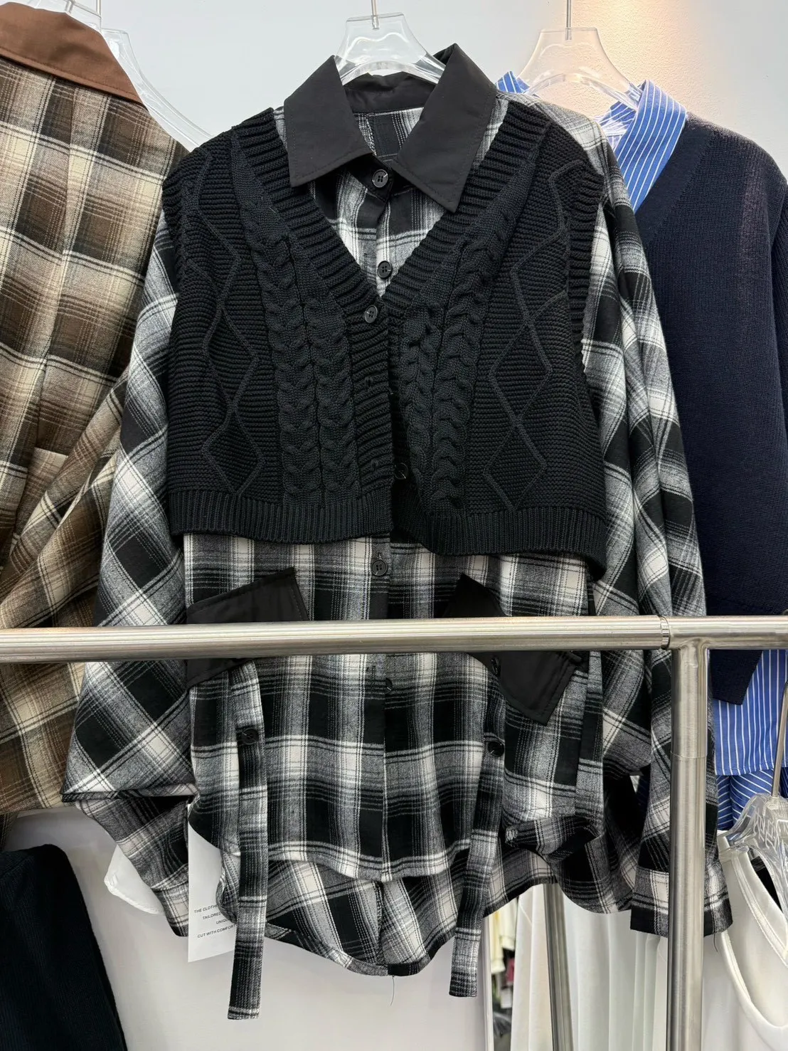 韓國製🍂假兩件針織背心拼接格紋斗篷式襯衫上衣