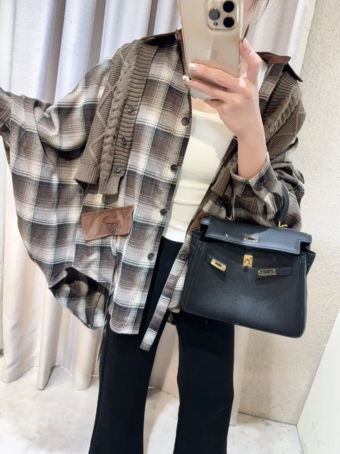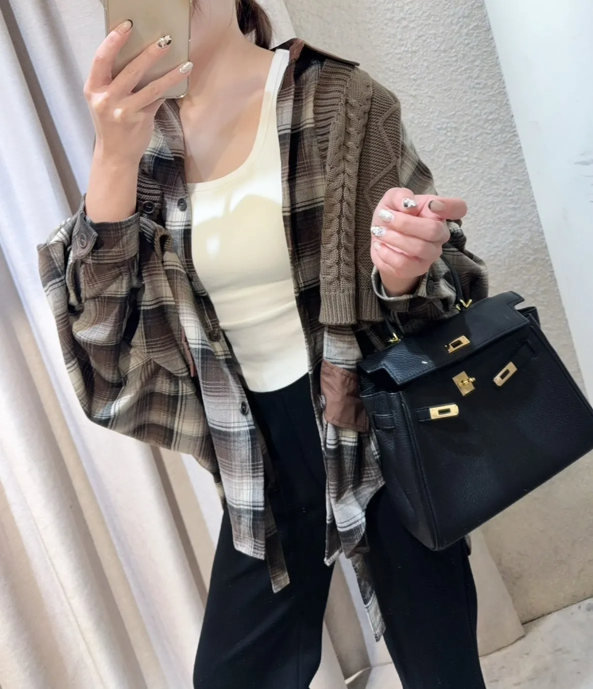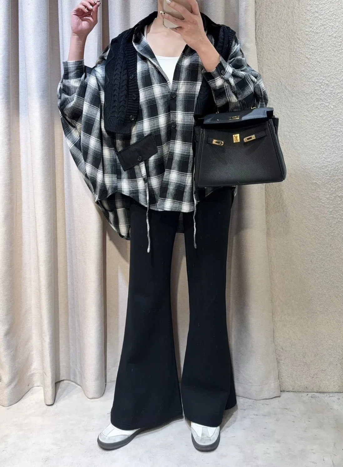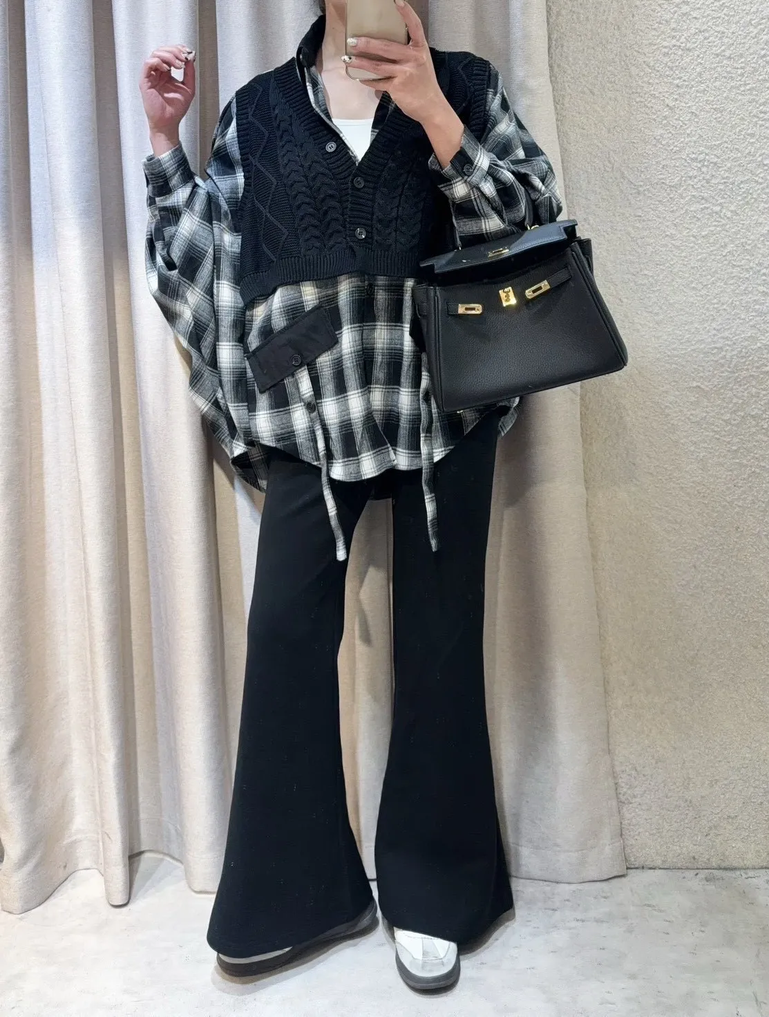 韓國製🍂假兩件針織背心拼接格紋斗篷式襯衫上衣