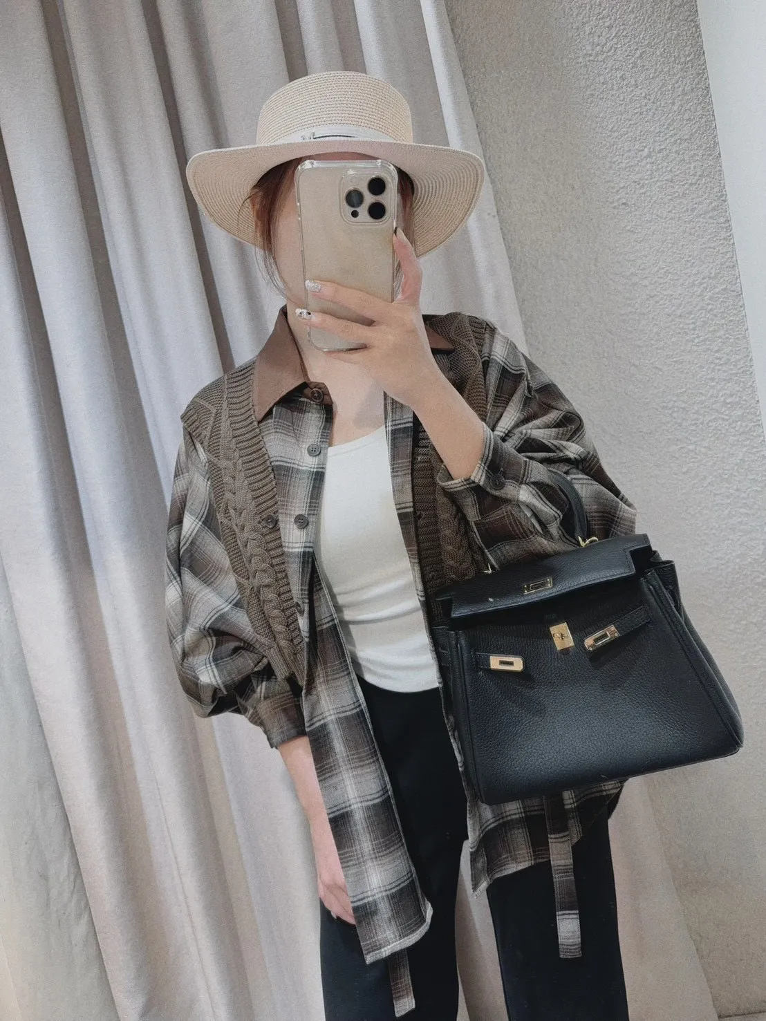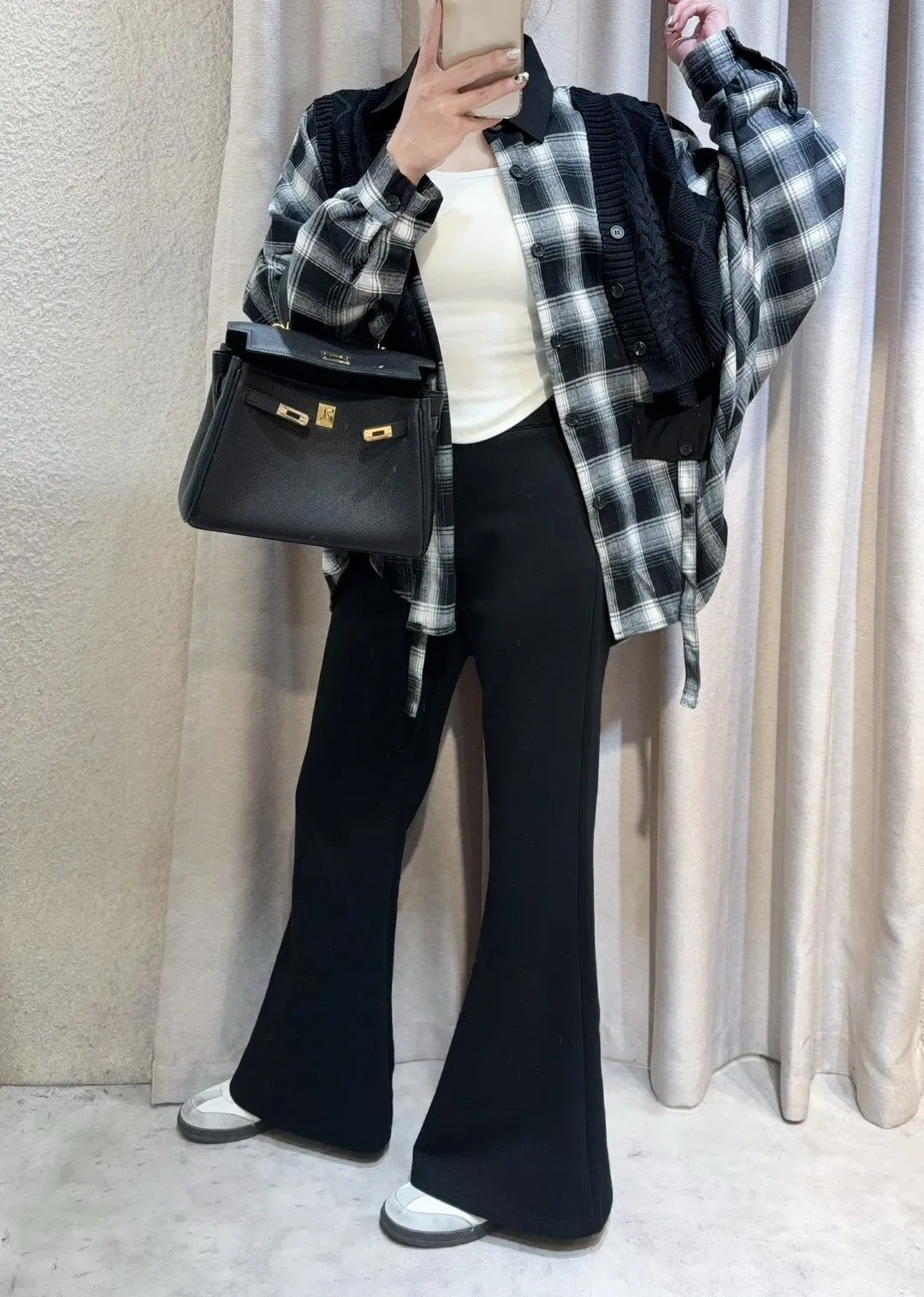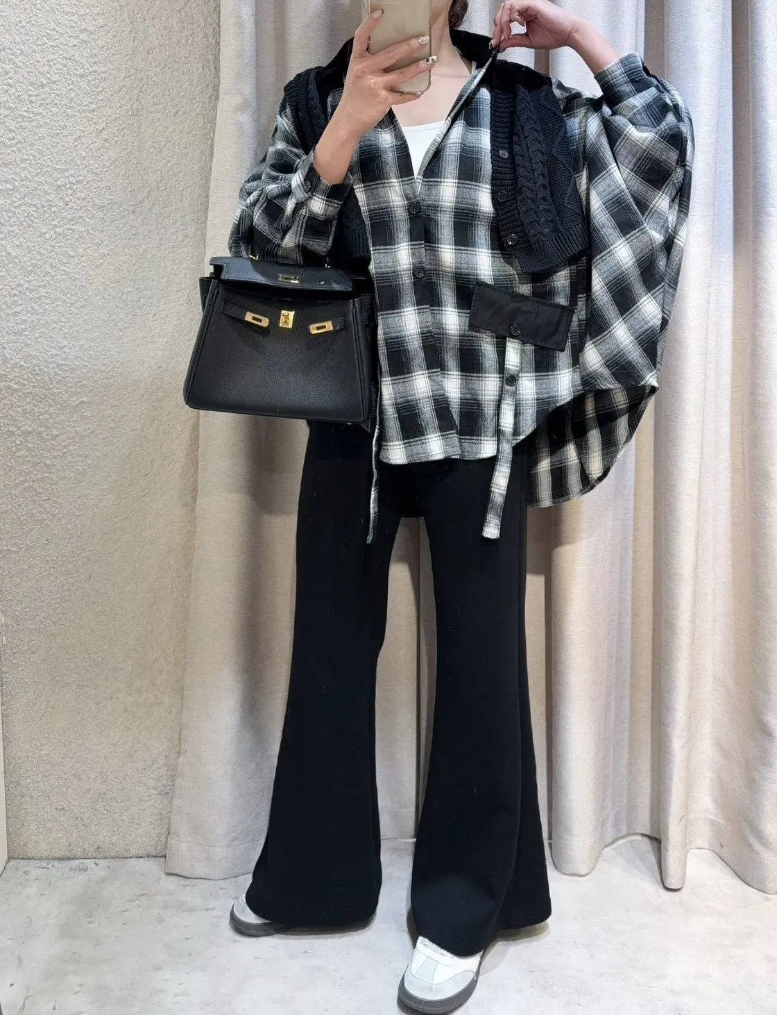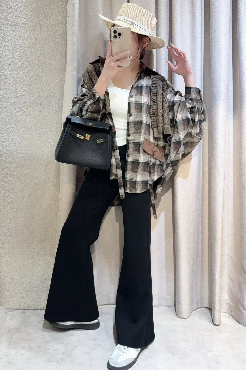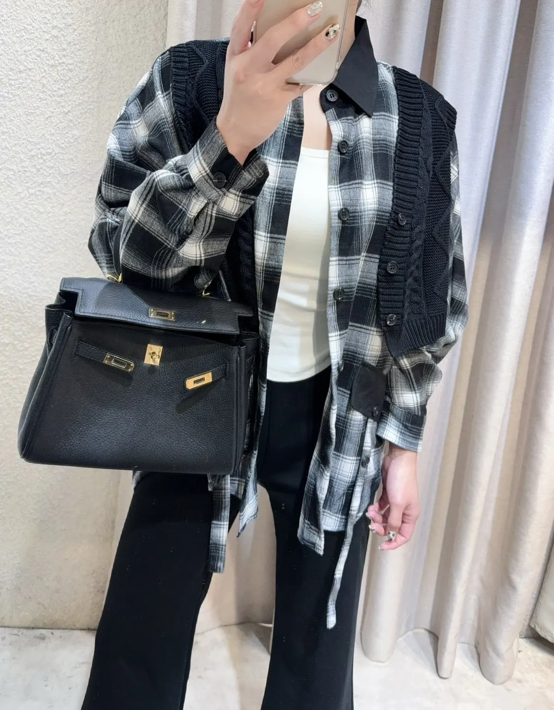 韓國製🍂假兩件針織背心拼接格紋斗篷式襯衫上衣