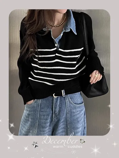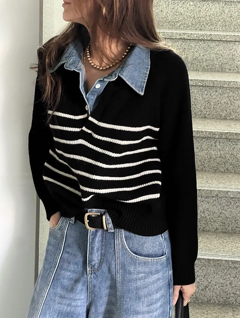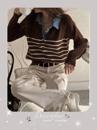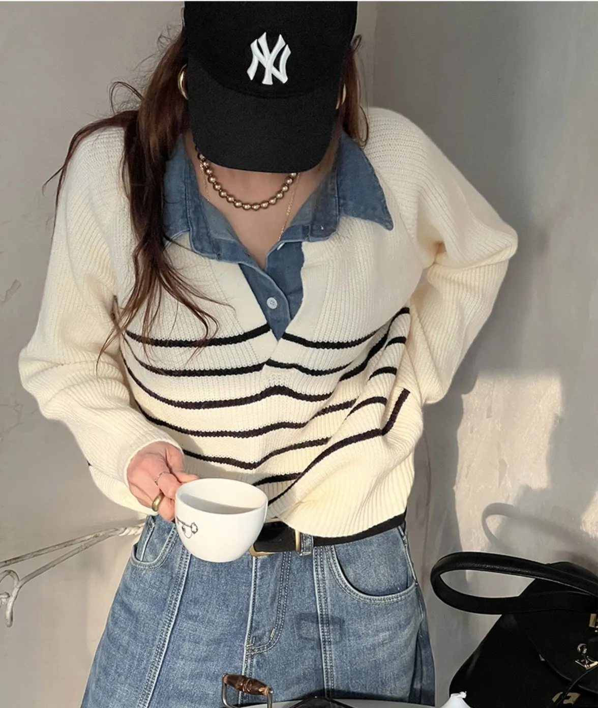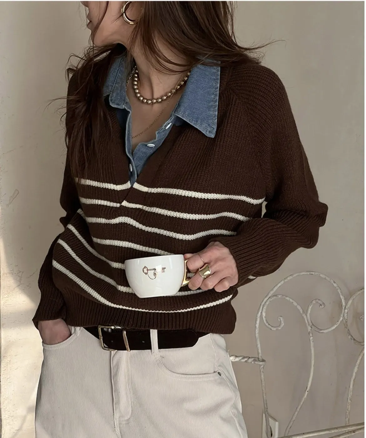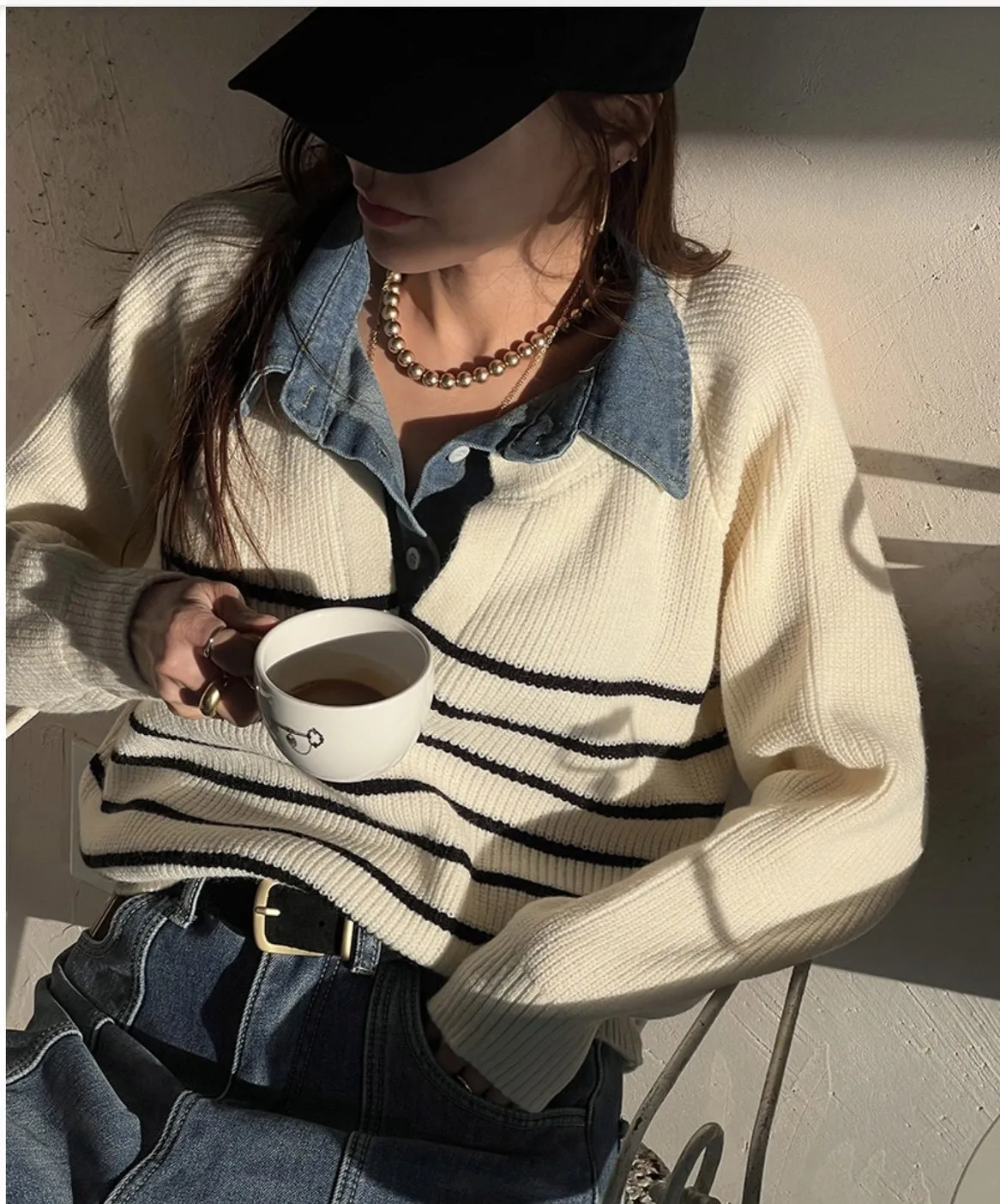 一秒穿出層次感! 冬天最怕搭配麻煩?這件直接幫你! 假兩件 設計毛衣 把層次與溫度一次穿上身 這件是會越穿越喜歡的那種 我自己是兩色咖/白都有留~ 最耐看的永遠是這種剛剛好的單品放到明年還是會拿出來穿 像襯衫又是毛衣、休閒卻很有質感怎麼穿都好看,是「冬天上班穿搭救星」!!! ✔️柔軟針織:溫柔又不挑膚色 ✔️條紋簡約耐看:日常穿也不會膩 ✔️牛仔領造型:層次感直接兩倍 尺寸胸寬54/ 全長63 公分