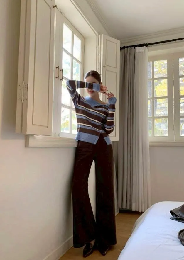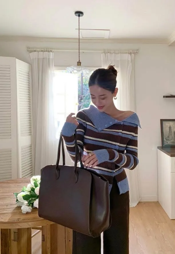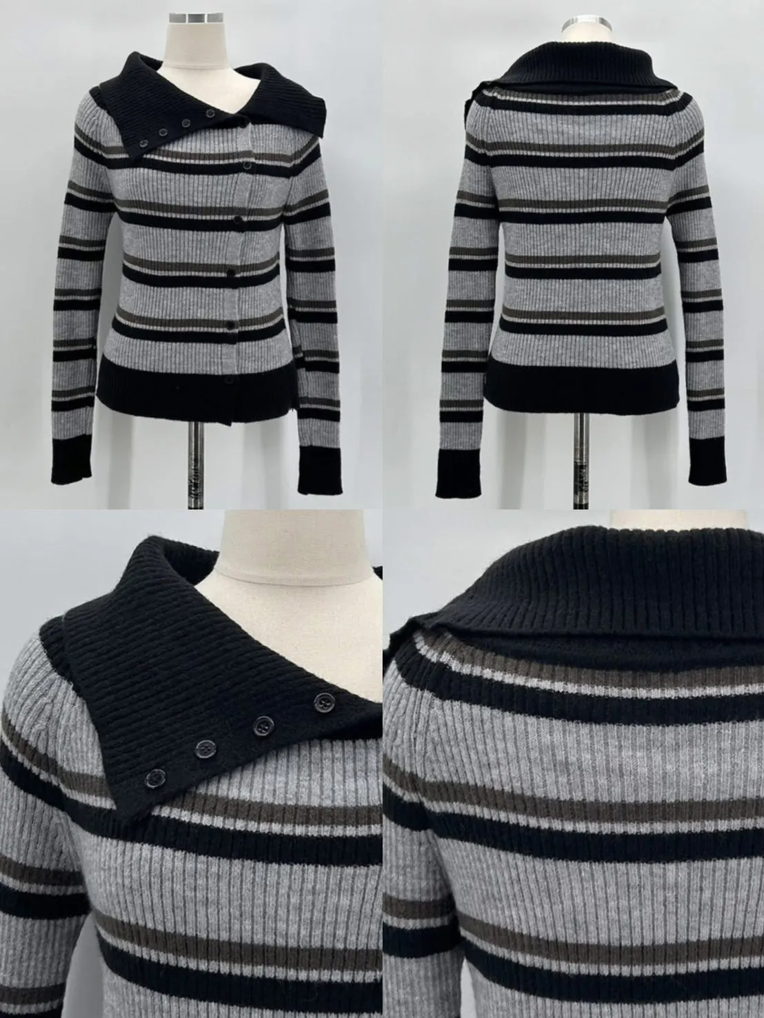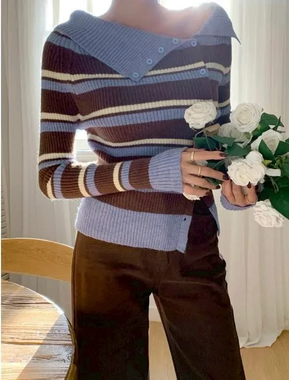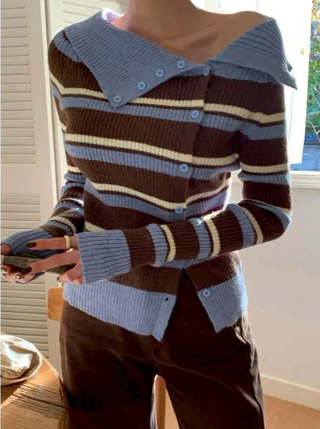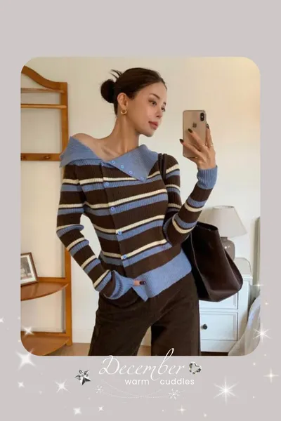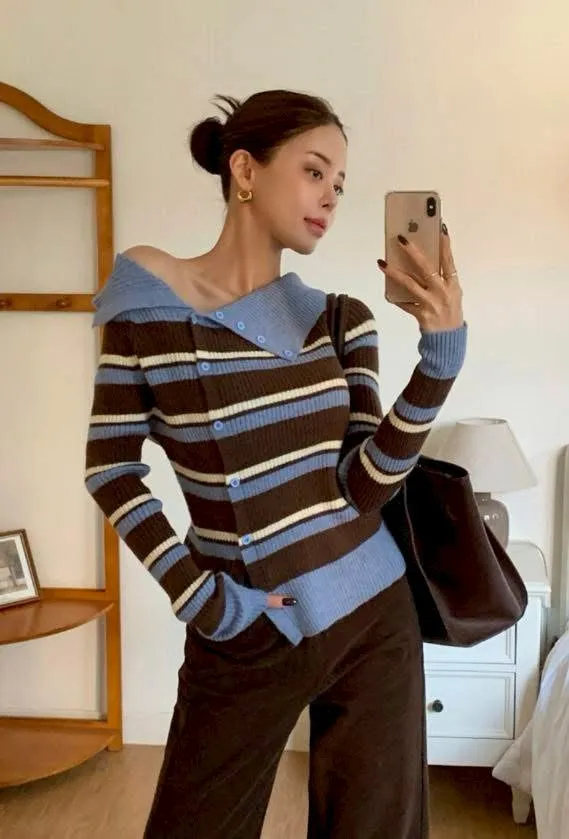 ✦ 溫柔卻有個性的「#撞色條紋針織」 ✦ 特別的斜排扣設計+大翻領剪裁 #穿上瞬間拉出法式不經意的性感 可微微拉成小斜肩 #顯鎖骨超好看 微厚磅的立體羅紋針織 #柔軟不扎、#彈性佳 (穿起來很舒服) #條紋比例剛剛好 #視覺上更顯瘦