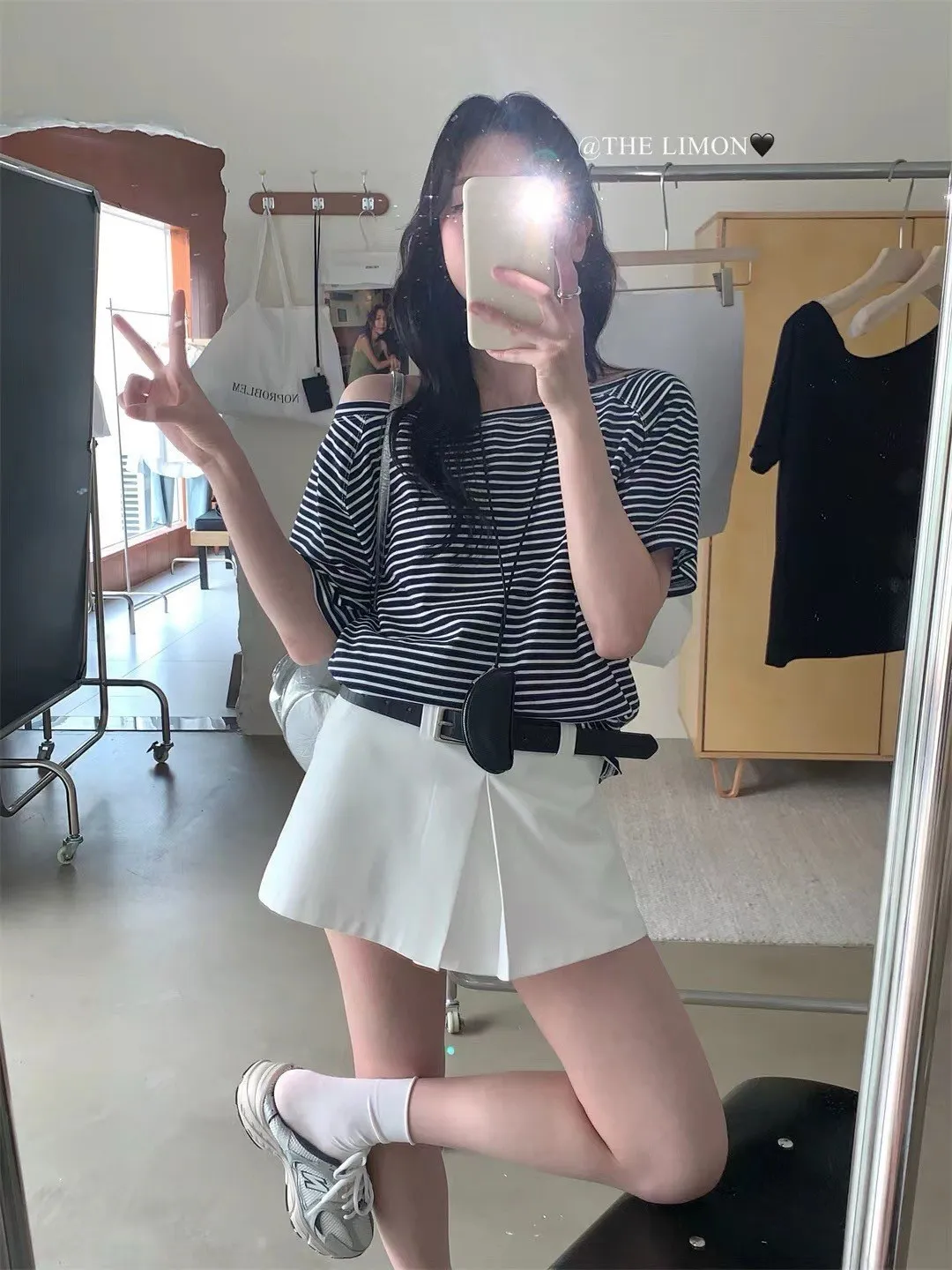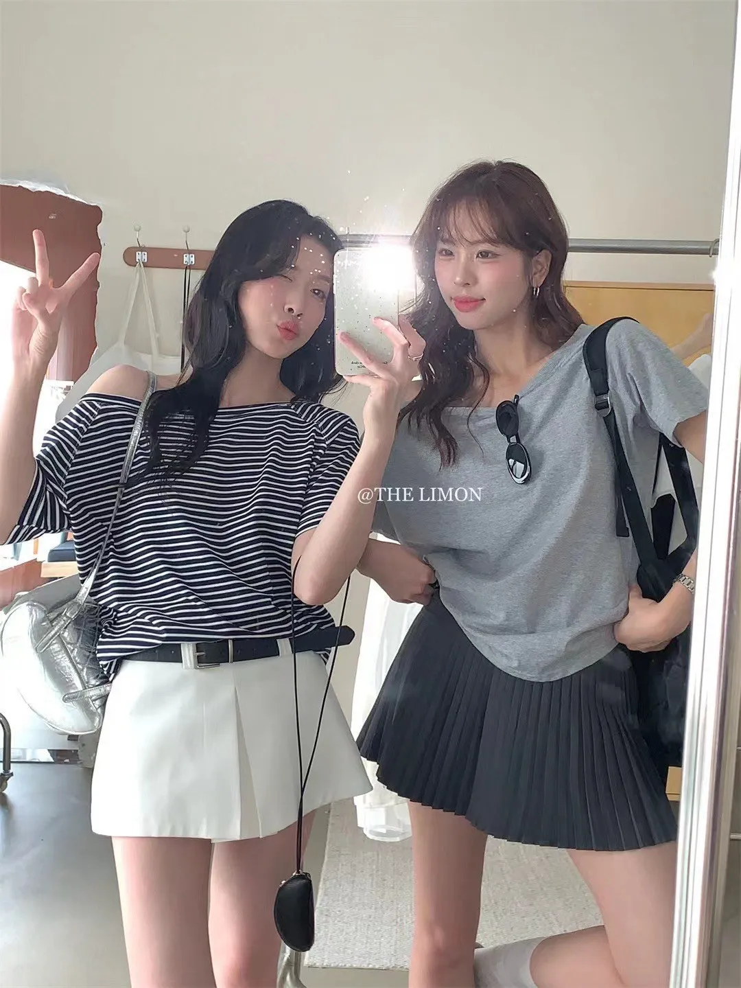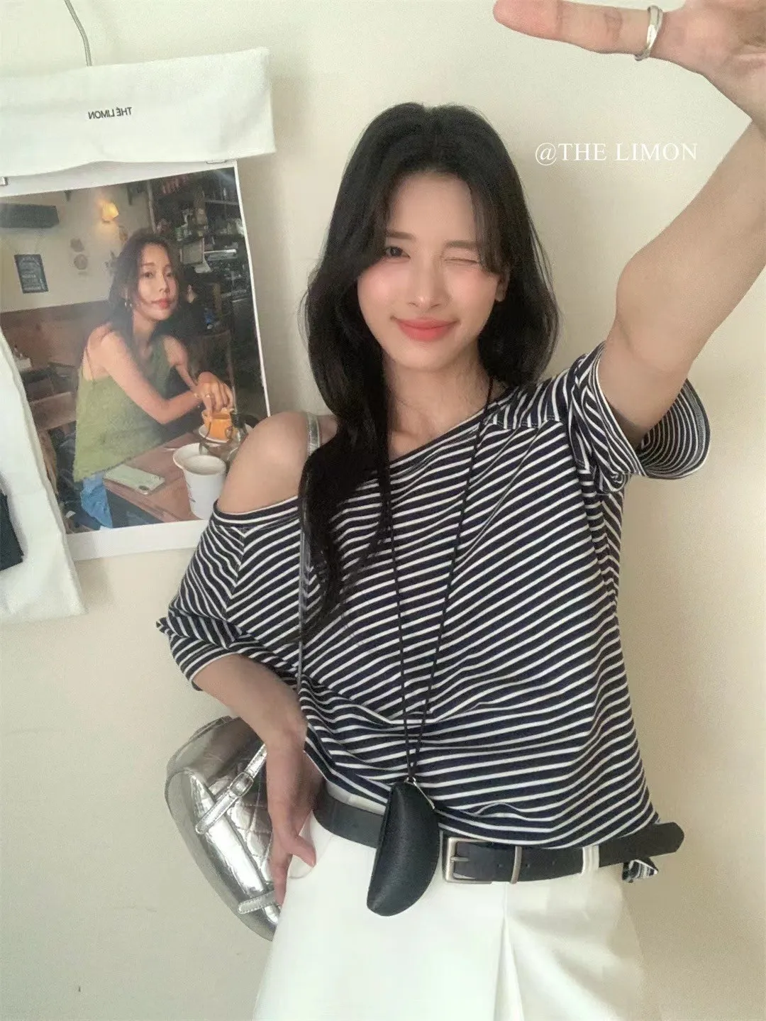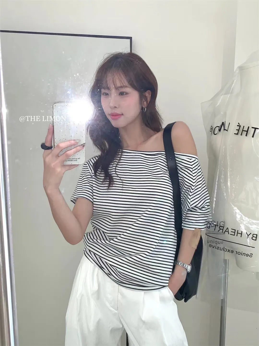 輕鬆穿出不費力的時髦感寬領設計可自由調整成一字領或斜肩穿法自然不做作 微微慵懶感搭配柔軟彈力棉質,舒適親膚不緊繃日常、約會、度假通通適合~一字領剪裁|可調整斜肩或一字露肩造型,無意間的微露鎖骨彈力棉質| 高彈不勒身、透氣又舒服,穿一整天都輕鬆自在微寬鬆版型|修飾手臂與腰部線條,不挑身形也不顯胖可休閒可小性感|不管搭牛仔褲、短褲或長裙都超有型!白:簡約亮眼,最基本也最不出錯藍:清新溫柔,好感女孩氣息灰:知性低調,適合日常與通勤穿搭黑:顯瘦性感慵懶感兼具 白底條紋:休閒中帶點法式感深藍條紋:復古耐看又時髦尺寸: 胸60/全長58公分