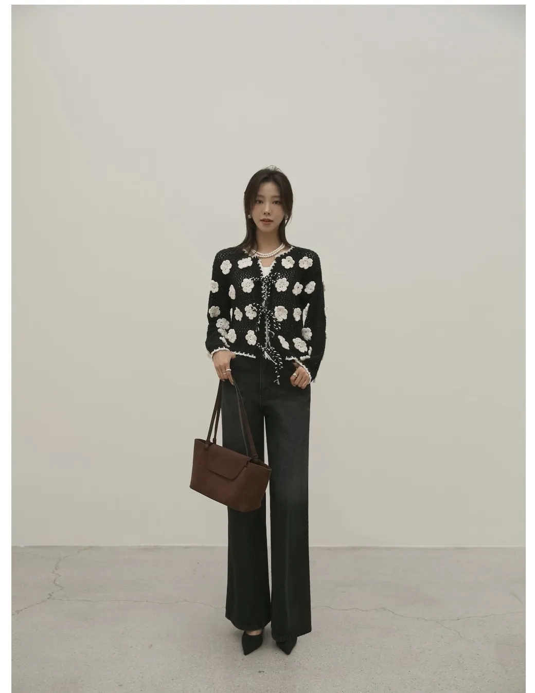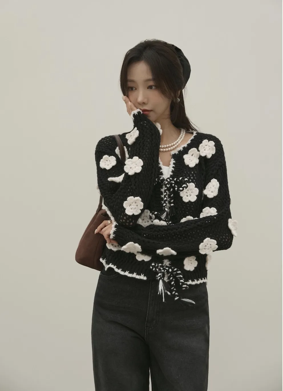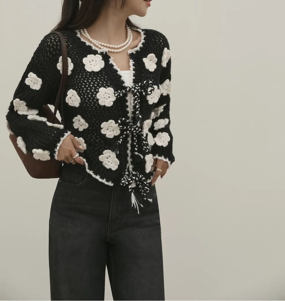 黑色打底配上白色毛線小花滿滿的復古 crochet vibe 🌼✨手工感超強烈,一眼就能成為穿搭亮點輕薄針織編織感很透氣,春秋單穿剛好,冬天還能內搭高領打底小細節是前排的綁帶設計,隨性綁個蝴蝶結就很可愛全長52/肩寬55/胸48公分
