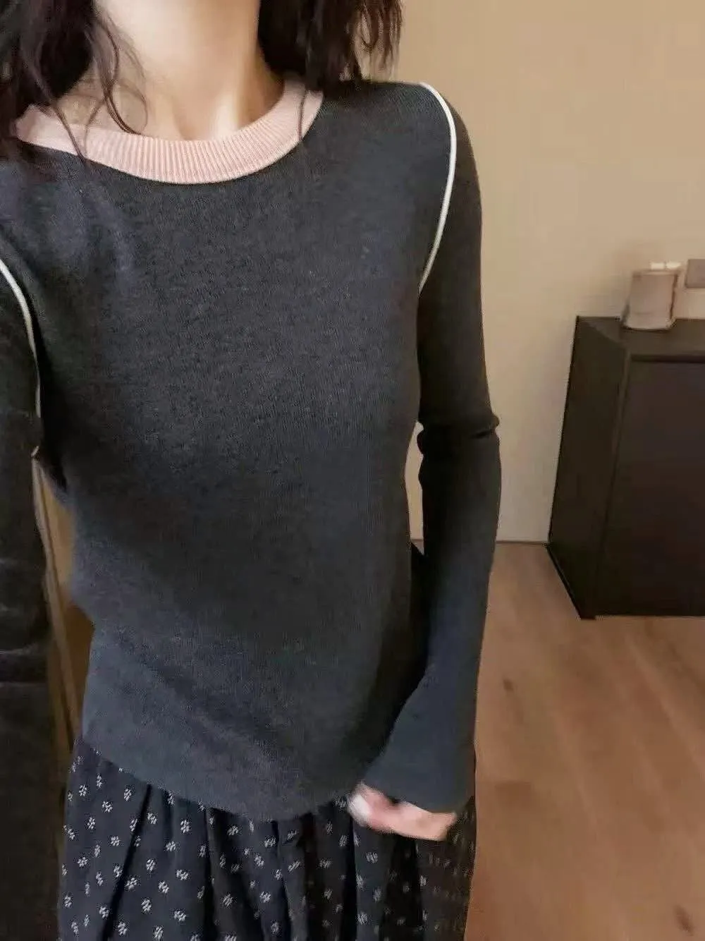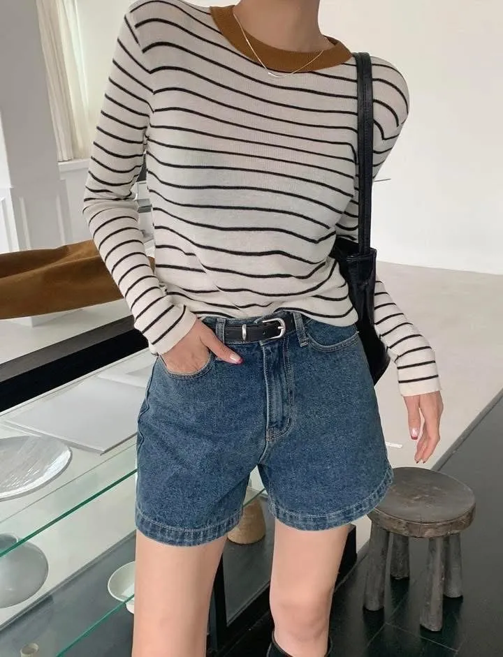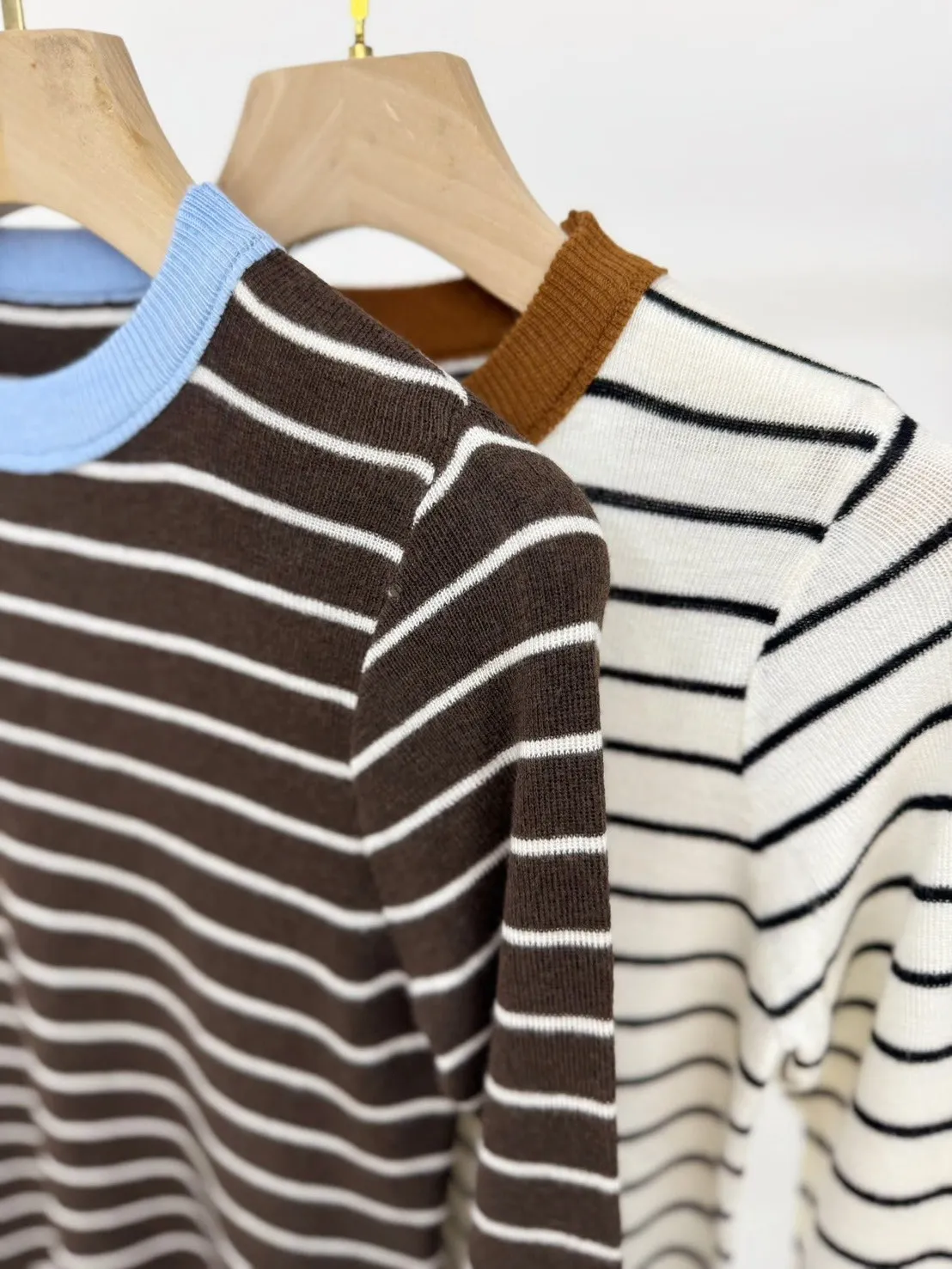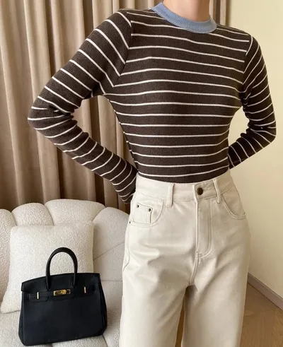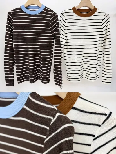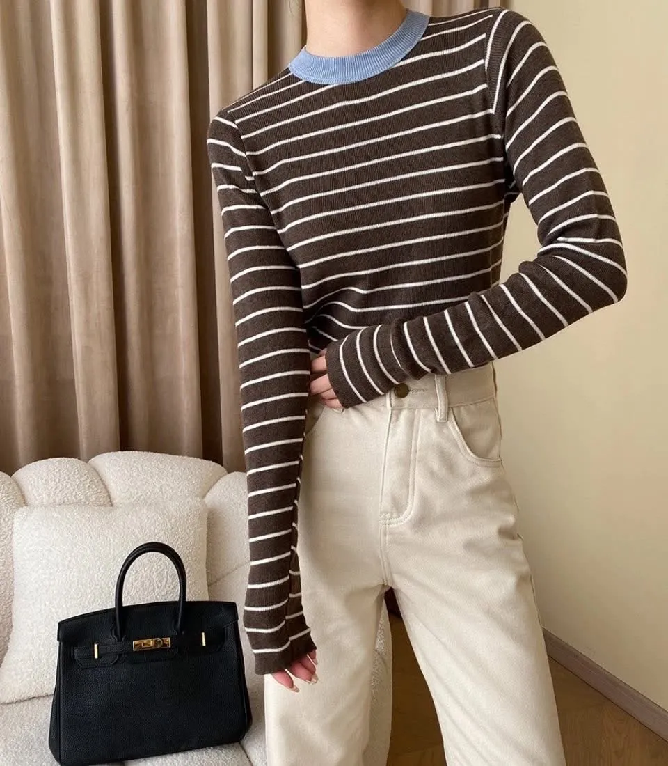 「 #領口撞色條紋針織 」 親膚 ‘ 彈性 ’ 針織 柔軟細針織 ‘ #厚薄剛好 撞色領口設計讓條紋多一份層次感 簡約俐落卻有記憶點 #百搭不挑人穿 #無論單穿或內搭外套都超好看 《 #以領子配色為主色喔 》 粉領 ‘ 咖領 ’ 水藍領 ‘ 黑領 肩寬33 ‘ 胸圍38.5 ’ 全長60公分