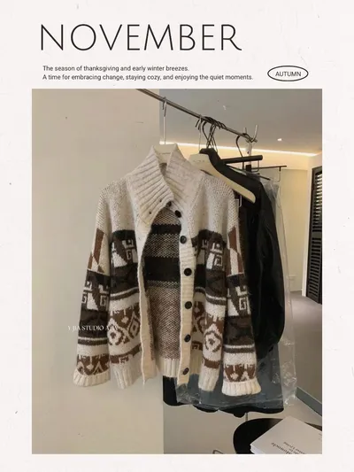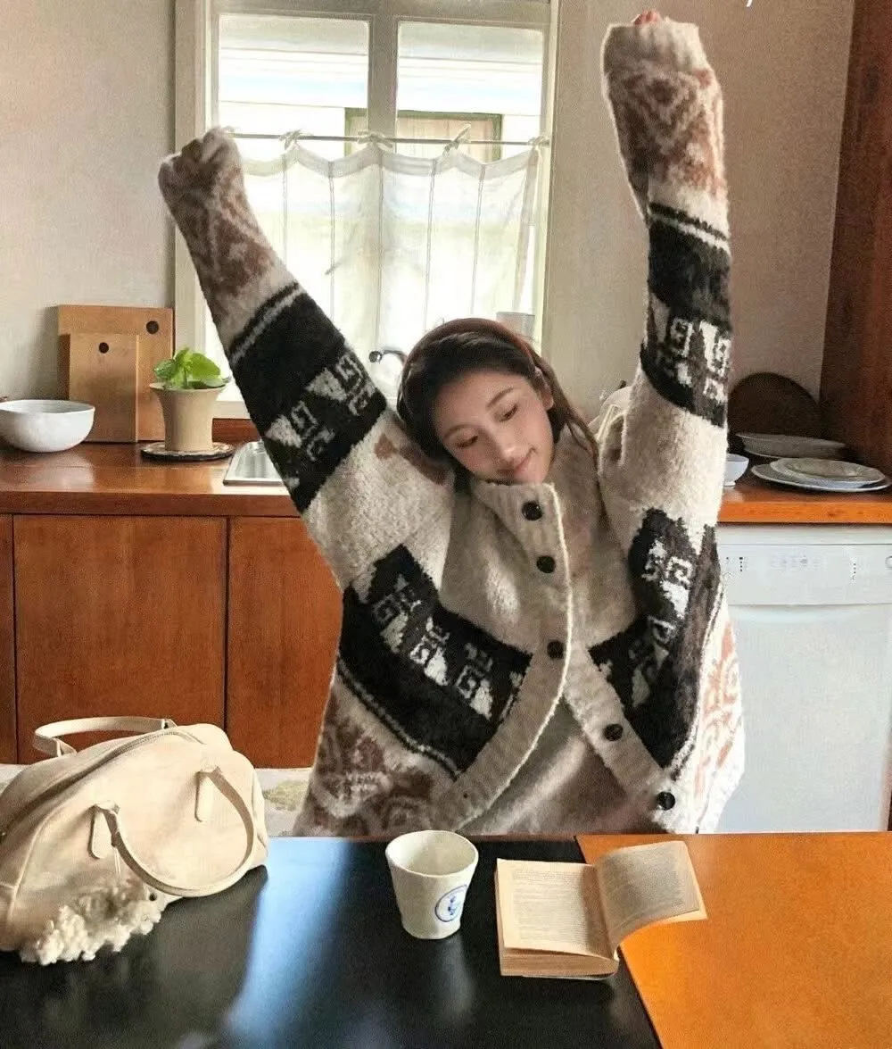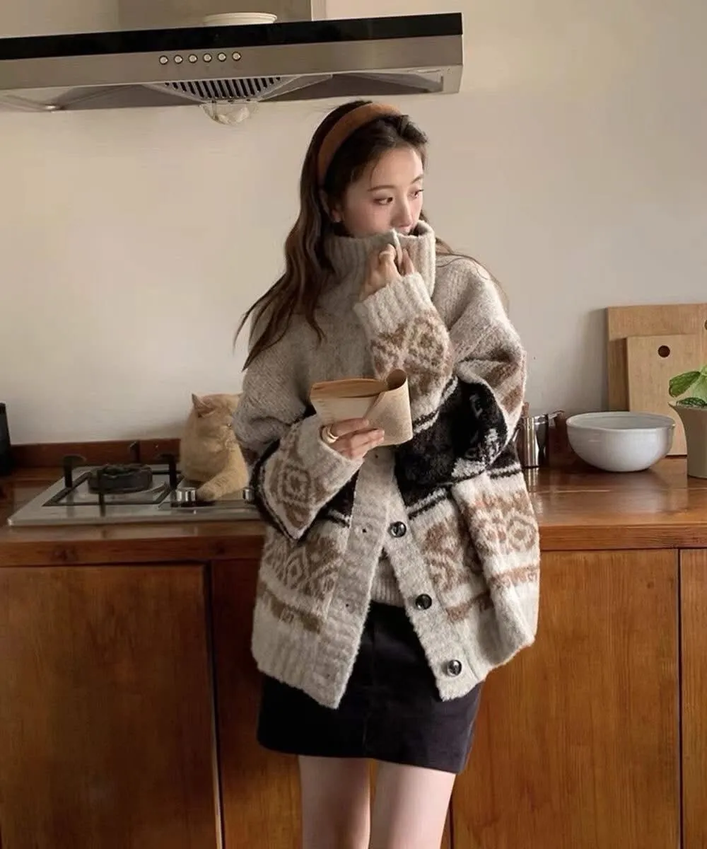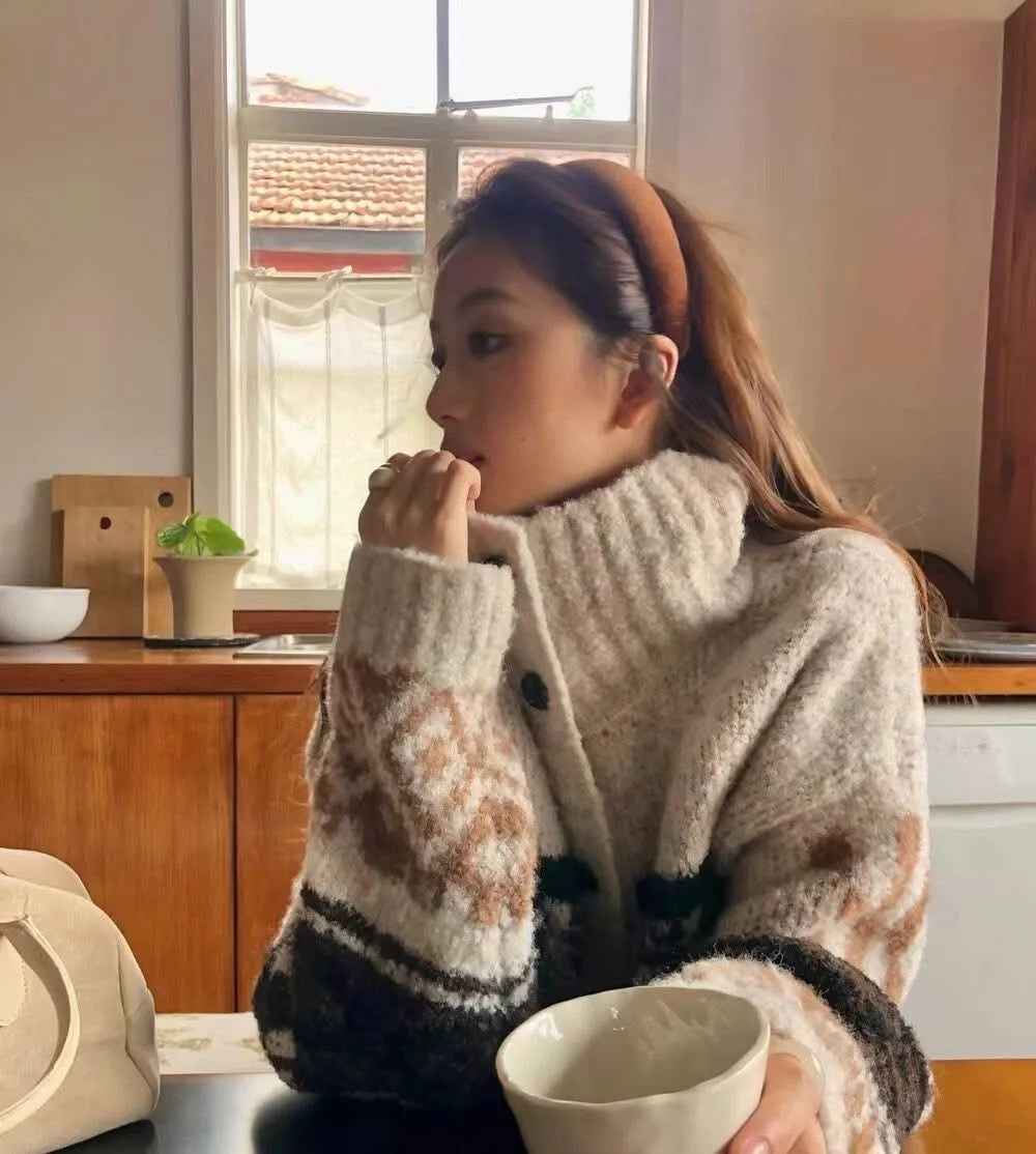 #人氣王冬日復古高領針織外套來啦 YJ家這款開衫真的超級暖又好看~厚實針織加上費爾島花紋設計,整件充滿復古氣息,隨便一披就有韓系女孩的冬季氛圍感 版型是寬鬆落肩設計,穿起來不挑身形又顯瘦,高領釦式設計可自由調節,保暖度滿分。柔軟混毛面料保暖不刺膚,單穿或當外套都很有造型感 厚實針織花紋布料,保暖有份量 高領可開扣設計,造型與實穿兼具 寬鬆落肩剪裁,修飾肩線不挑人 復古花紋細節,冬季穿搭亮點 平量(單位:cm)衣長64/肩寬55/胸寬56