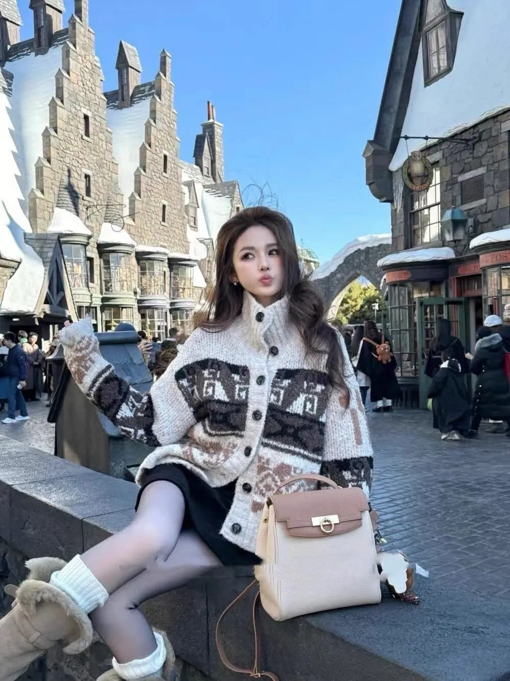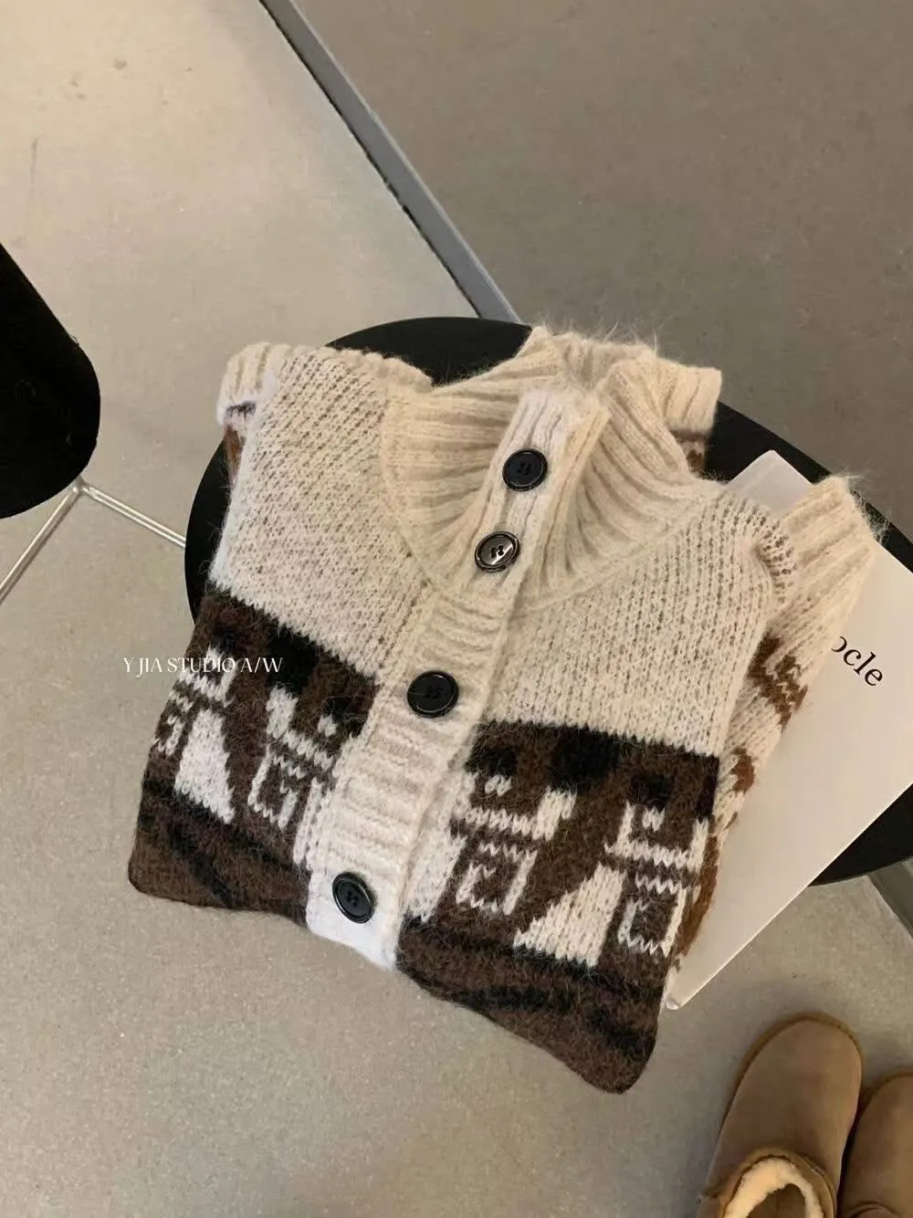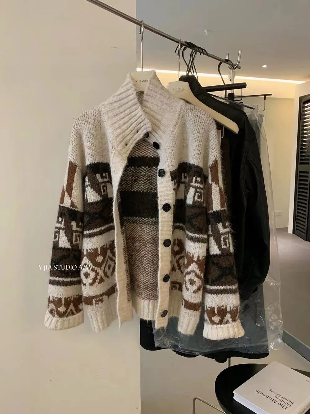 #人氣王冬日復古高領針織外套來啦 YJ家這款開衫真的超級暖又好看~厚實針織加上費爾島花紋設計,整件充滿復古氣息,隨便一披就有韓系女孩的冬季氛圍感 版型是寬鬆落肩設計,穿起來不挑身形又顯瘦,高領釦式設計可自由調節,保暖度滿分。柔軟混毛面料保暖不刺膚,單穿或當外套都很有造型感 厚實針織花紋布料,保暖有份量 高領可開扣設計,造型與實穿兼具 寬鬆落肩剪裁,修飾肩線不挑人 復古花紋細節,冬季穿搭亮點 平量(單位:cm)衣長64/肩寬55/胸寬56