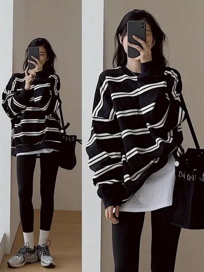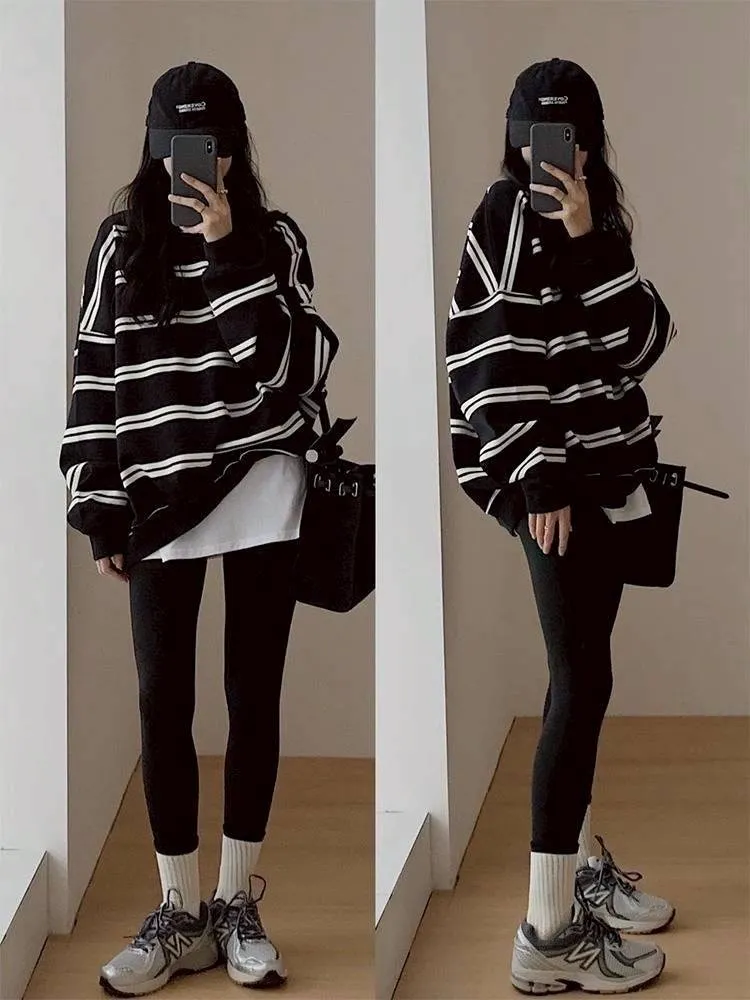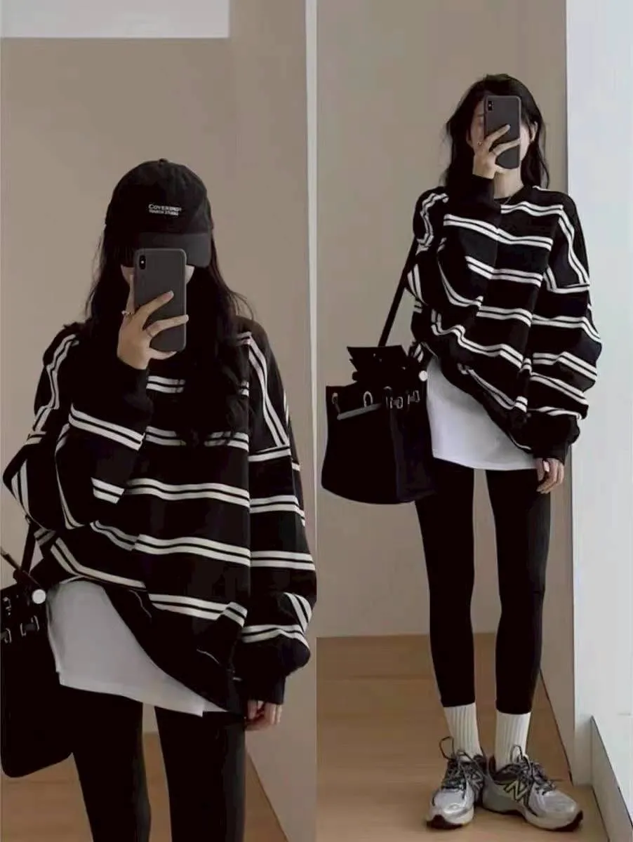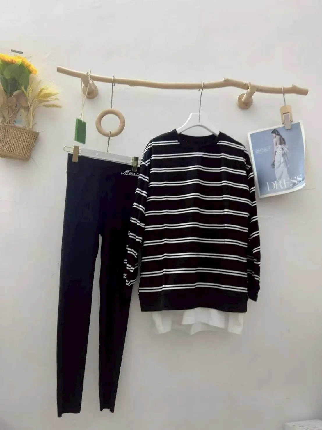 🖤【條紋控快+1💥這套穿起來太韓太顯瘦了‼️】懶得搭配的日子就靠這套✨假兩件條紋上衣+高彈力打底褲=出門神套裝上衣寬鬆顯瘦、層次感自然不厚重~下身螺紋褲包腿修飾,拉長比例✔️穿去逛街、買咖啡、出遊都超好看!🔥整套出門免煩惱~一套搞定上班、出門、約會OOTD💋🖤尺寸參考:衣長約80cm/胸圍68cm/褲長92內搭褲L號可以穿