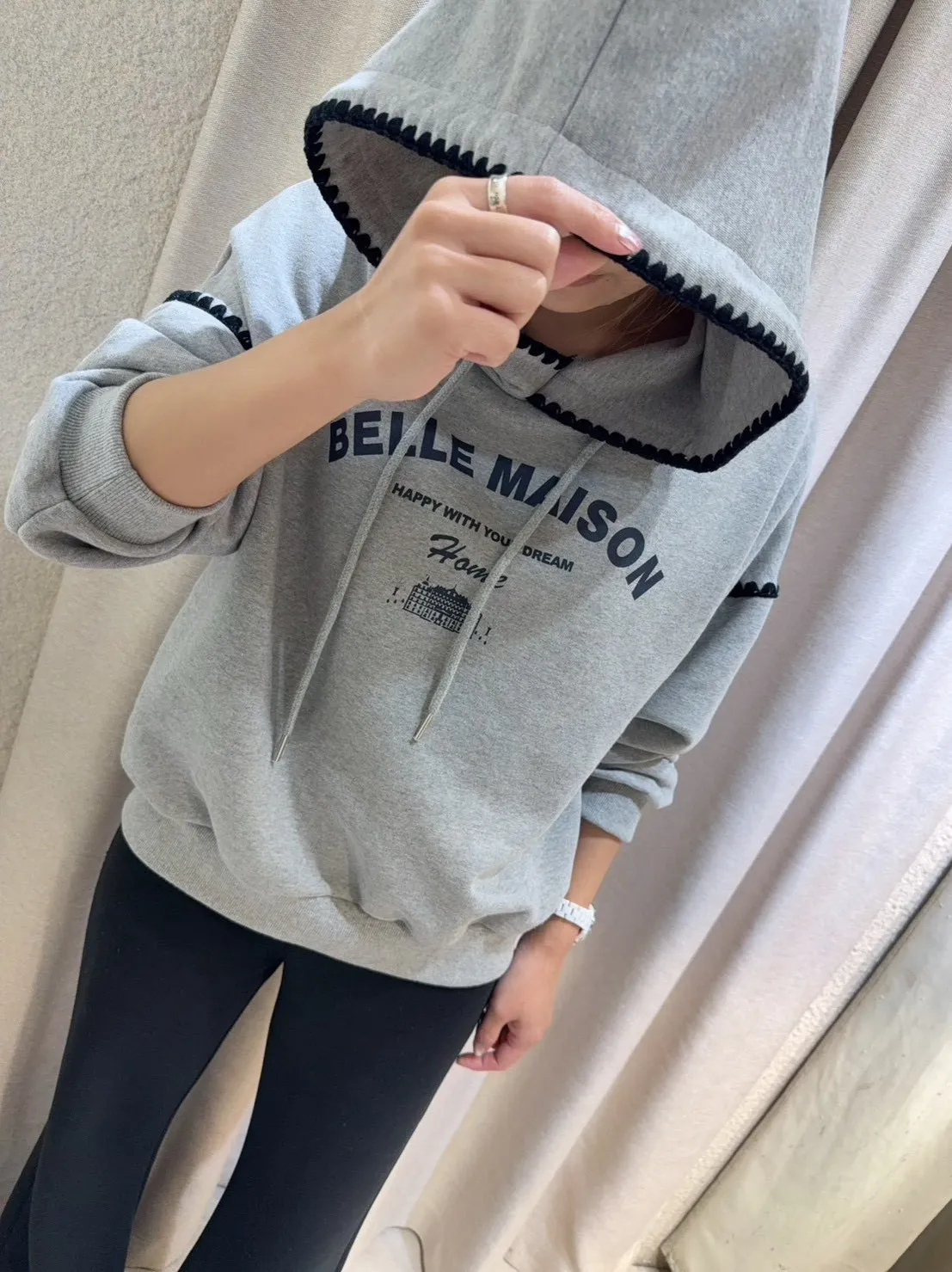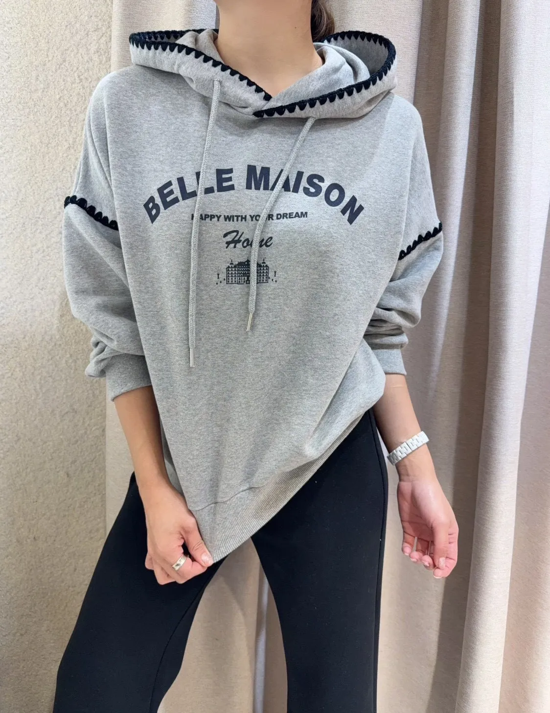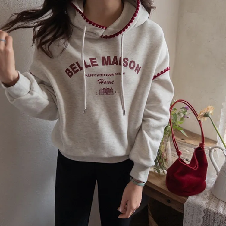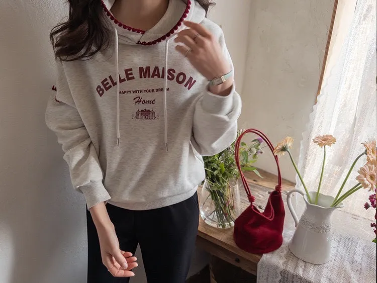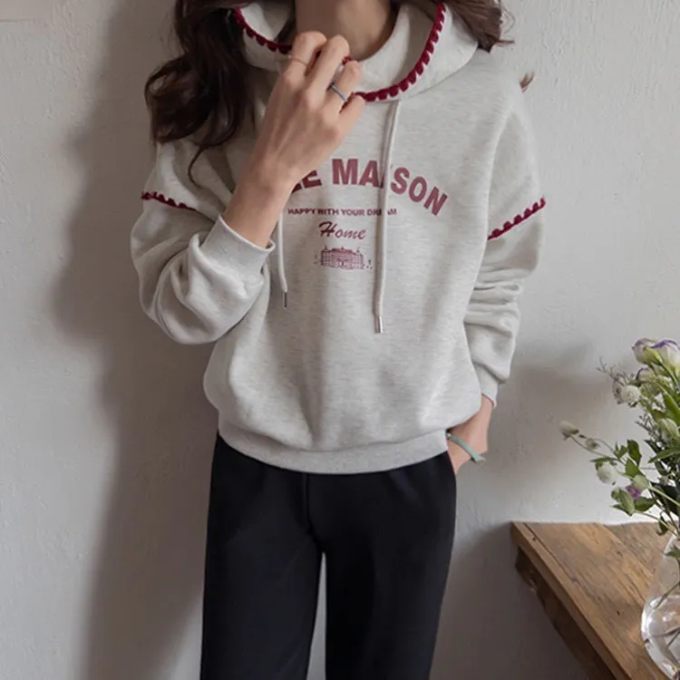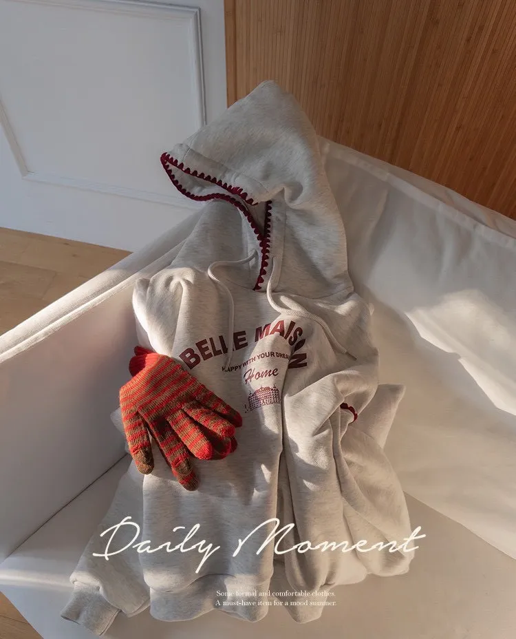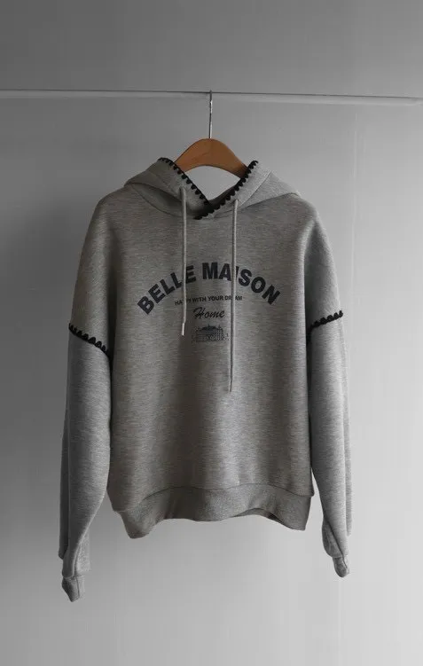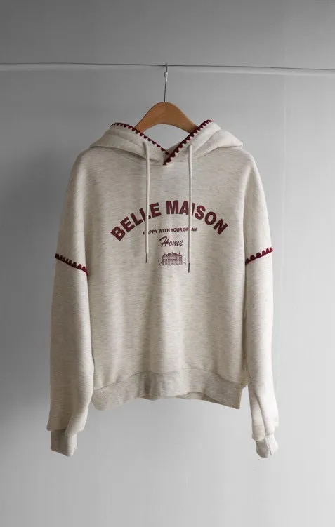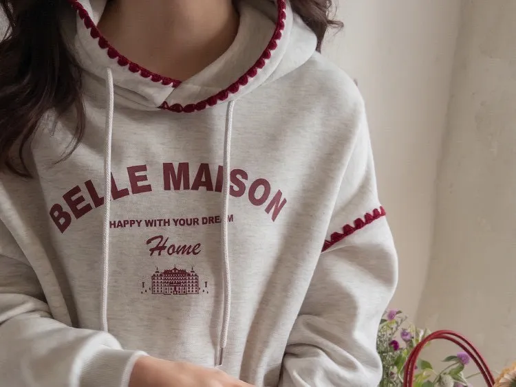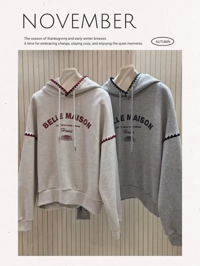 帶點俏皮感又不會太甜膩 個性女孩也會喜歡!細節充滿個人魅力! 柔軟棉料結合溫柔配色帽緣與袖口的滾邊細節,讓整件上衣更有層次感。字母刺繡點綴「BELLE MAISON」歐風字樣,穿起來有一種低調的法式休閒感🌿 在寒冷的冬天既保暖又不臃腫,出門穿一件就搞定! 寬鬆版型不挑身材, 搭配不同風格的下身都能很好看唷~ 🎨 顏色:灰色、燕麥📏 尺寸:肩65、胸58、長60cm