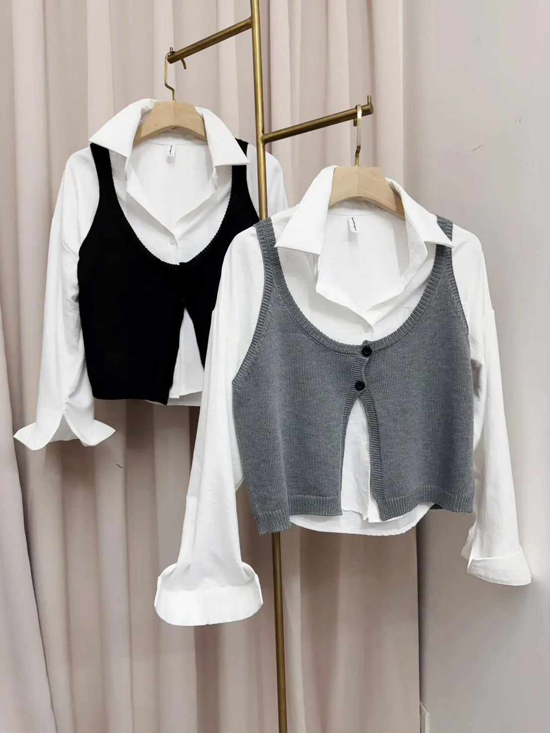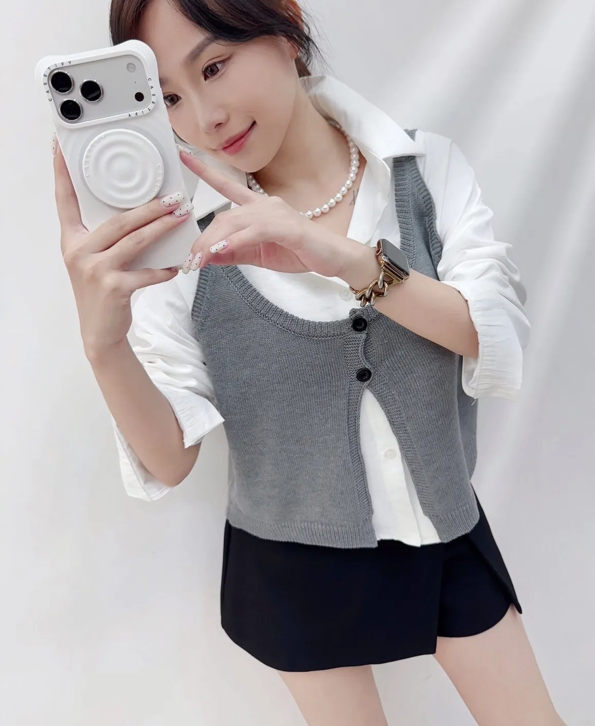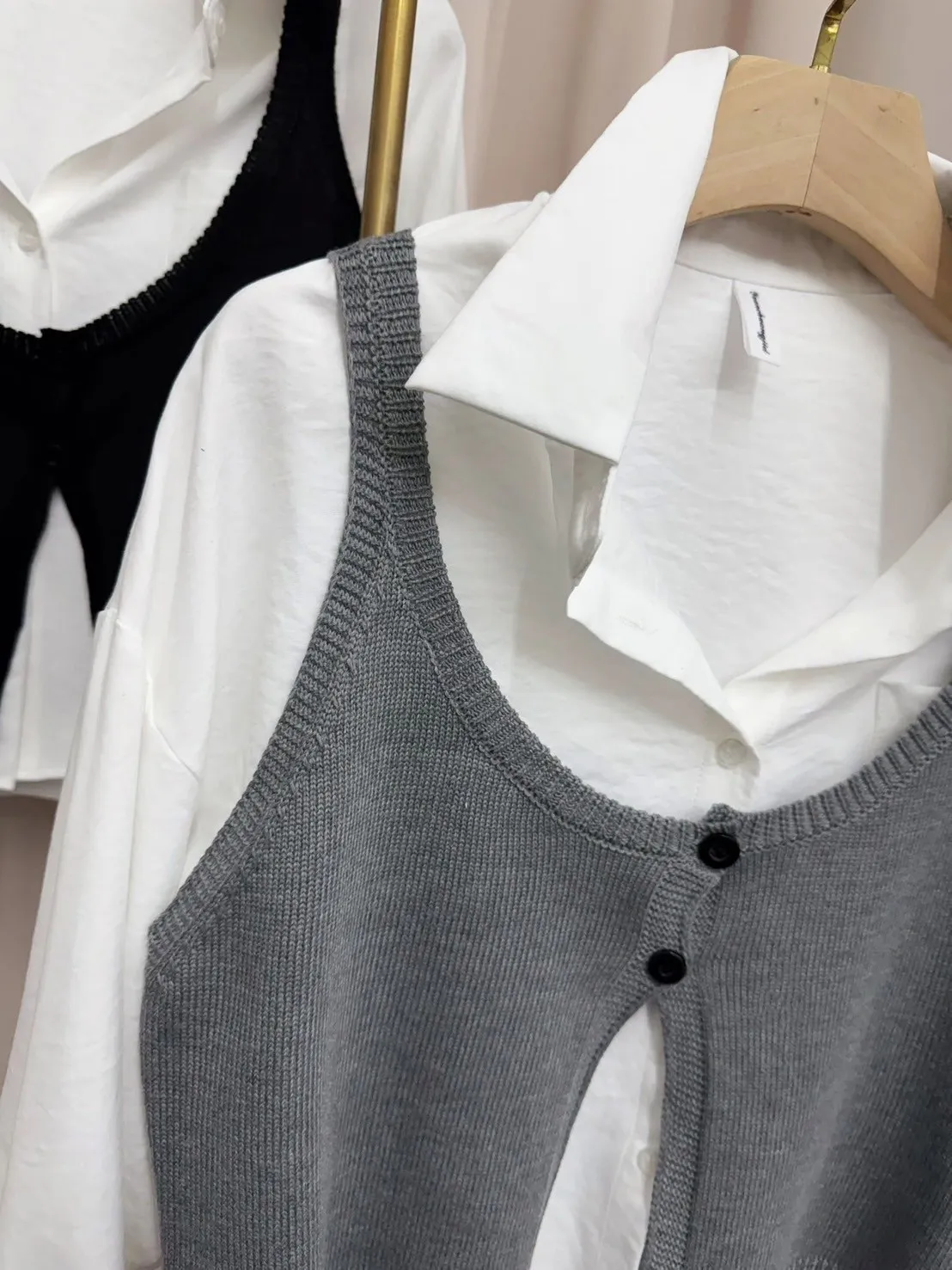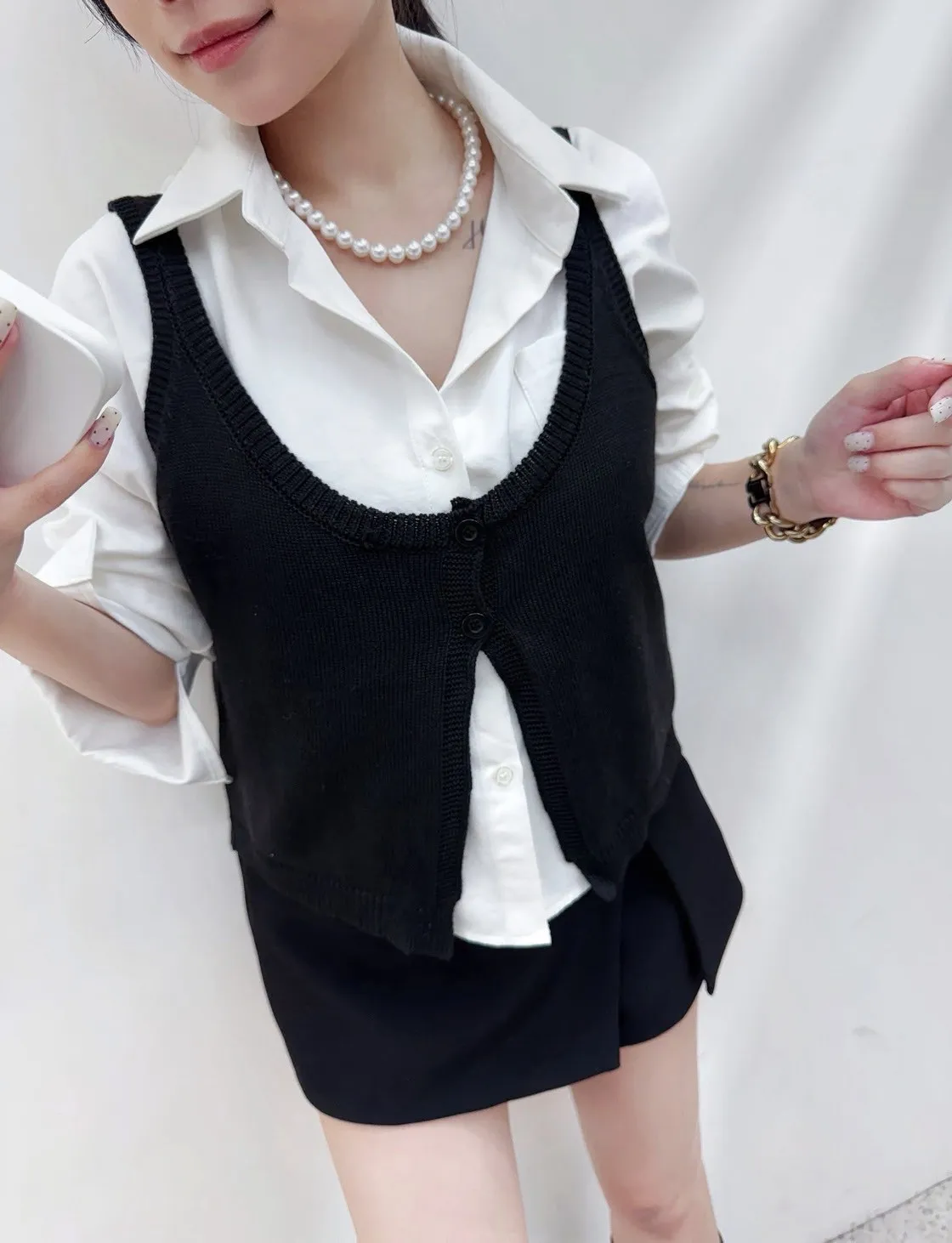 柔軟親膚的針織布料,穿起來舒適又修身卻不緊繃! 襯衫設計不僅修飾脖頸線條 還讓整體看起來更俐落有質感 簡約配色可以駕馭各種風格!簡單配牛仔褲或寬褲就超美 #襯衫 肩寬51 ‘ 胸圍53 ’ 全長47 公分 #針織背心 胸圍46 ‘ 全長45 公分