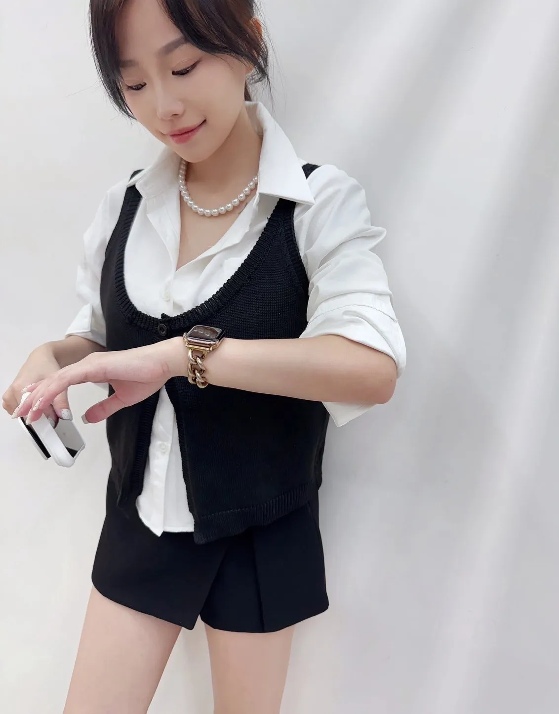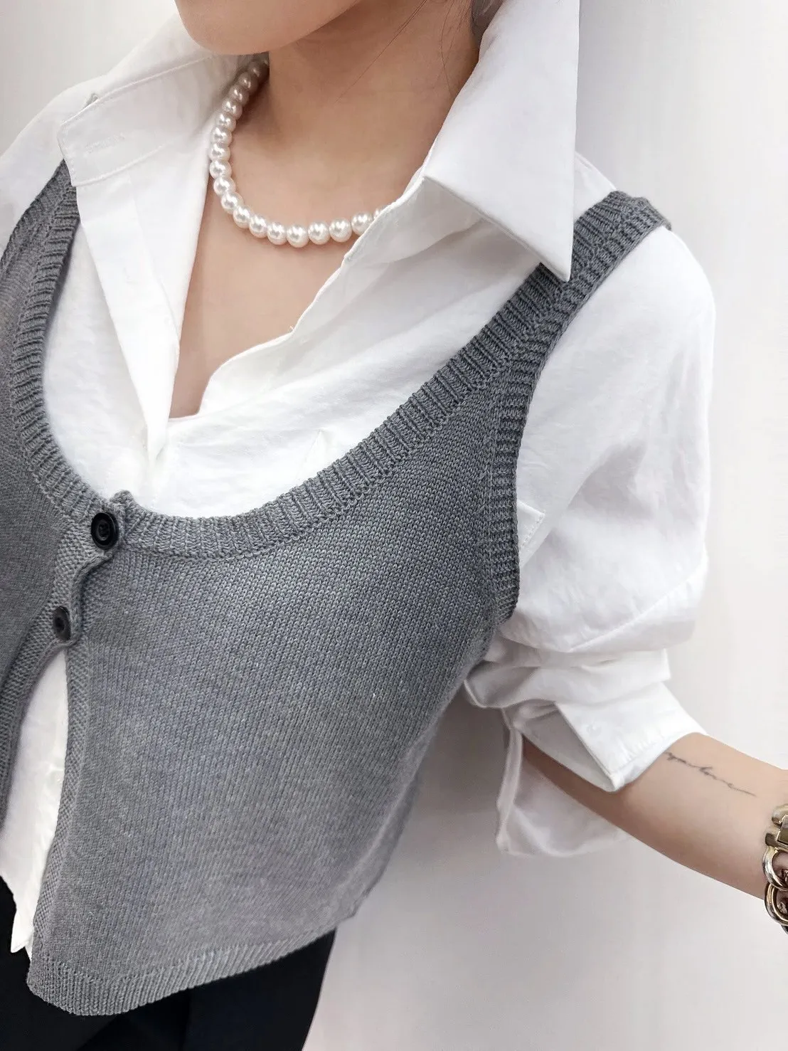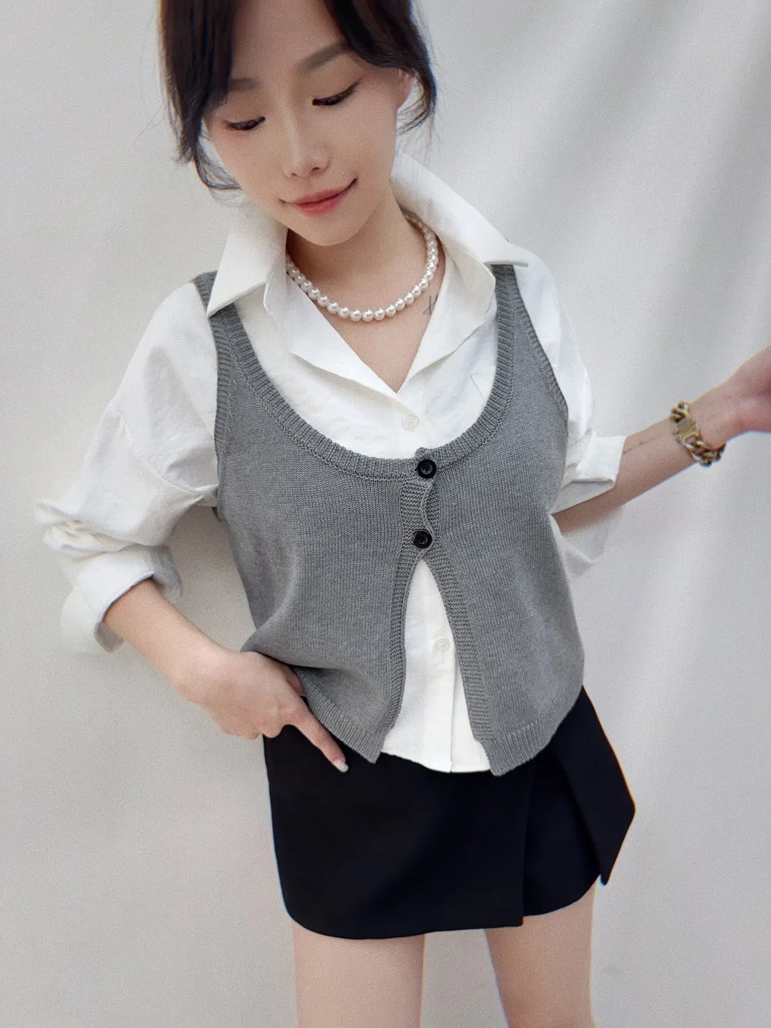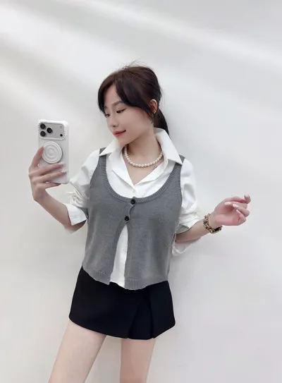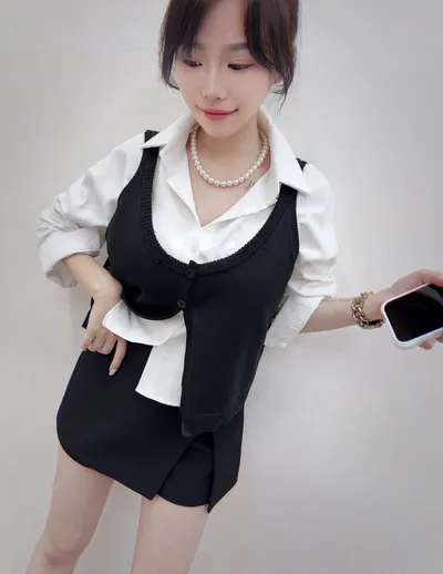 柔軟親膚的針織布料,穿起來舒適又修身卻不緊繃! 襯衫設計不僅修飾脖頸線條 還讓整體看起來更俐落有質感 簡約配色可以駕馭各種風格!簡單配牛仔褲或寬褲就超美 #襯衫 肩寬51 ‘ 胸圍53 ’ 全長47 公分 #針織背心 胸圍46 ‘ 全長45 公分