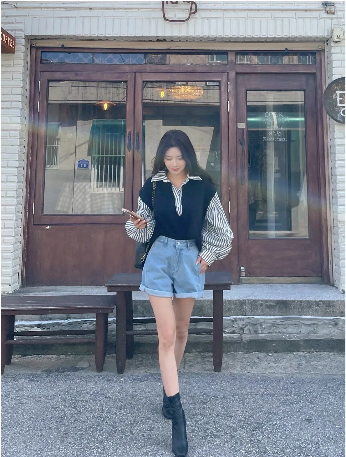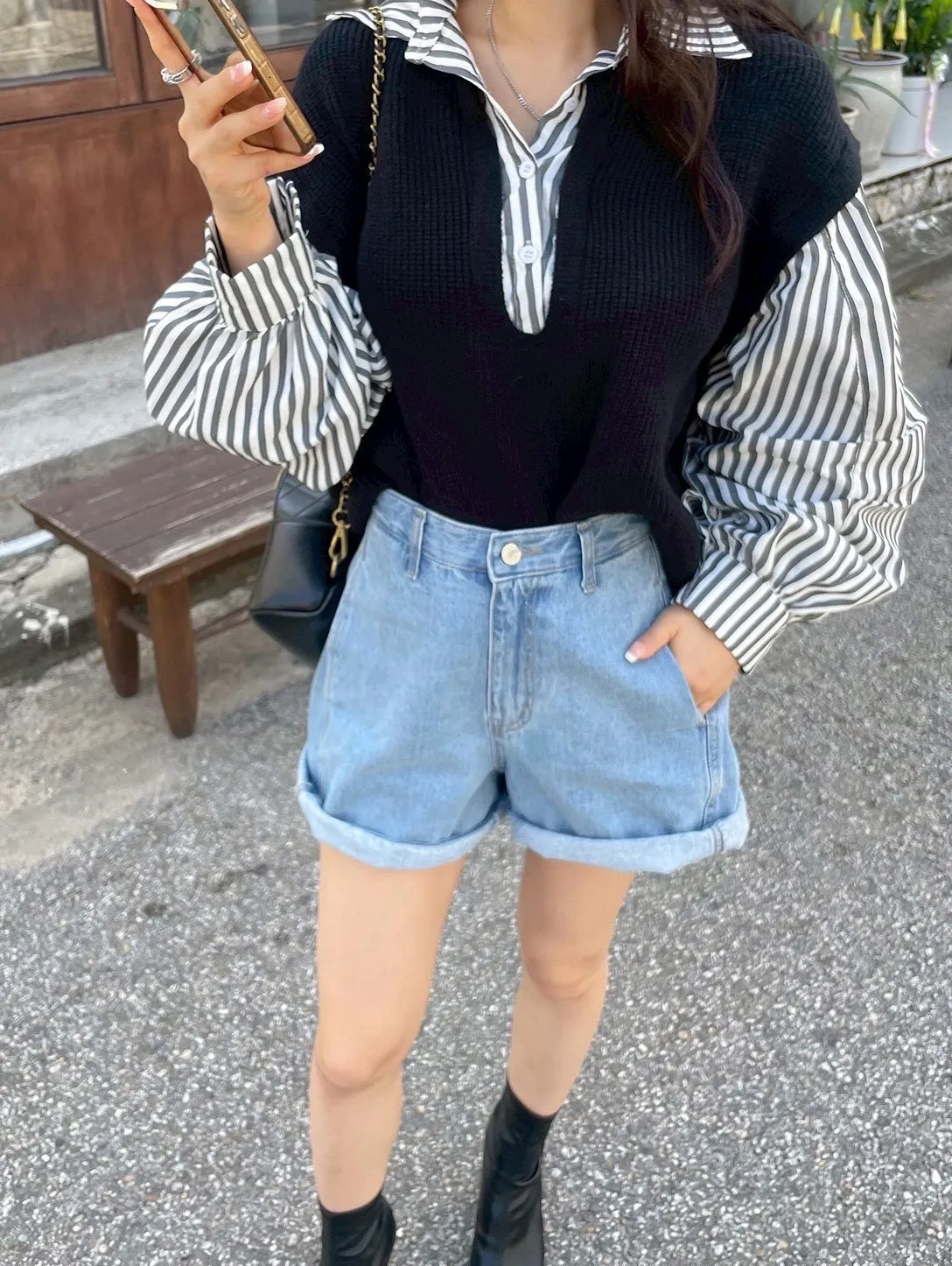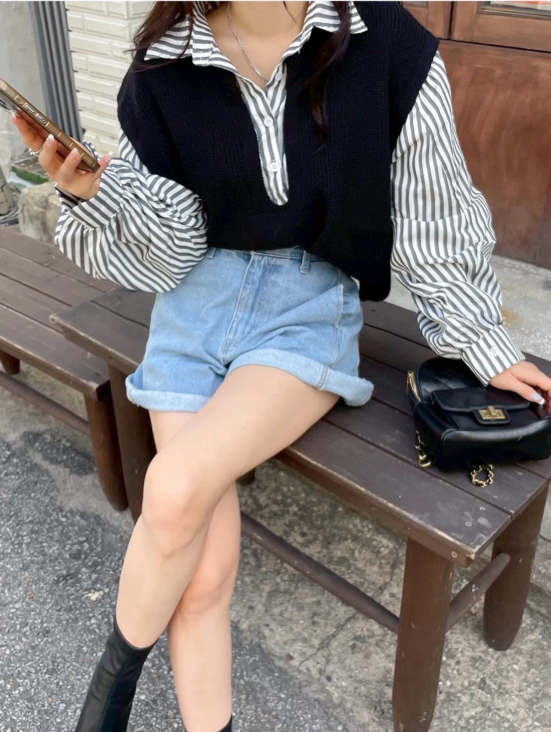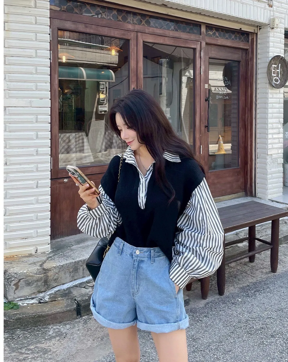 灰色針織背心 + 黑白條紋襯衫的 combo=不張揚但超級有質感 襯衫做出微微蓬袖、稍鬆的領口露出鎖骨整個人的氣質會瞬間變得很法式 背心也不是厚重的那種,而是軟軟的針織垂感隨便紮進褲子 都好看得誇張。 肩寬51/胸寬55/全長58公分