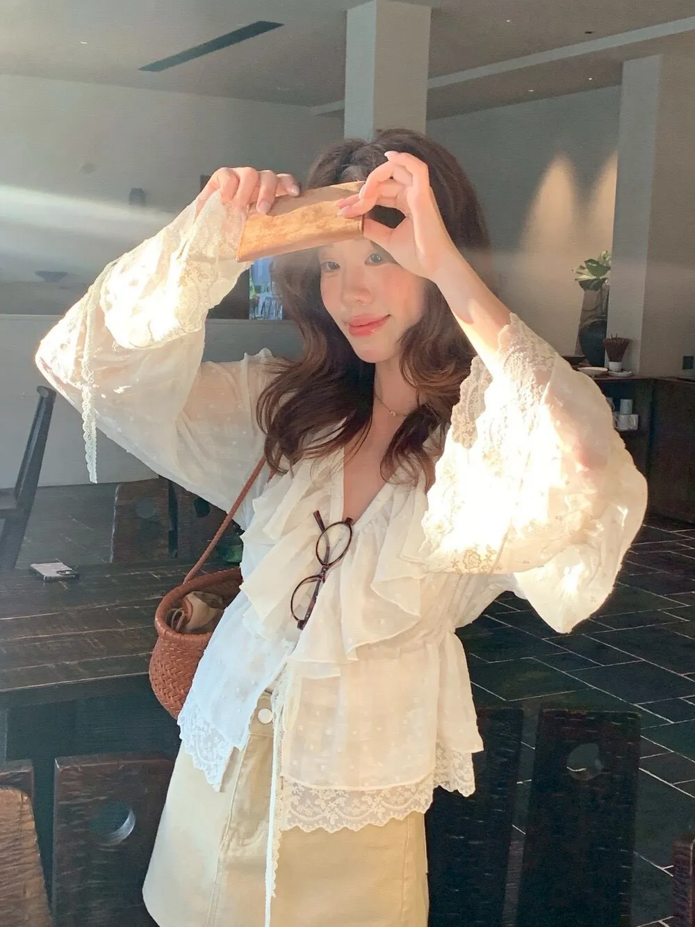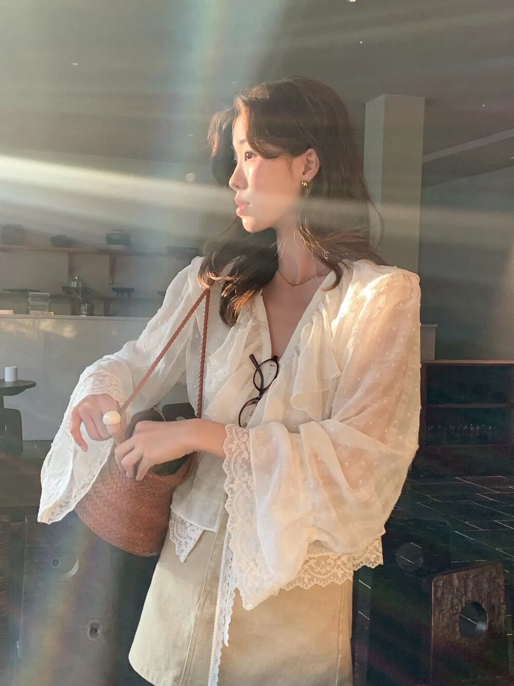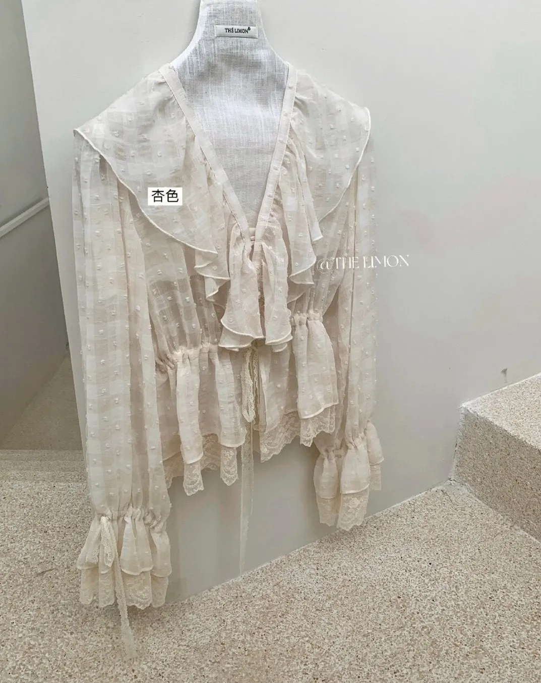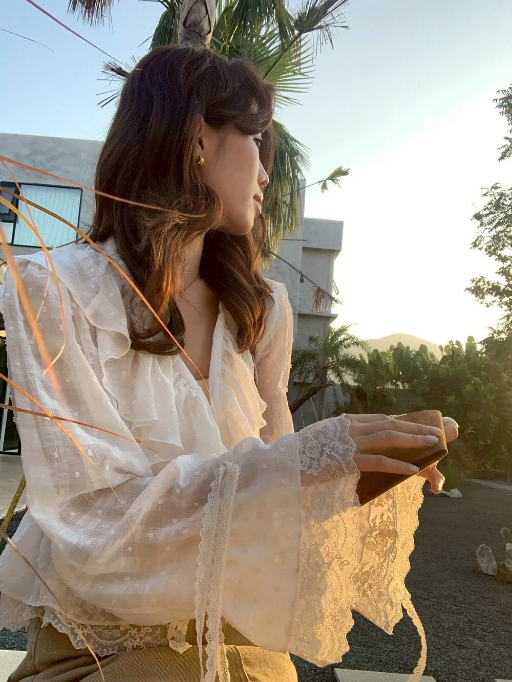 領口跟袖口的荷葉邊做得很細緻,不是那種誇張澎澎感剛剛好的浪漫,有一點法式慵懶的味道近看蕾絲布料細節真的很漂亮! 最喜歡的是它的收腰設計會自然把比例往上拉,整個人看起來更高更瘦,但又不會勒肚子搭牛仔褲是清新少女感,長裙是溫柔小姐姐 布料摸起來是柔軟親膚的材質,不會刺不悶日常約會、姐妹聚會、甚至上班搭個西裝外套都可以尺寸:胸58/全長53公分