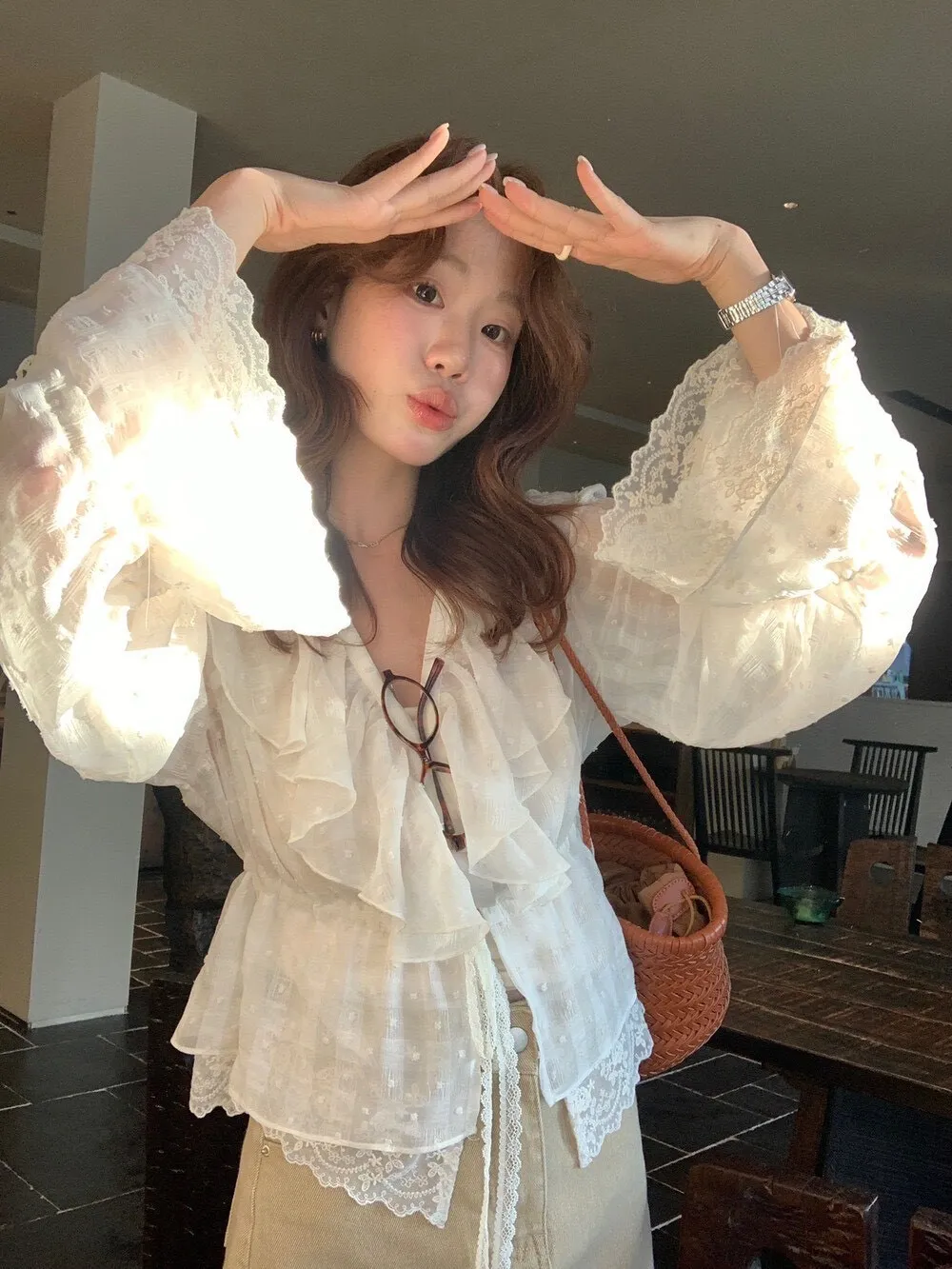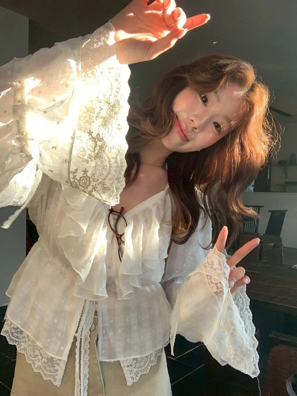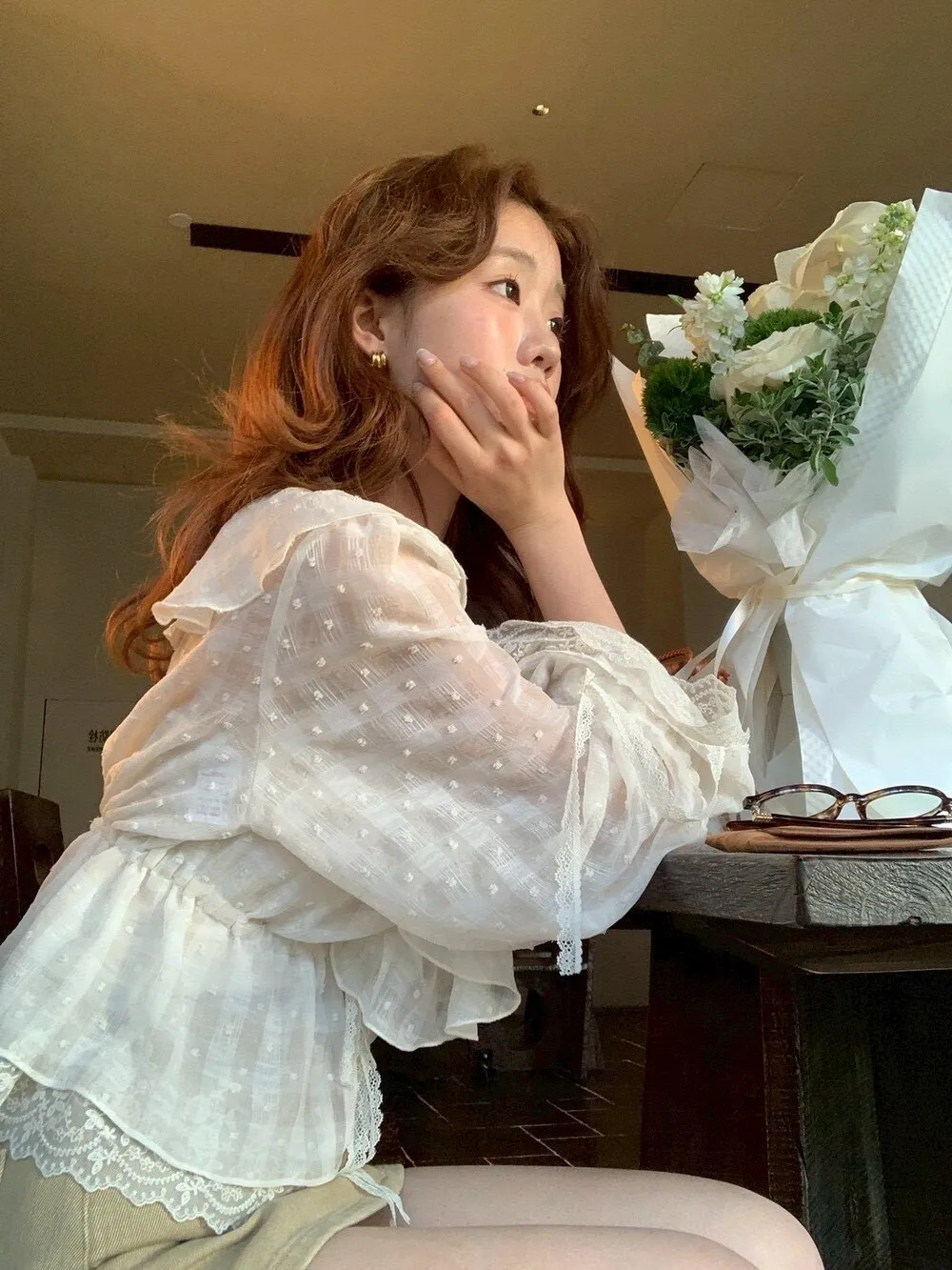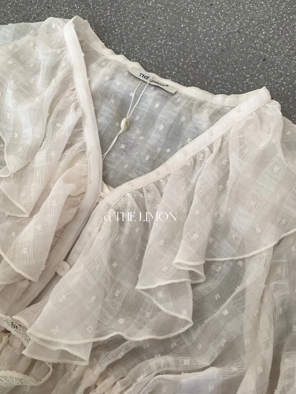 領口跟袖口的荷葉邊做得很細緻,不是那種誇張澎澎感剛剛好的浪漫,有一點法式慵懶的味道近看蕾絲布料細節真的很漂亮! 最喜歡的是它的收腰設計會自然把比例往上拉,整個人看起來更高更瘦,但又不會勒肚子搭牛仔褲是清新少女感,長裙是溫柔小姐姐 布料摸起來是柔軟親膚的材質,不會刺不悶日常約會、姐妹聚會、甚至上班搭個西裝外套都可以尺寸:胸58/全長53公分