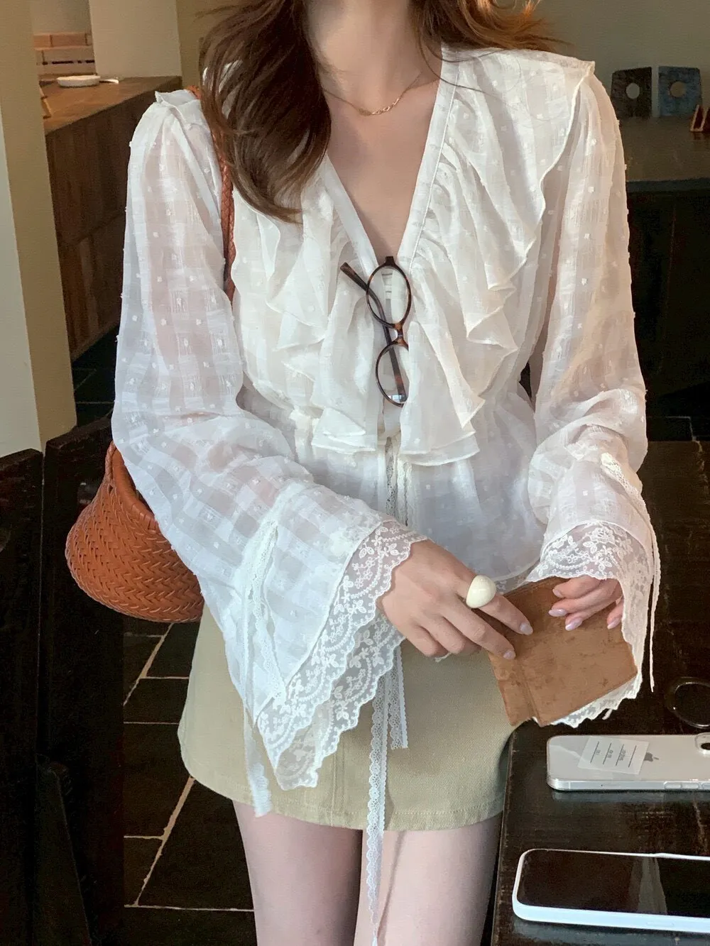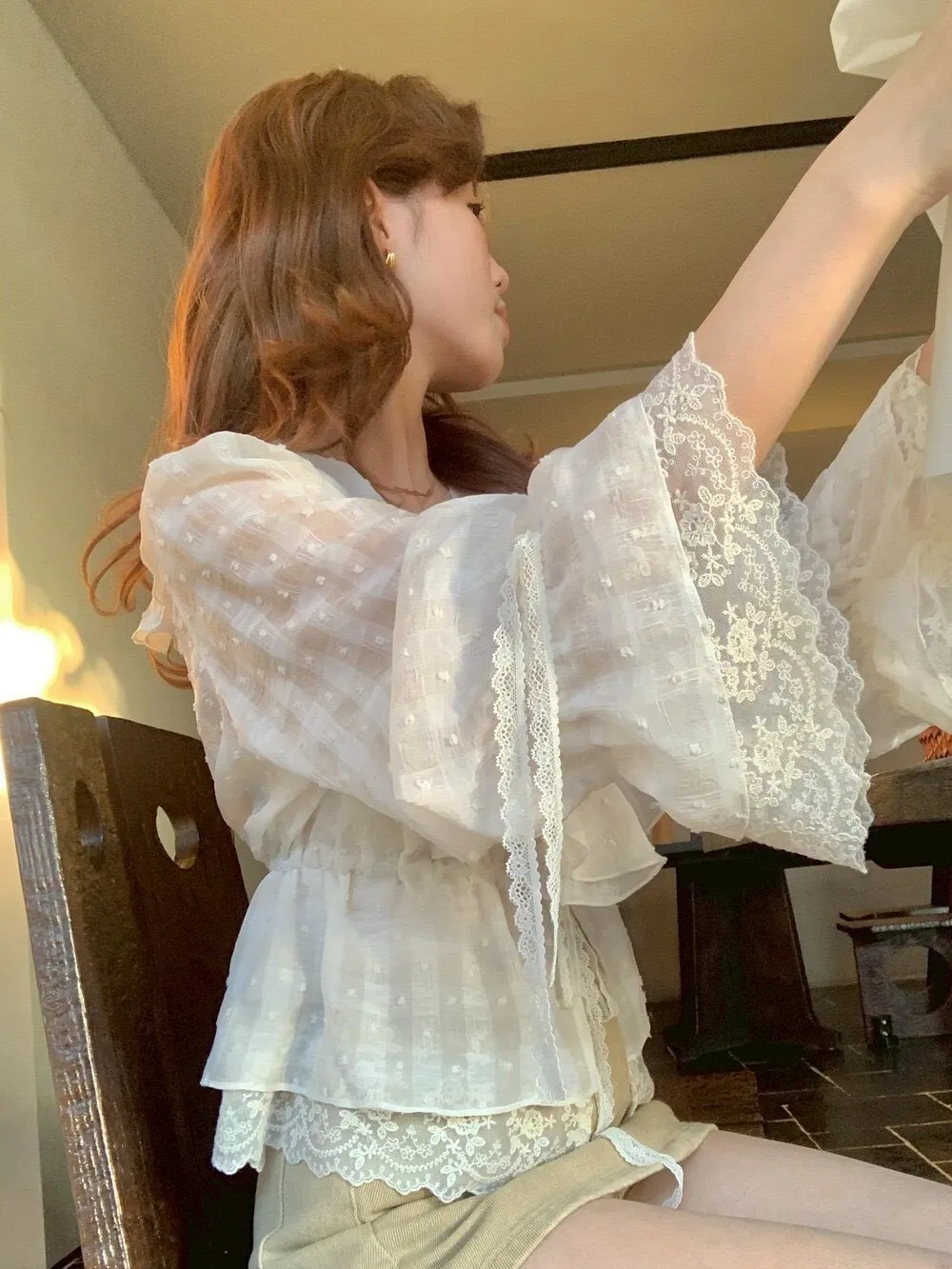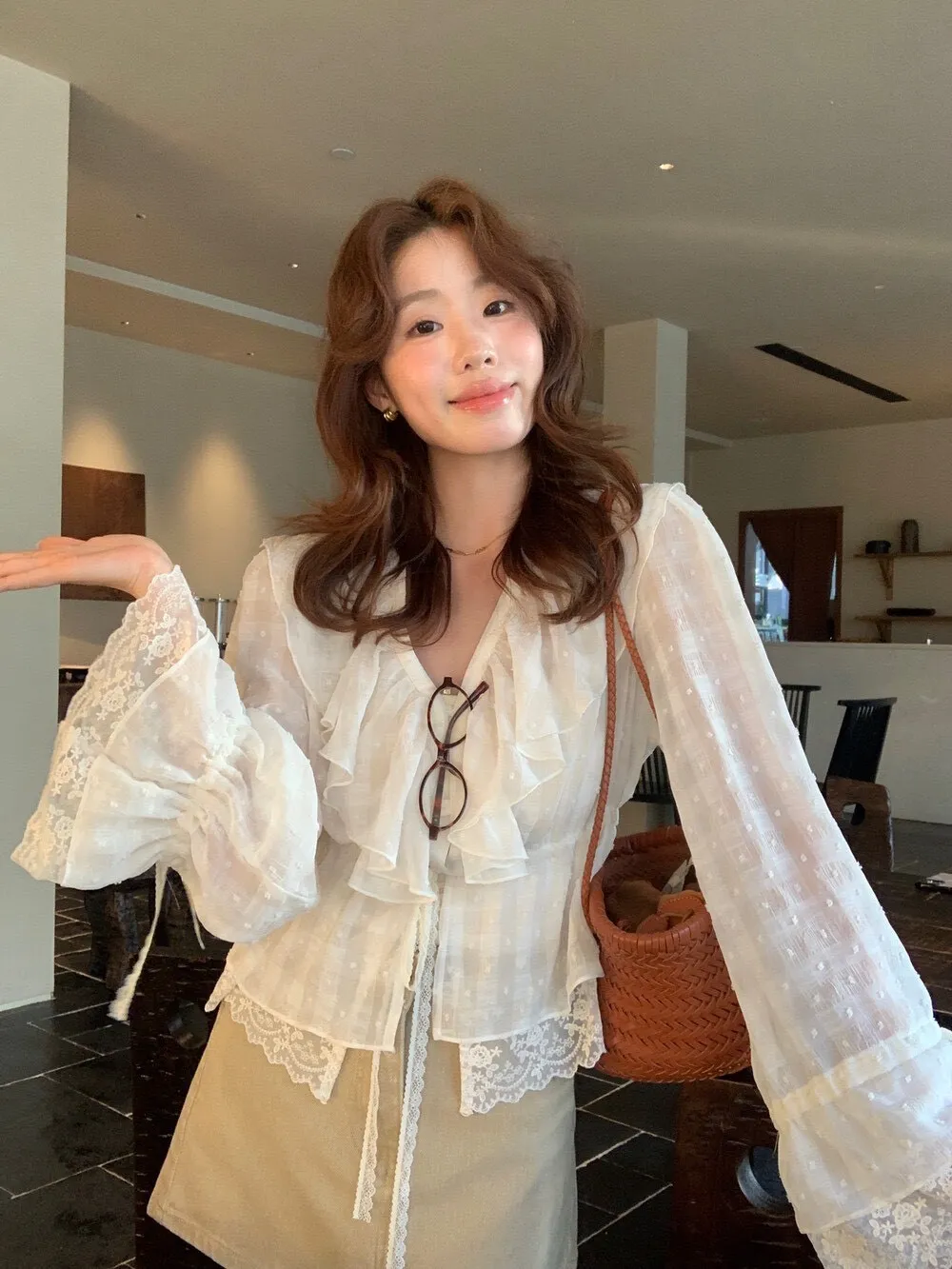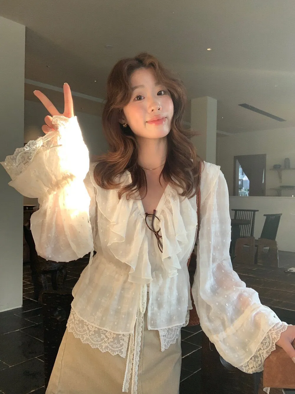 領口跟袖口的荷葉邊做得很細緻,不是那種誇張澎澎感剛剛好的浪漫,有一點法式慵懶的味道近看蕾絲布料細節真的很漂亮! 最喜歡的是它的收腰設計會自然把比例往上拉,整個人看起來更高更瘦,但又不會勒肚子搭牛仔褲是清新少女感,長裙是溫柔小姐姐 布料摸起來是柔軟親膚的材質,不會刺不悶日常約會、姐妹聚會、甚至上班搭個西裝外套都可以尺寸:胸58/全長53公分