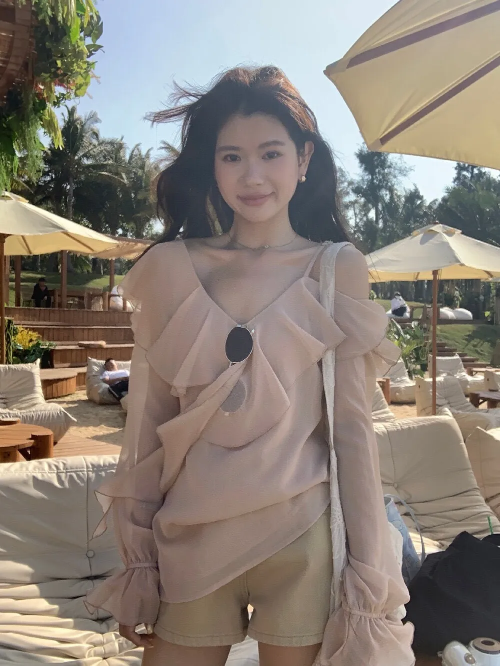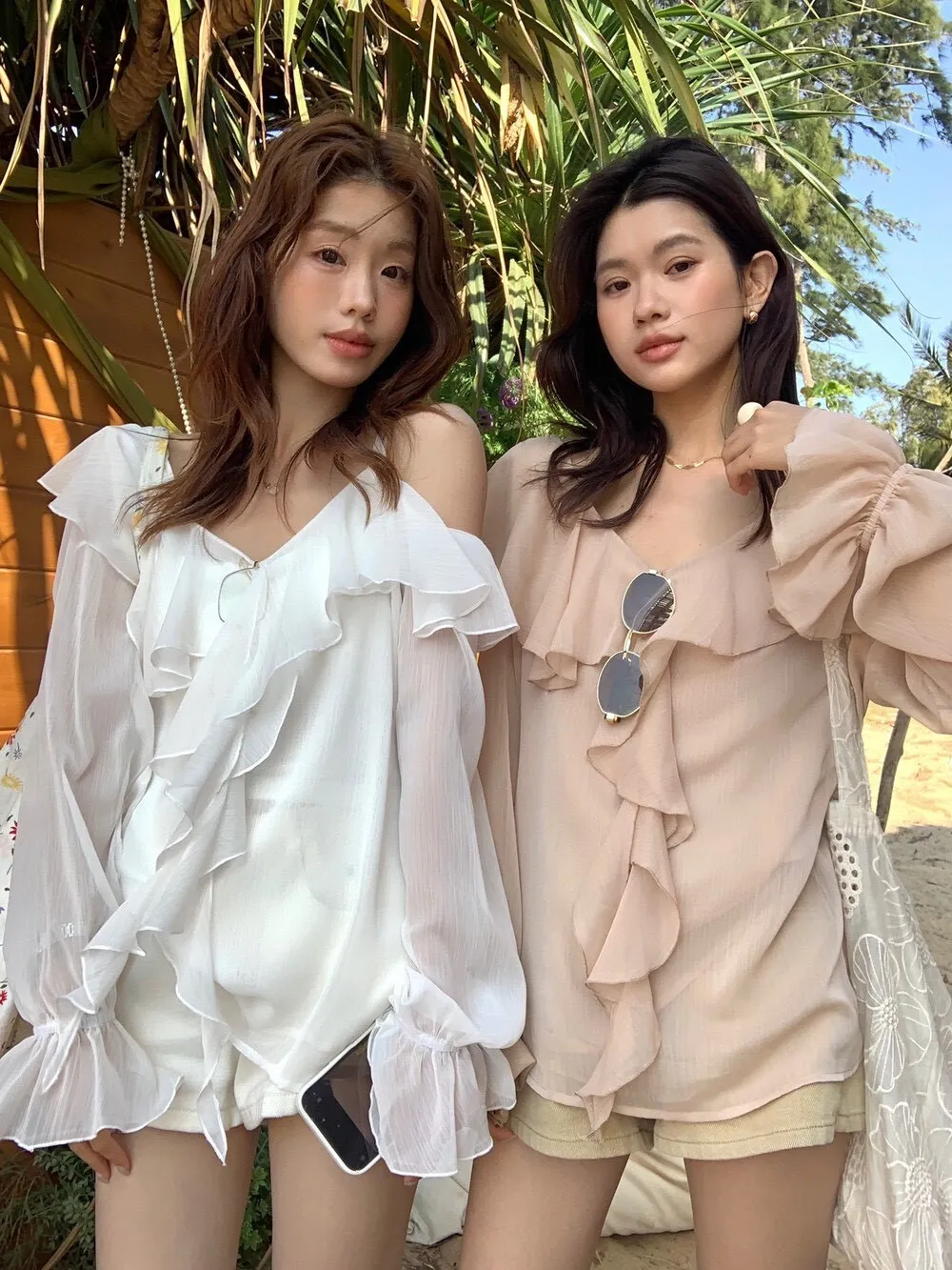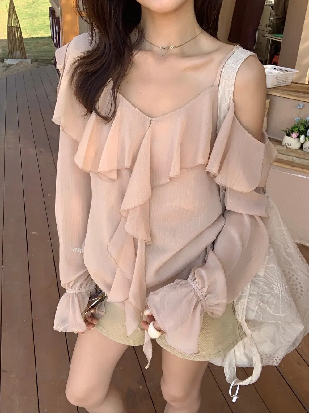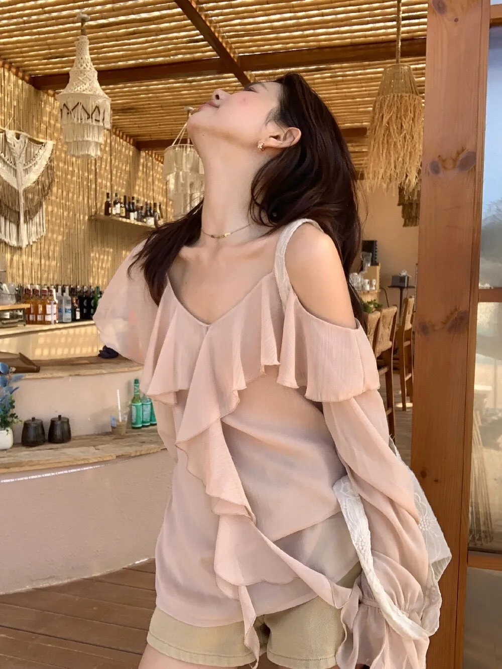 真的很美穿上自帶溫柔濾鏡雪紡V領+小波浪荷葉設計穿起來超顯臉小 微透輕柔雪紡材質 隨意搭配都是女神感 飄逸落肩袖輕鬆修飾手臂線條 清涼感夏日氛圍 怎麼穿怎麼美 本身就好看到不行 搭短褲長褲短裙長裙褲裙寬褲什麼都可以喔 尺寸:胸51/全長62公分