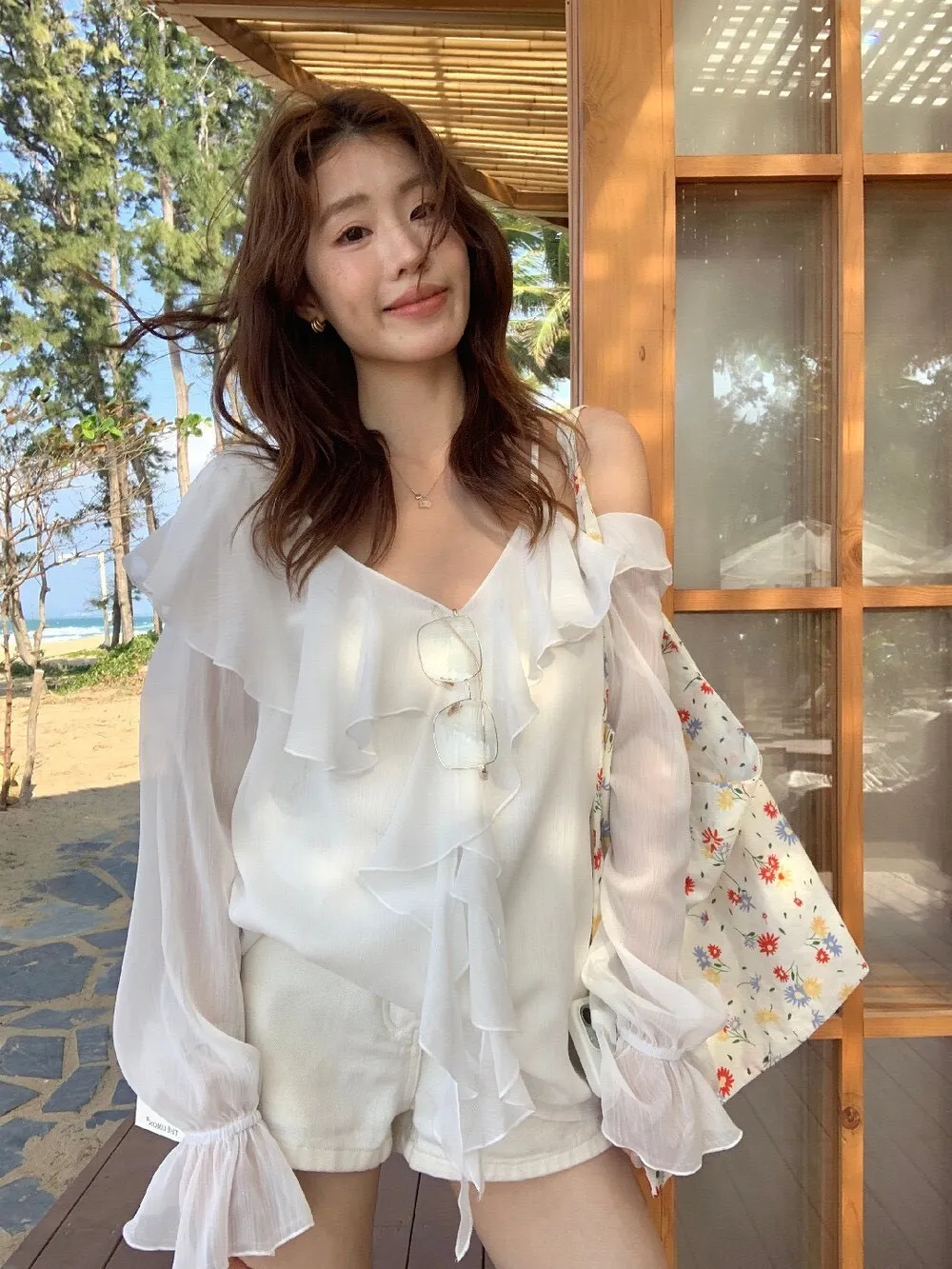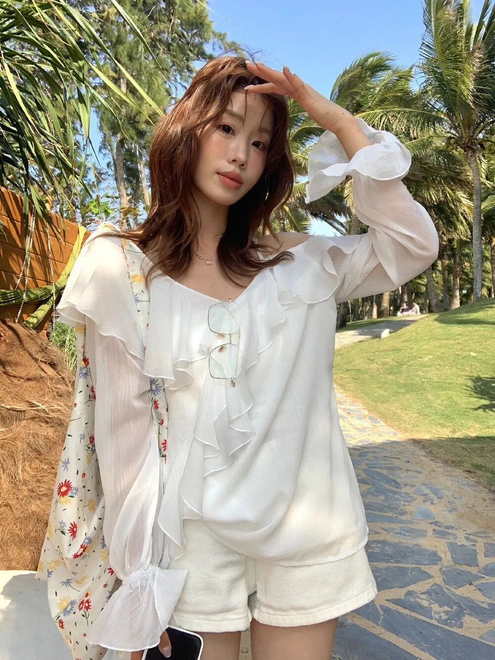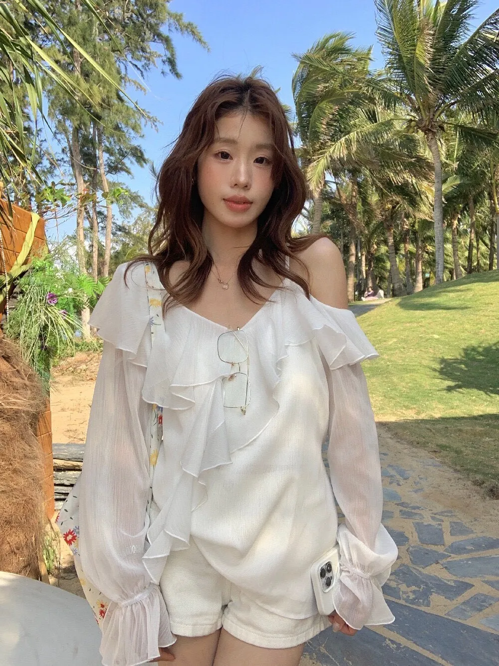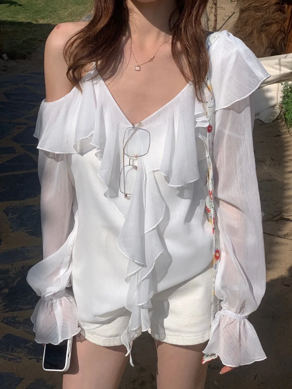 真的很美穿上自帶溫柔濾鏡雪紡V領+小波浪荷葉設計穿起來超顯臉小 微透輕柔雪紡材質 隨意搭配都是女神感 飄逸落肩袖輕鬆修飾手臂線條 清涼感夏日氛圍 怎麼穿怎麼美 本身就好看到不行 搭短褲長褲短裙長裙褲裙寬褲什麼都可以喔 尺寸:胸51/全長62公分
