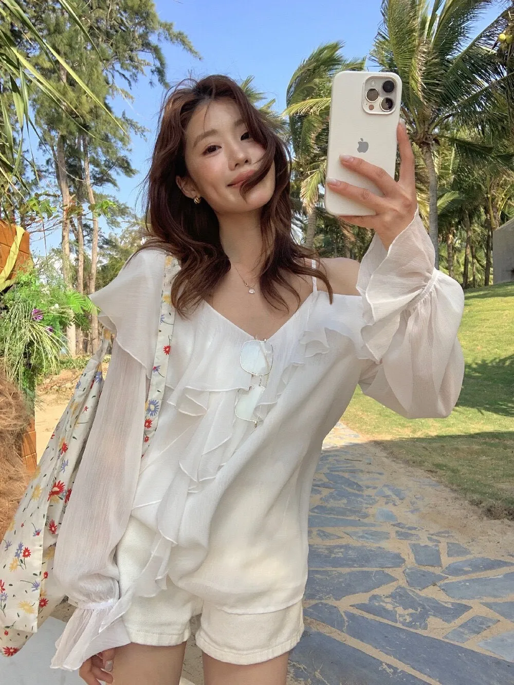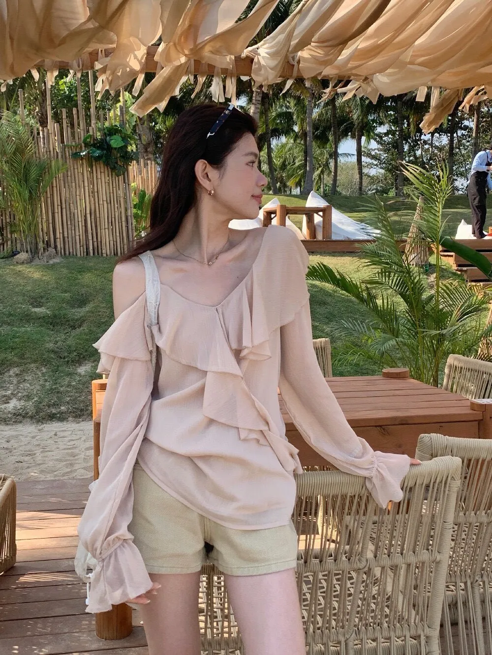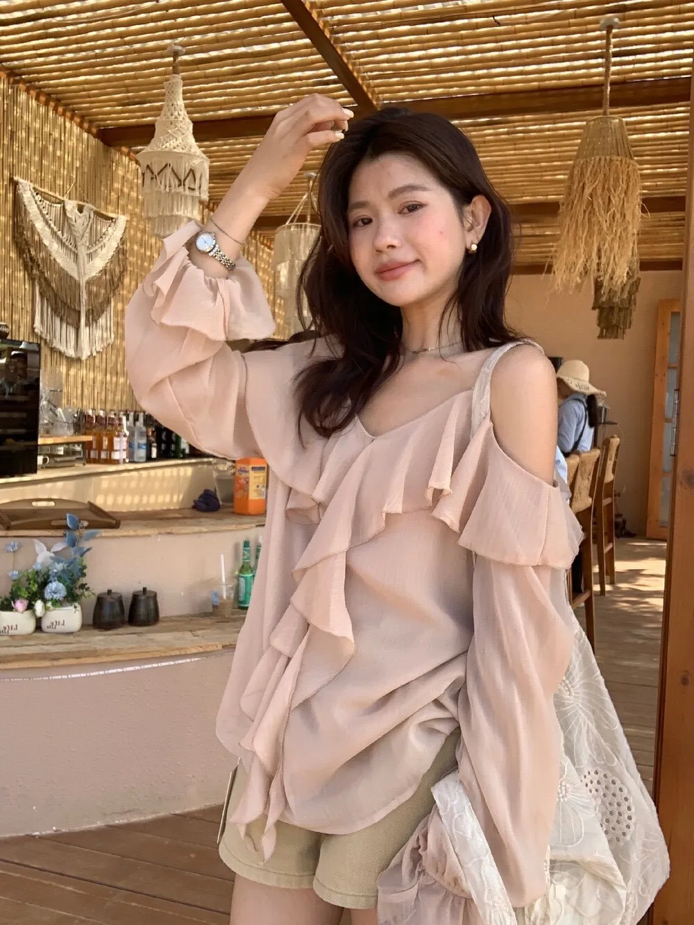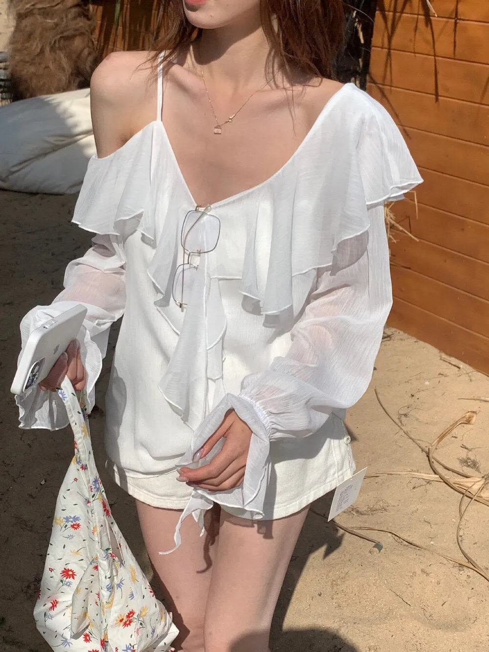 真的很美穿上自帶溫柔濾鏡雪紡V領+小波浪荷葉設計穿起來超顯臉小 微透輕柔雪紡材質 隨意搭配都是女神感 飄逸落肩袖輕鬆修飾手臂線條 清涼感夏日氛圍 怎麼穿怎麼美 本身就好看到不行 搭短褲長褲短裙長裙褲裙寬褲什麼都可以喔 尺寸:胸51/全長62公分