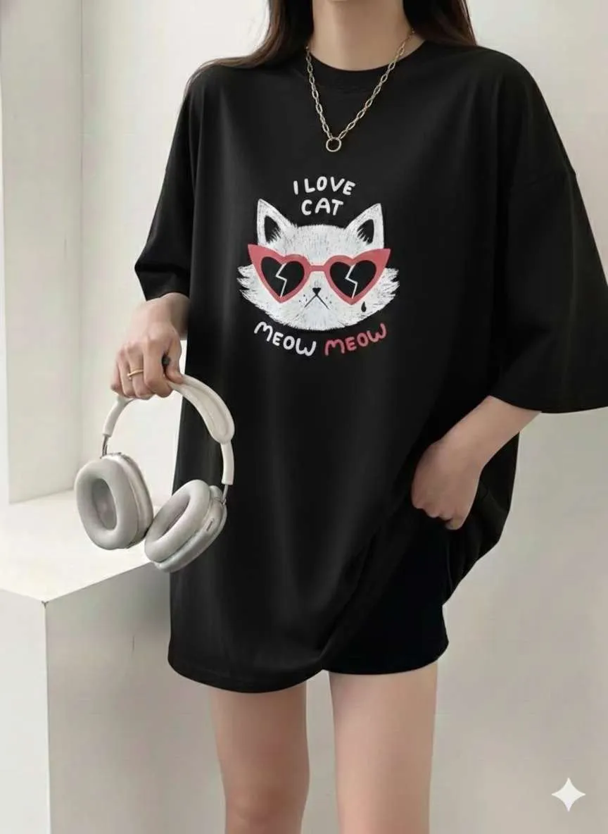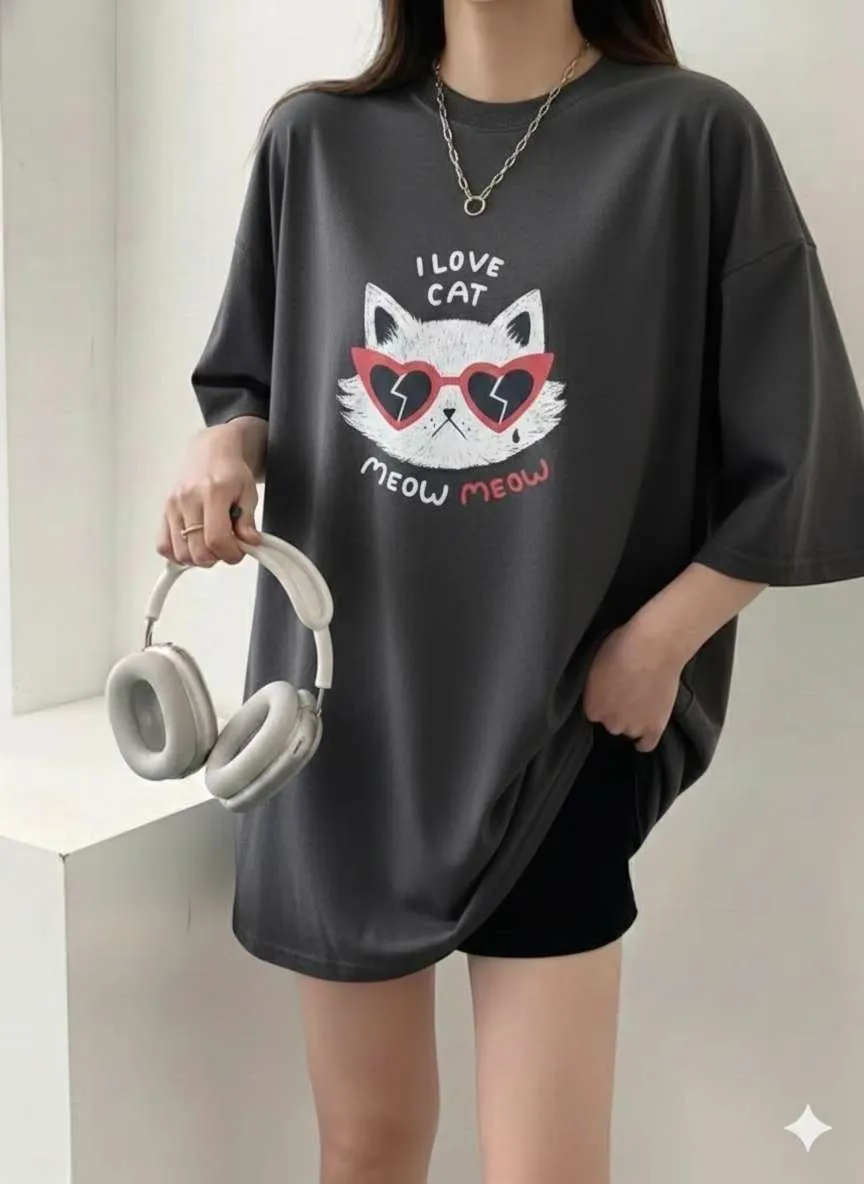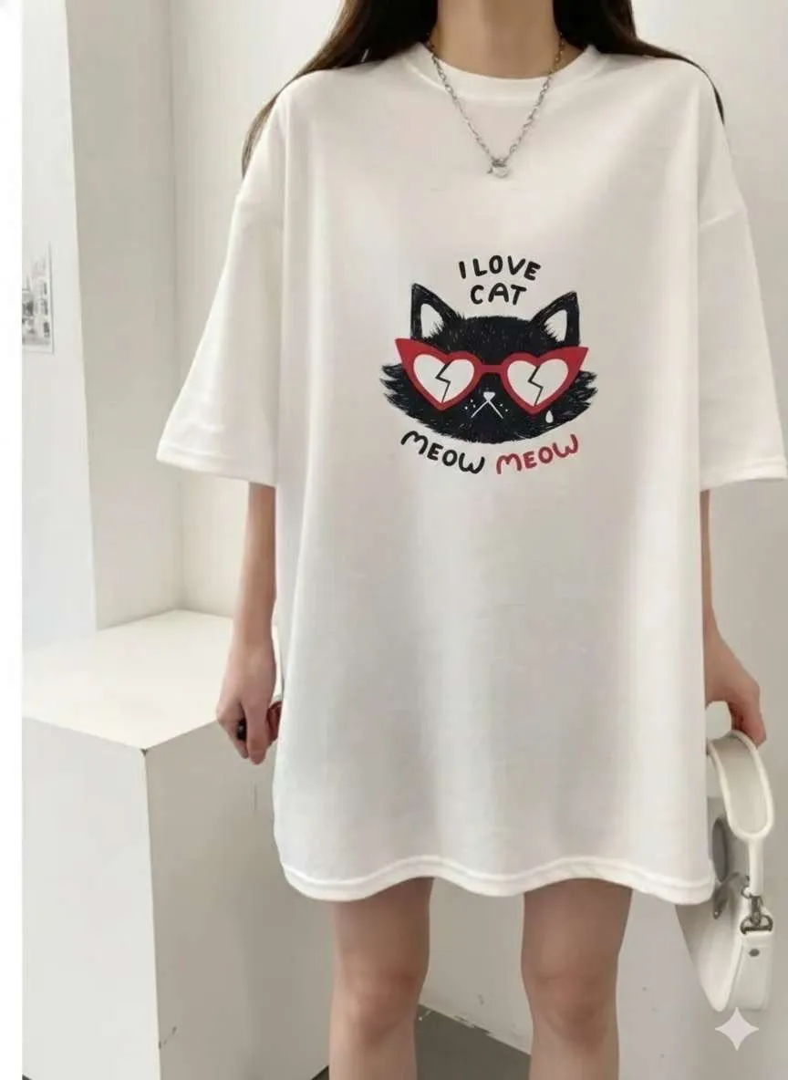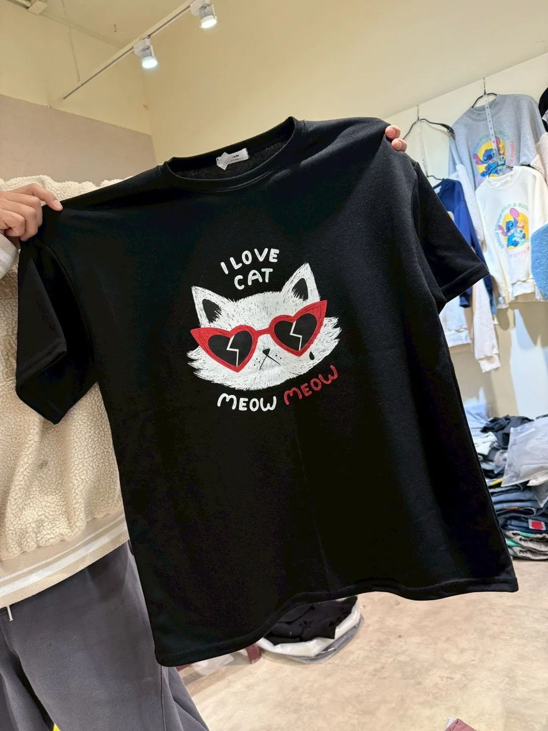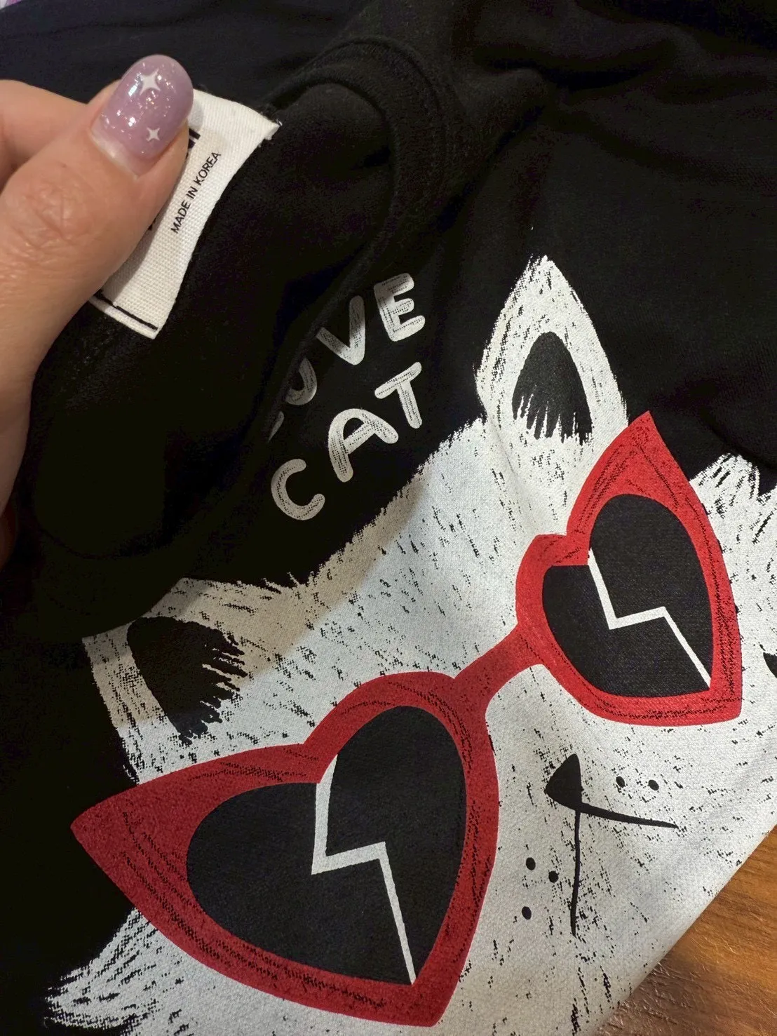戴著愛心墨鏡的小貓咪, 中間還有閃電愛心設計,整件多了一點俏皮個性 韓系很流行的寬鬆長版T 慵懶感滿滿 隨便穿就有一種很輕鬆的韓系休閒感布料是中薄軟棉質,透氣又舒服 顏色:黑色、白色、墨色 尺寸:肩56、胸60、長75cm