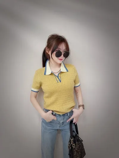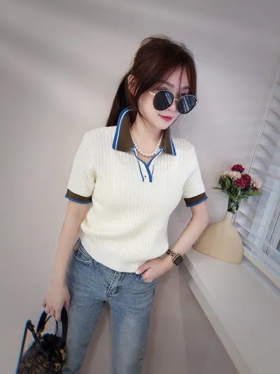 撞色條紋領麻花捲針織上衣