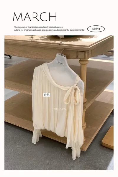 法式不規則斜肩流光絲系帶衫(杏)
