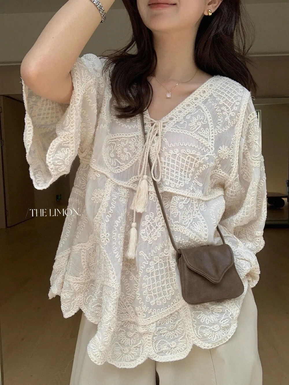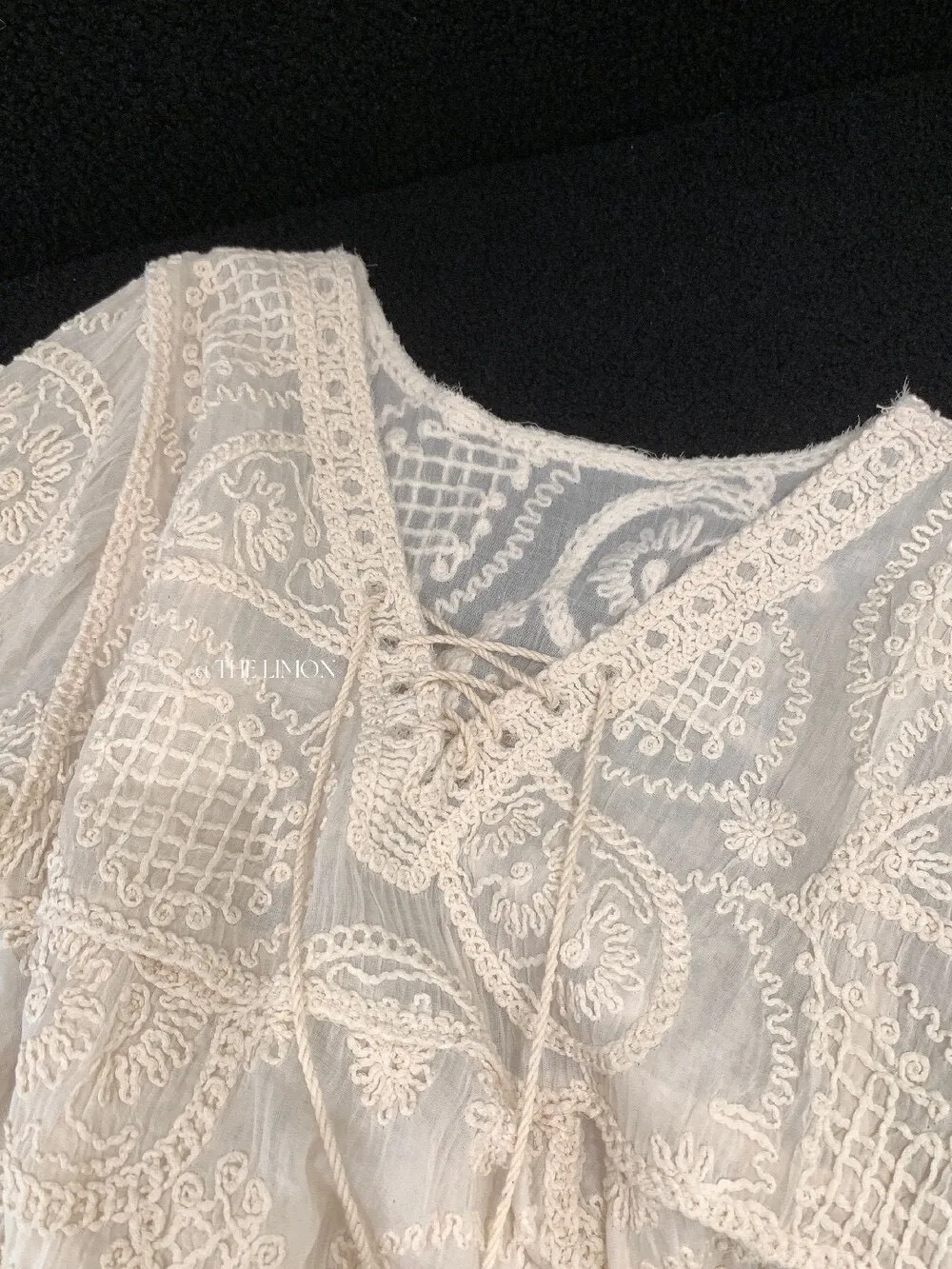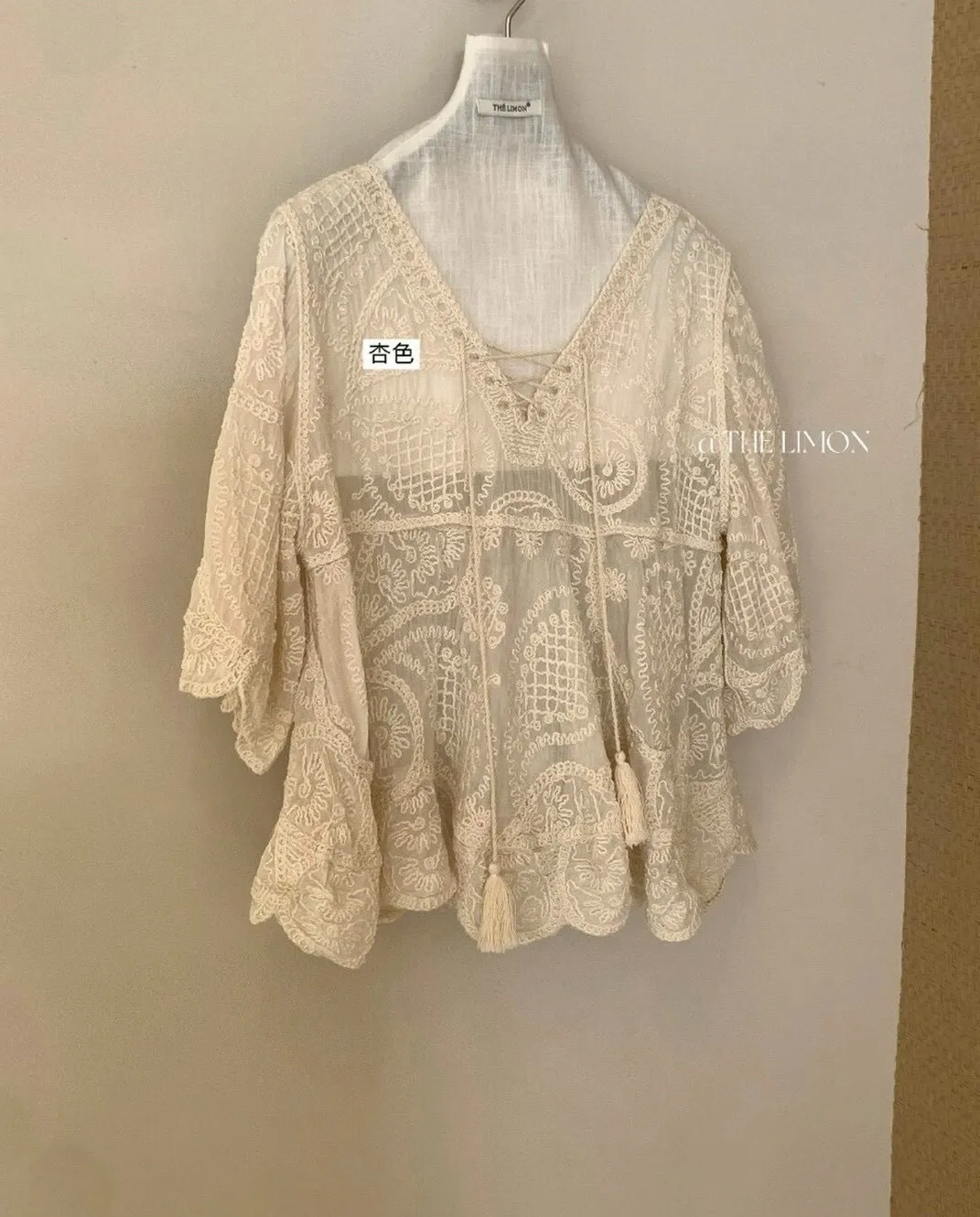 重工刺繡和蕾絲細節,正面有流蘇綁帶