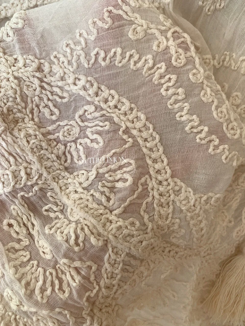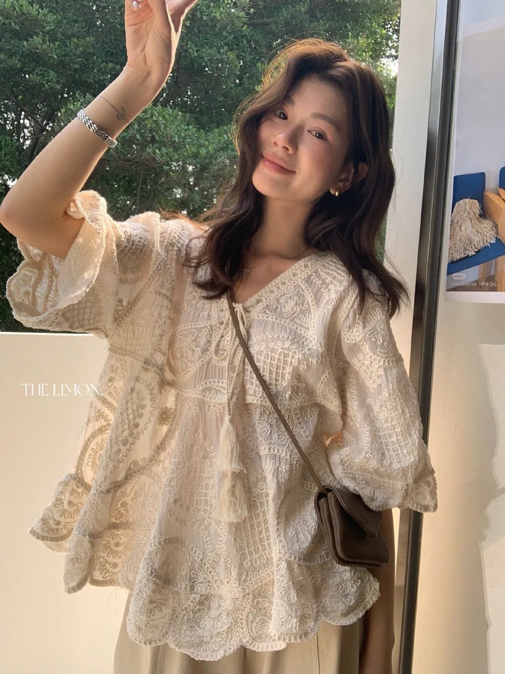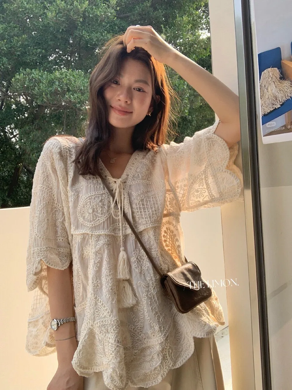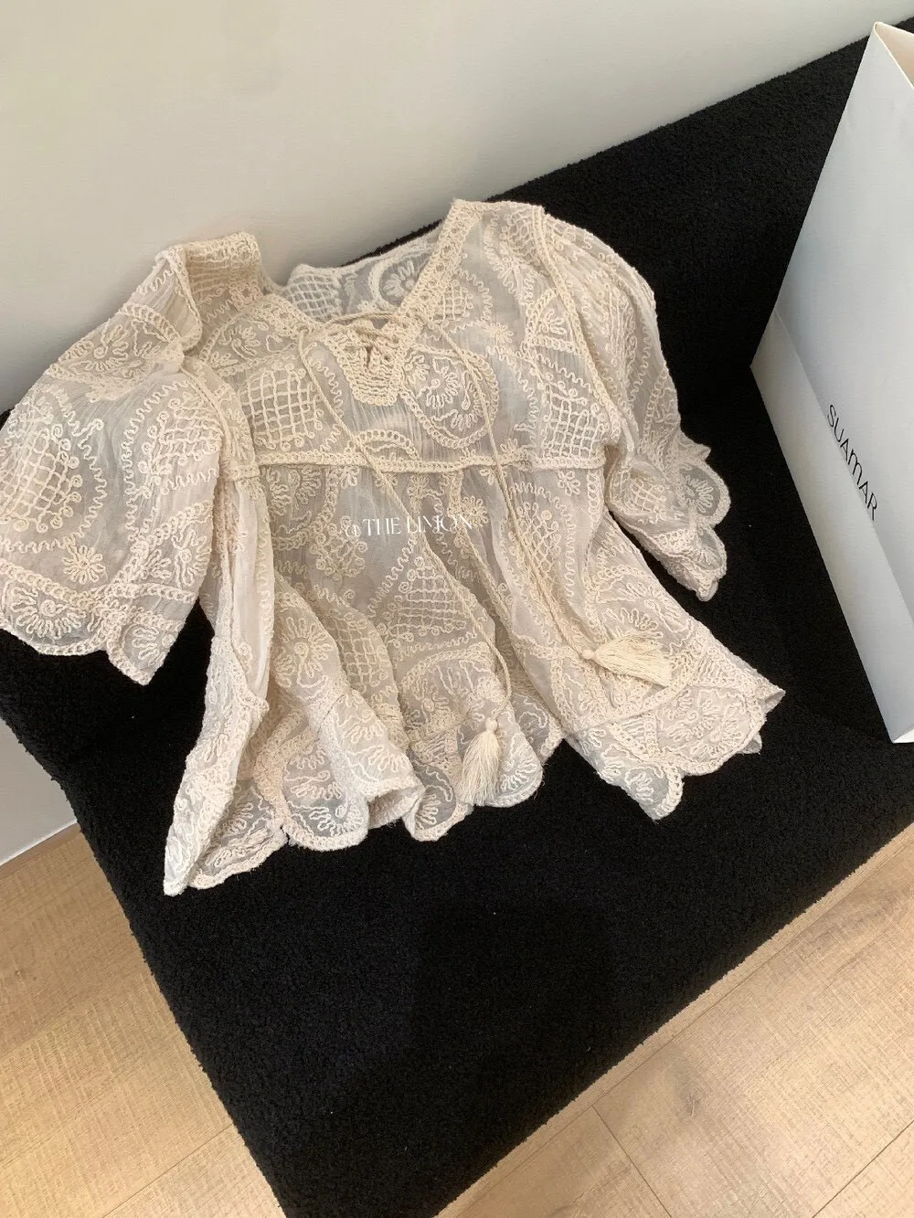 重工刺繡和蕾絲細節,正面有流蘇綁帶