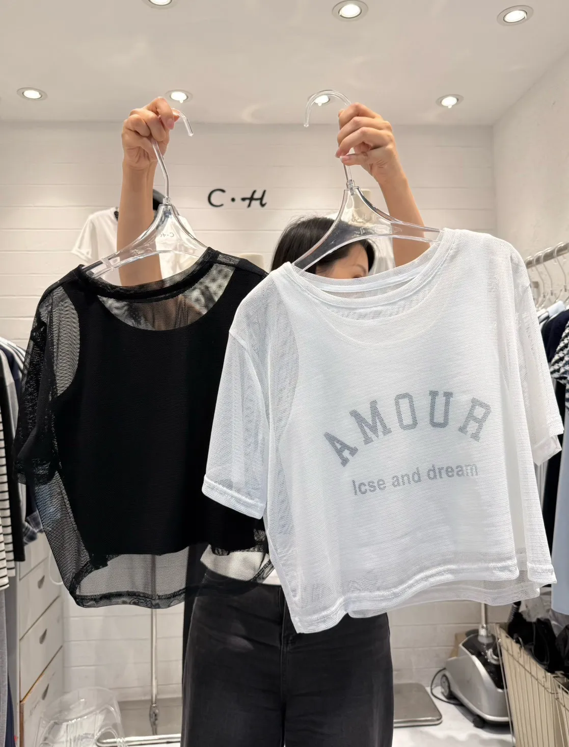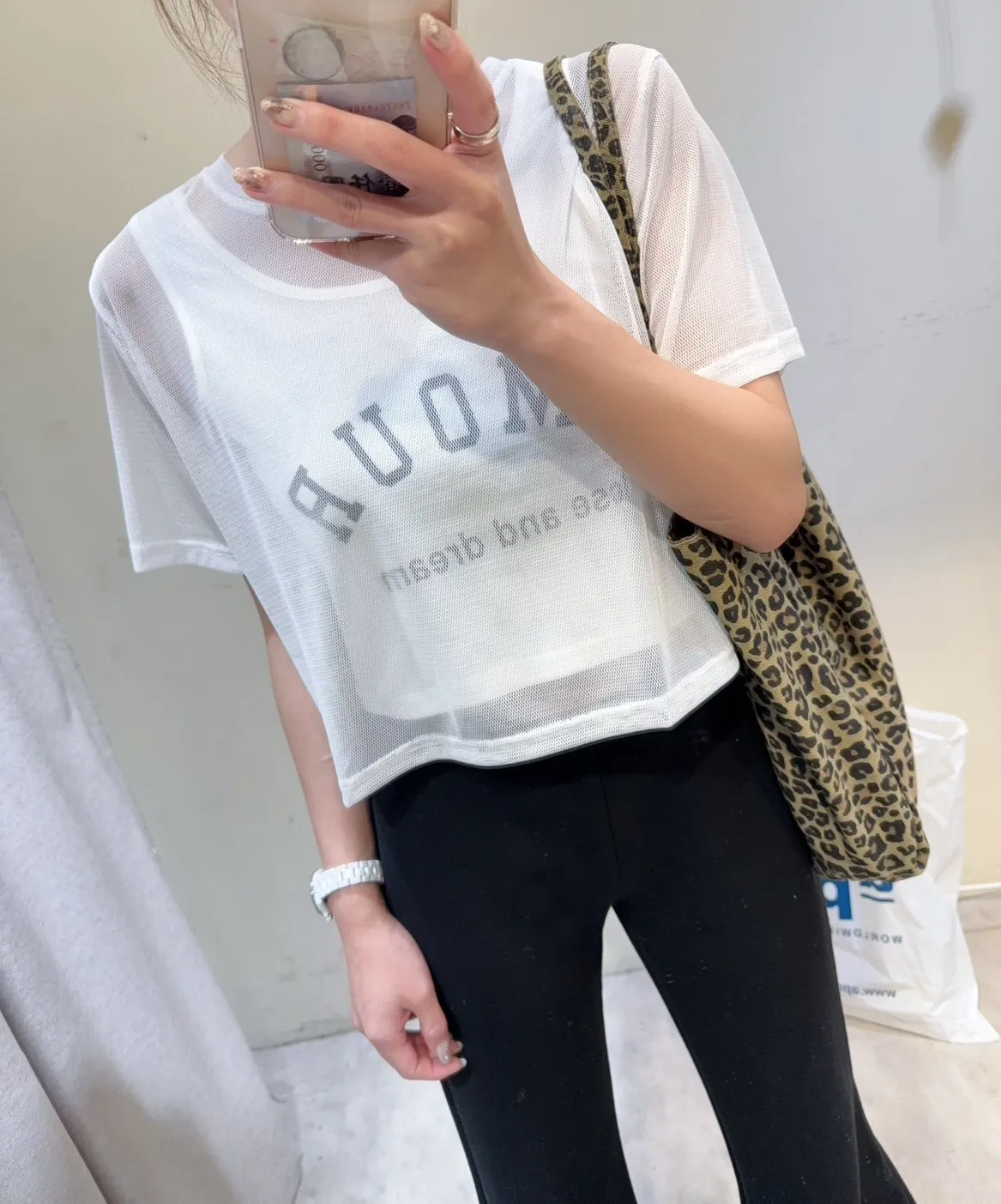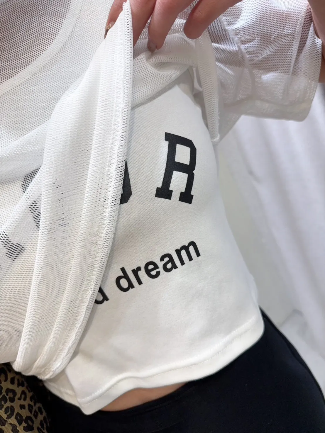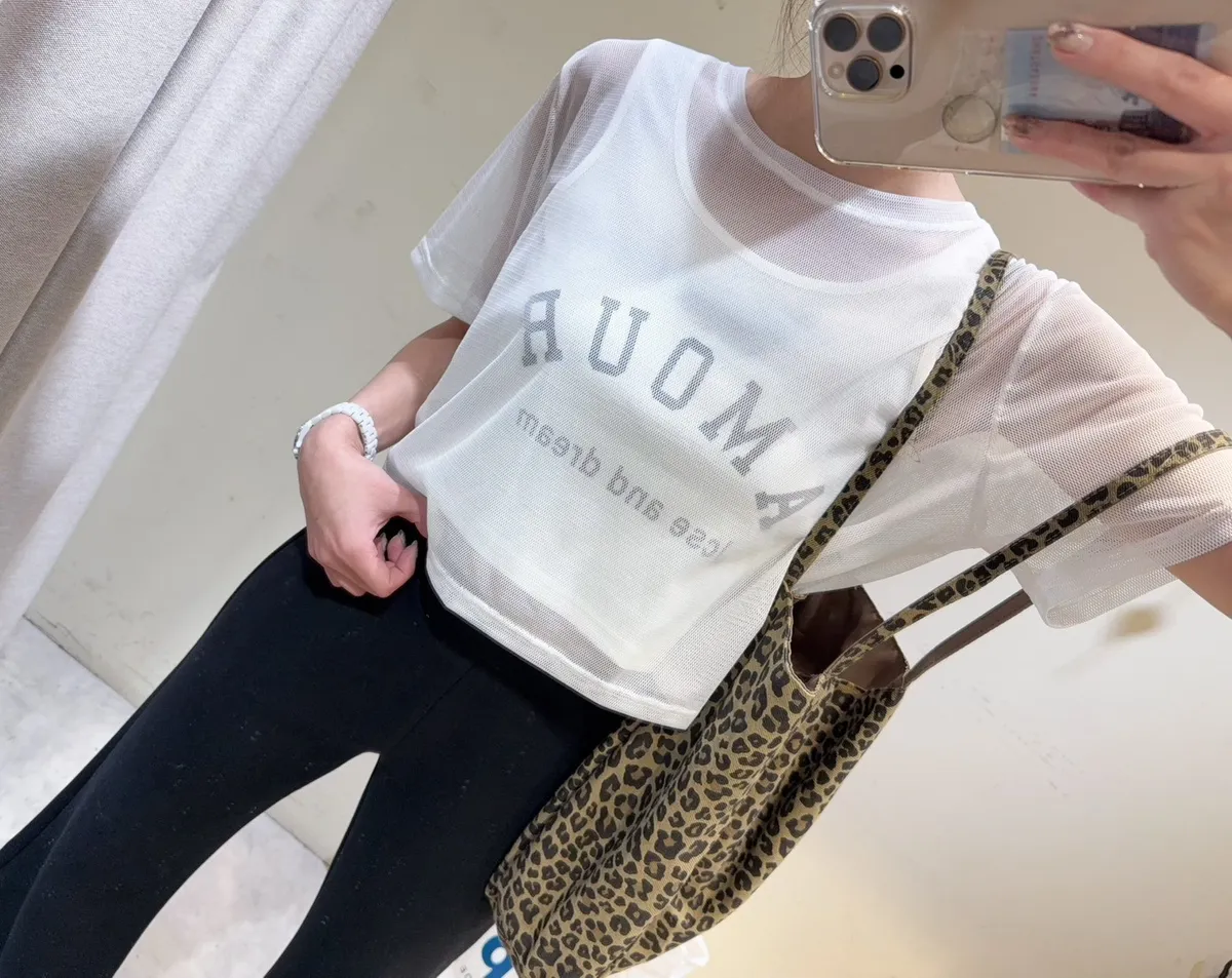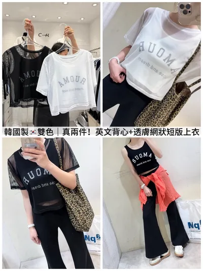 外層是輕薄的透膚網狀短版上衣,微微透感讓整體多了一點小性感