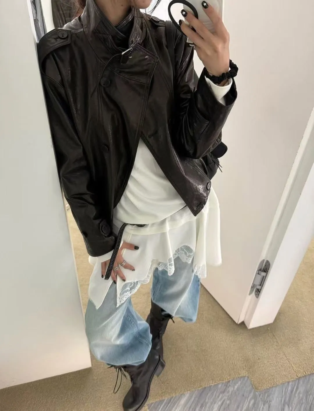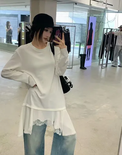 #一件就把層次感拉滿的內搭王今年韓國KOL / 韓劇女主都有穿的蕾絲內搭 這件就是韓系穿搭裡最關鍵的那一層 上身是簡約素面長袖棉質,下擺拼接輕柔雪紡+蕾絲,不用多想搭配,隨便套在皮衣、針織、外套裡,整套穿搭立刻有層次、有細節。 版型是長版順身但不貼,遮腹、修身、比例直接變好,單穿、內搭都成立,是那種衣櫃一定會一直拿出來穿的款。 假兩件疊穿設計 → 一件完成韓系層次 雪紡+蕾絲下擺 → 細節感很高、不廉價 長版剪裁 → 修飾身形、顯比例 內搭神器 → 外套、背心、皮衣都能配 建議尺寸:可穿到L