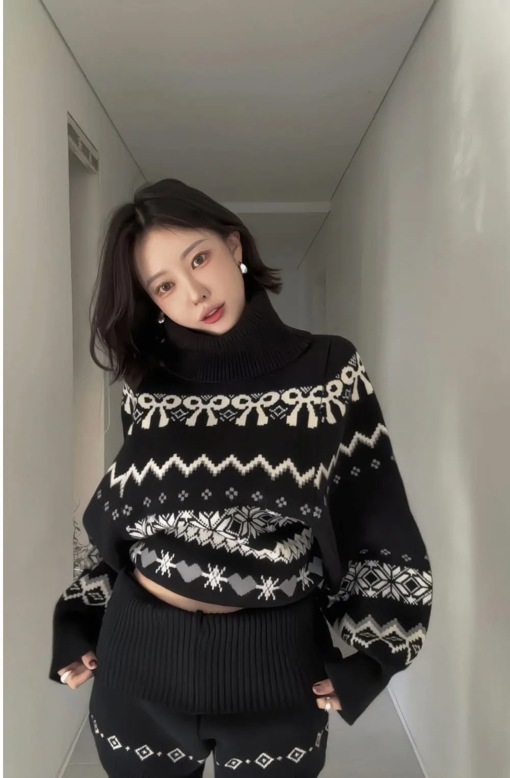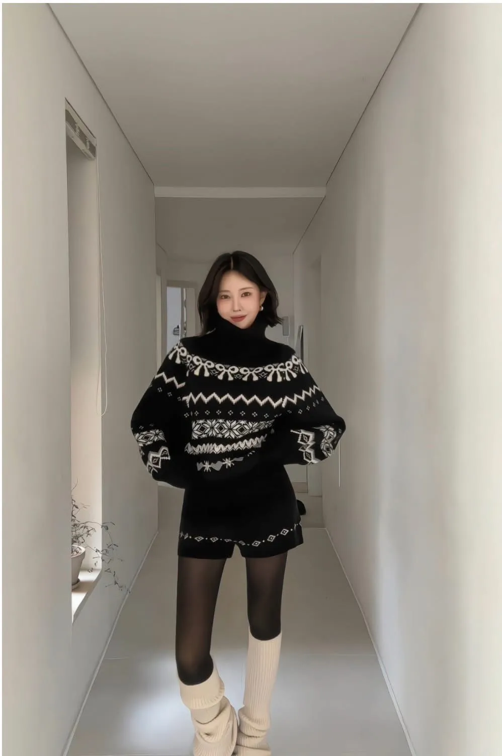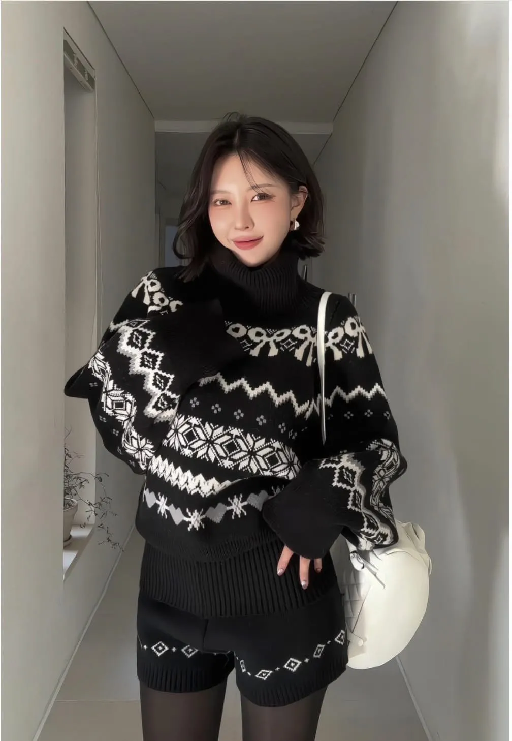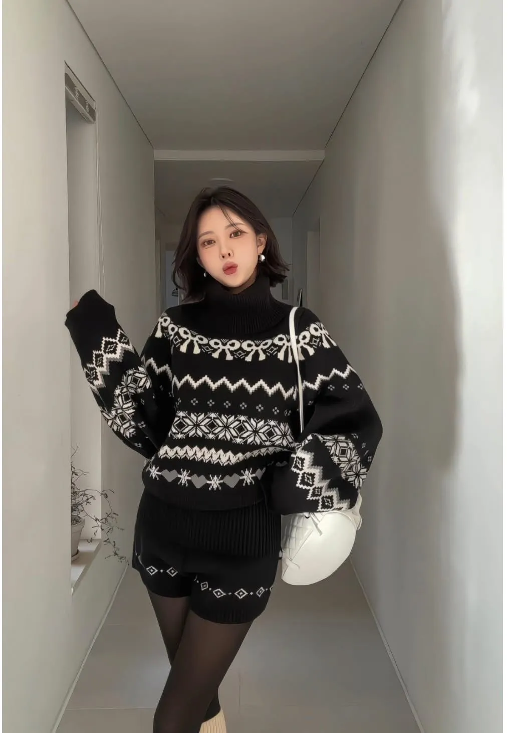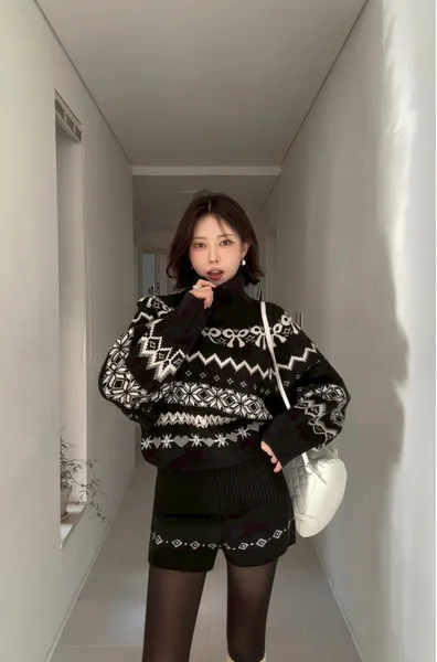 這套真的會被多看兩眼🤍🖤 圖騰很有存在感,但配色乾淨不老氣雪花/ 蝴蝶結都是滿滿的冬日元素高領的設計溫暖也是小臉造型 上衣+短褲 整套穿超方便 ✔️ 針織有彈性,穿起來不緊繃 ✔️ 單穿或拆開搭都很強 冬天配黑絲襪+靴子,氣質又有高級感搭配雪靴毛毛鞋 看起來又是可愛溫暖的氛圍尺寸全長61/肩寬33/胸47 公分褲子建議S~L號尺寸穿著