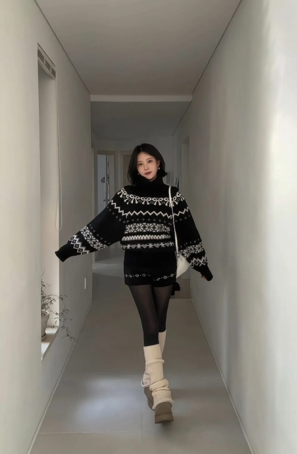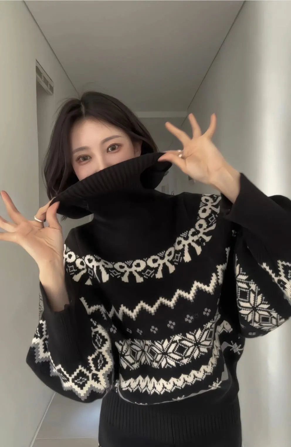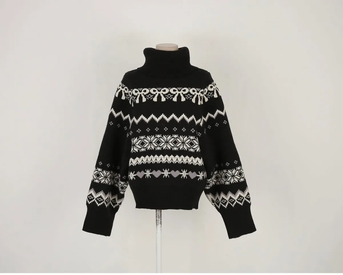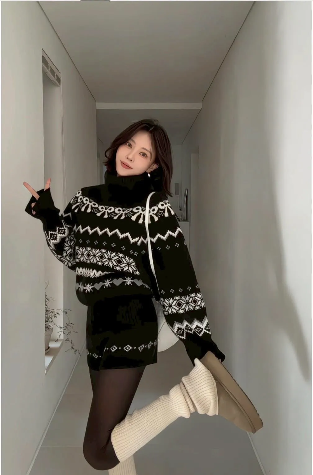 這套真的會被多看兩眼🤍🖤 圖騰很有存在感,但配色乾淨不老氣雪花/ 蝴蝶結都是滿滿的冬日元素高領的設計溫暖也是小臉造型 上衣+短褲 整套穿超方便 ✔️ 針織有彈性,穿起來不緊繃 ✔️ 單穿或拆開搭都很強 冬天配黑絲襪+靴子,氣質又有高級感搭配雪靴毛毛鞋 看起來又是可愛溫暖的氛圍尺寸全長61/肩寬33/胸47 公分褲子建議S~L號尺寸穿著