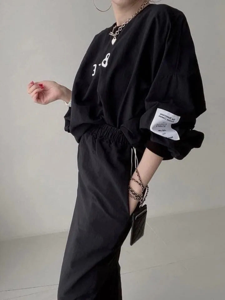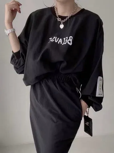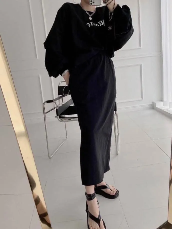 沙沙布兩件式上衣+長裙套裝(黑)
