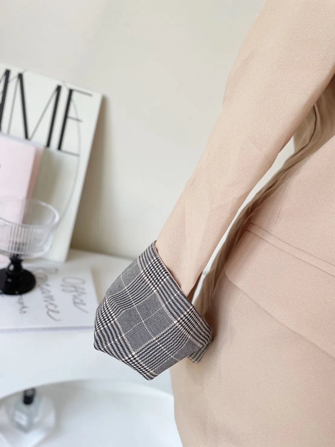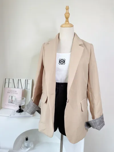 正韓貴貴家 格紋袖口西裝外套 (奶茶)