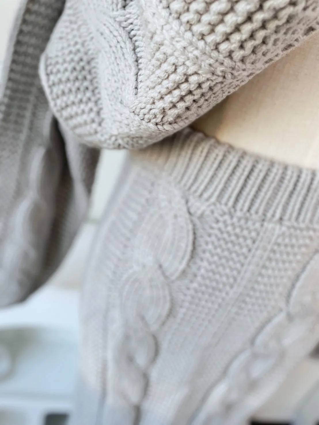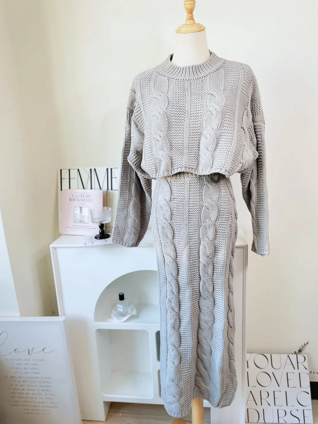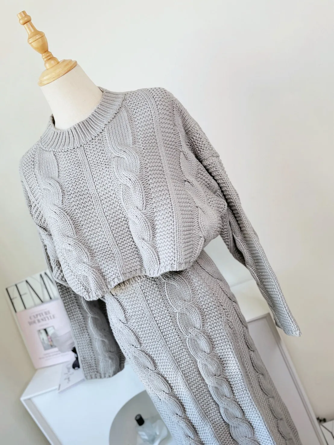 厚磅麻花針織上衣+半裙兩件式套裝(灰)