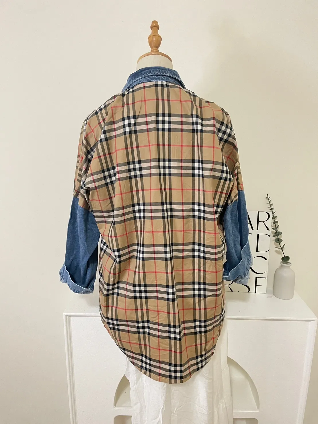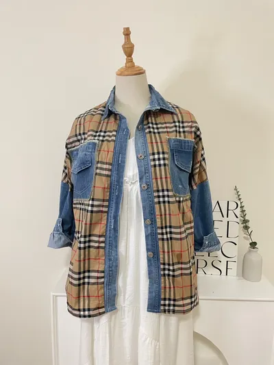 牛仔拼接英倫格紋造型襯衫(可當外套)