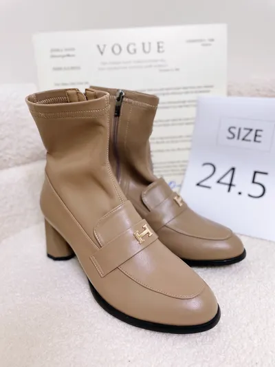 正韓 質感H金扣皮革側拉鍊踝靴 (卡其)