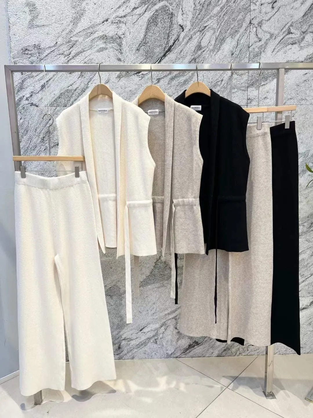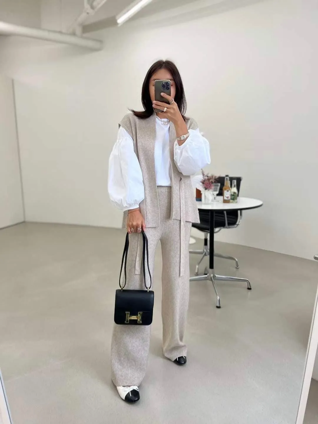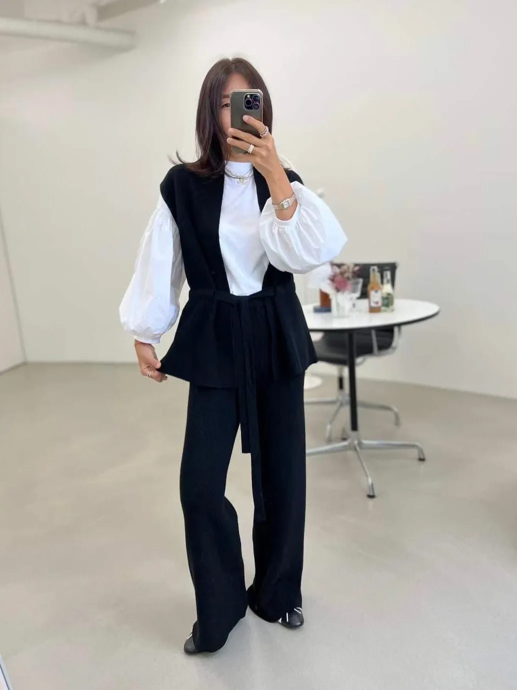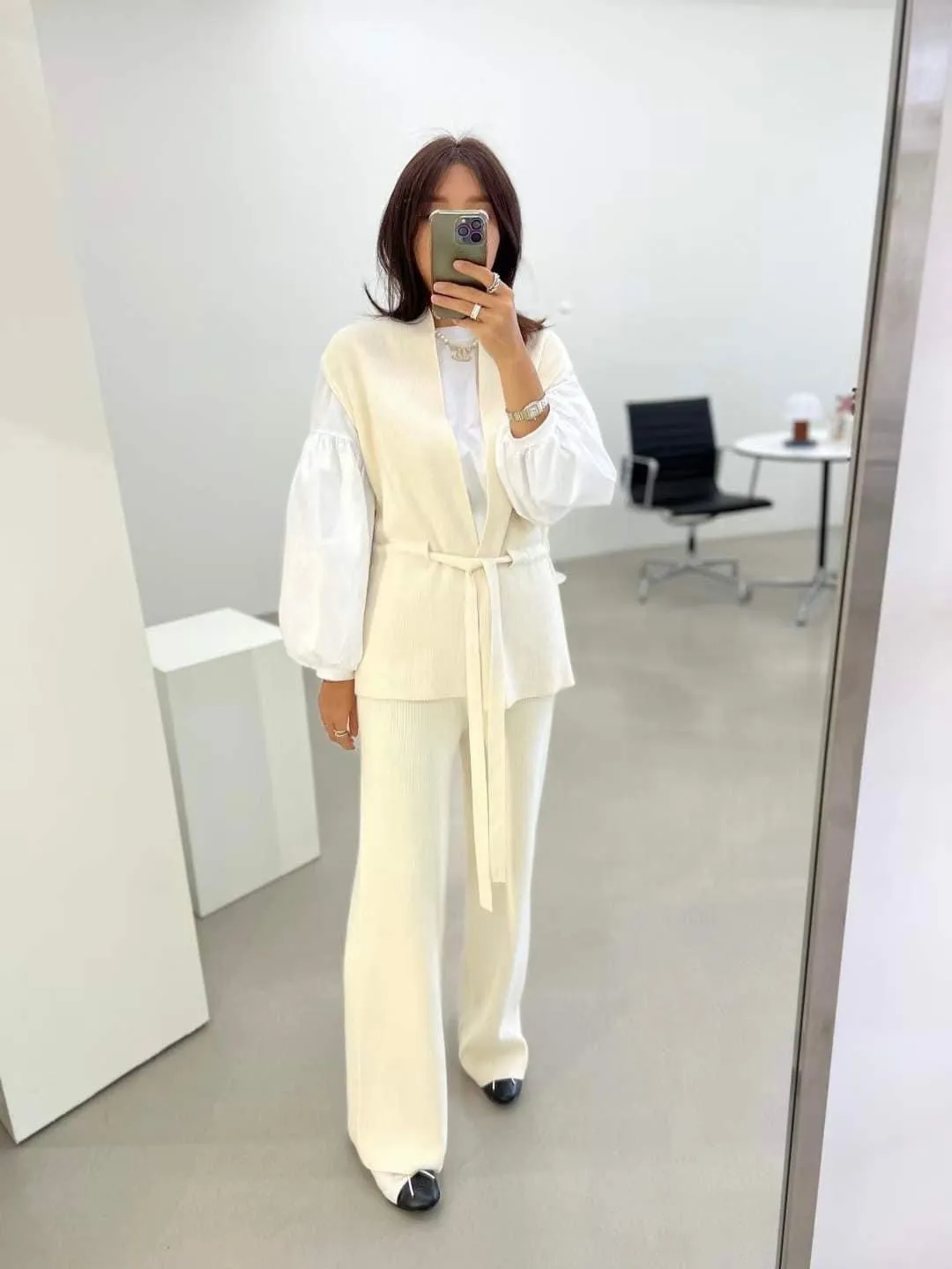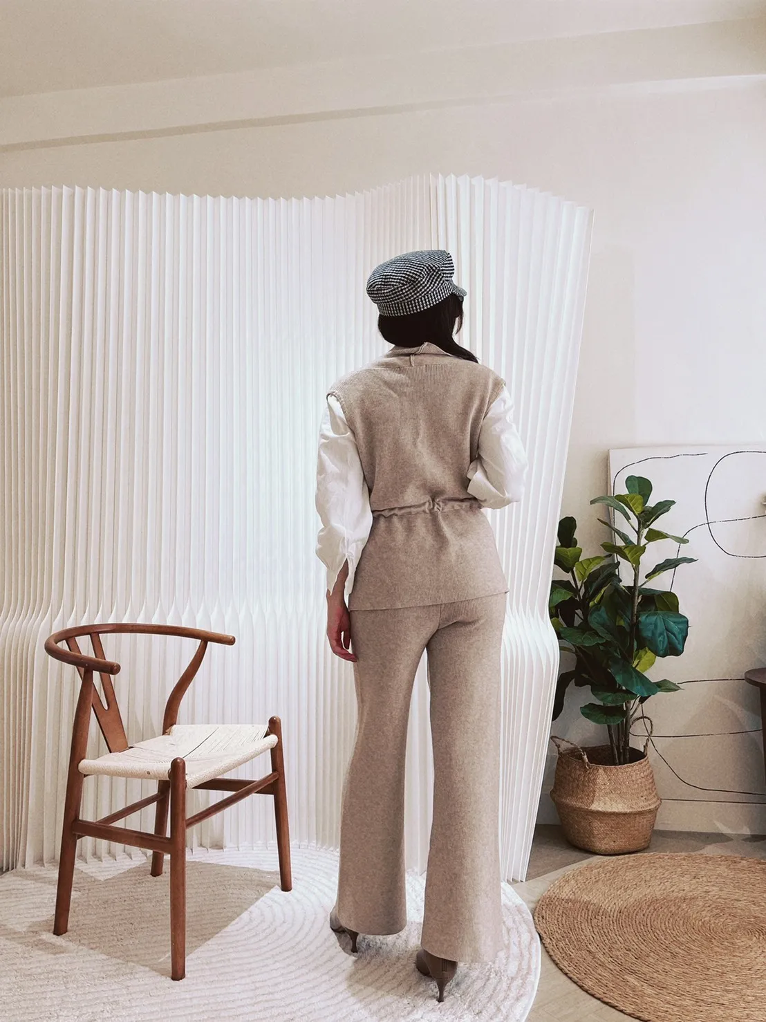 正韓 內斂品味高級質感針織兩件式套裝(綁帶外罩背心+長褲)