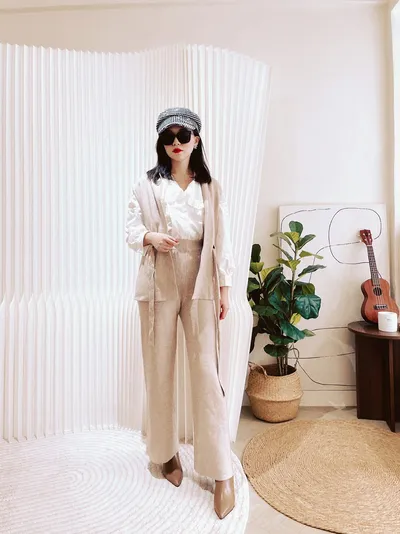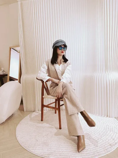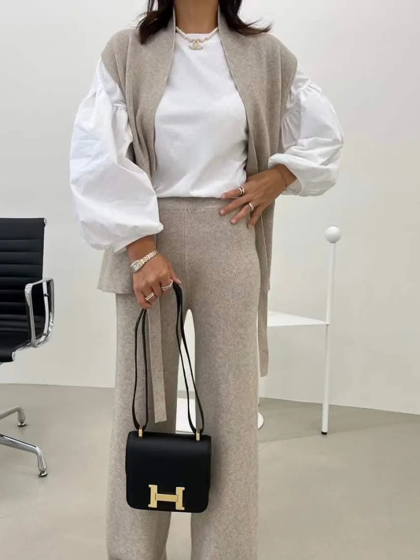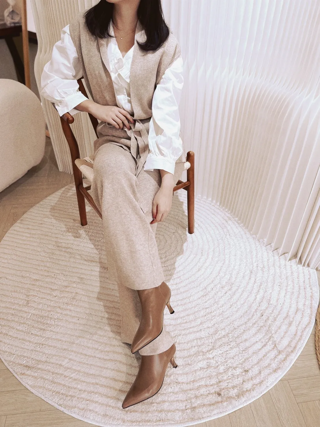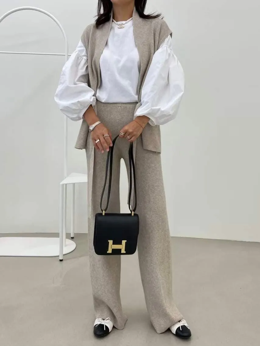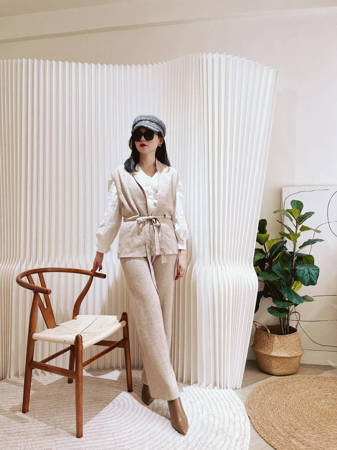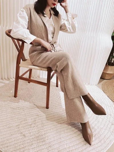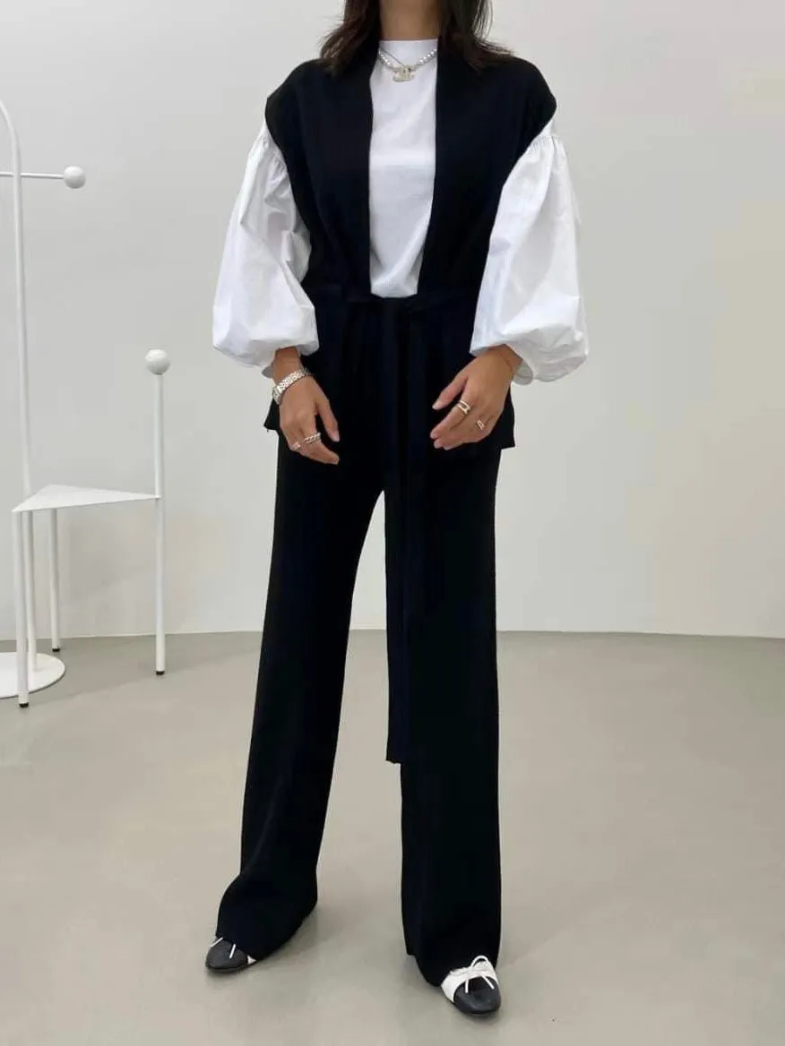 正韓 內斂品味高級質感針織兩件式套裝(綁帶外罩背心+長褲)